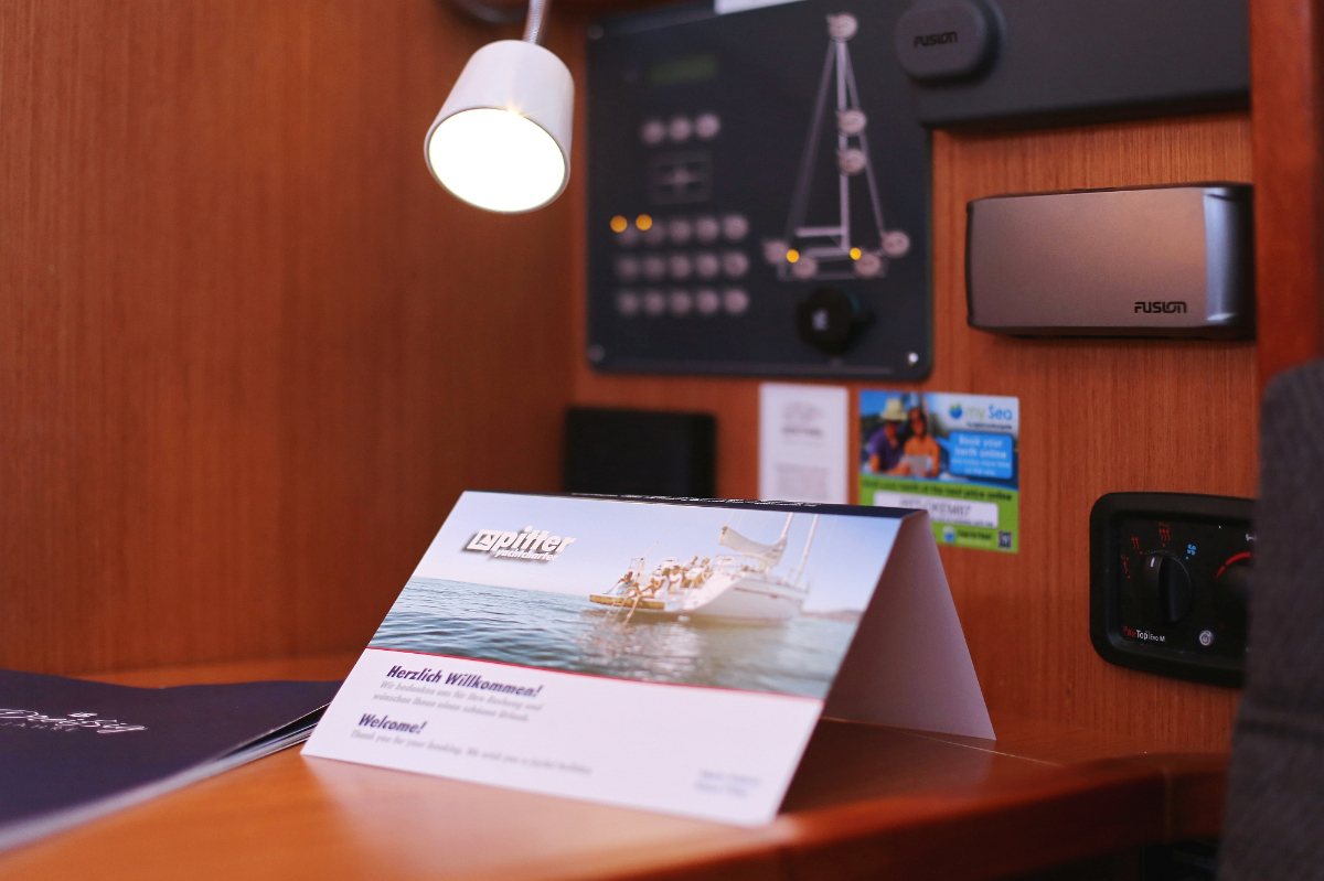| Inside | Borduhr, Dusche, FUSION Sound System, Heizung, Inverter 12V/220V, Kühlschrank, Ladegerät, Luftpumpe für Beiboot, Pantryausstattung, Radio mit CD und Bluetooth, Warmwasser |