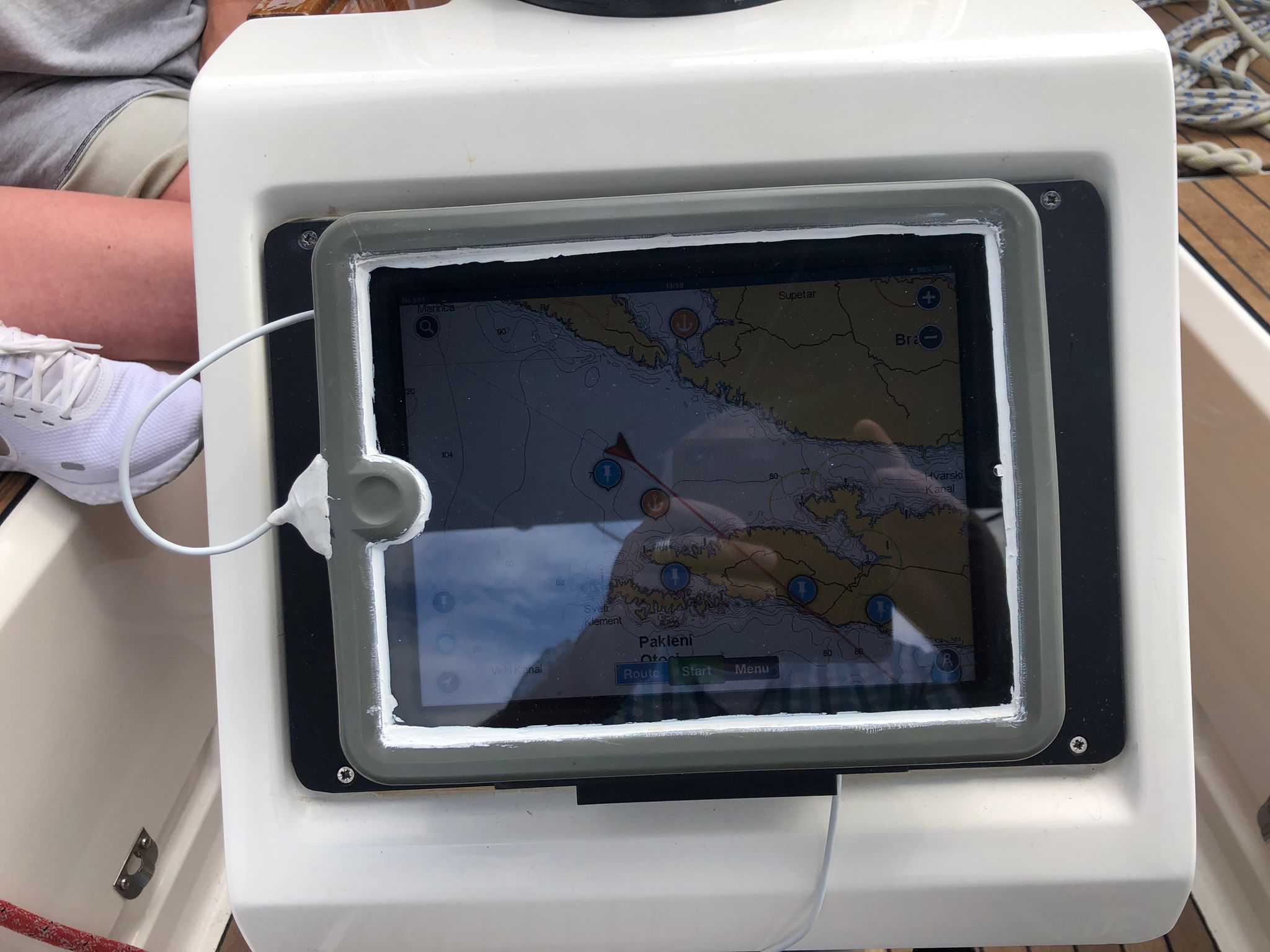 Laut Inventarliste sollte das Boot einen GPS Plotter an Board haben. Es gab jedoch ein iPad mit der Navionics Boating App. Das Abonnement der Karten war abgelaufen. Während der Fahrt hat das iPad andauernd den Fix verloren, ist wegen Überhitzung mehrfach komplett ausgefallen, und war während eines Regentages gar nicht benutzbar (Wasser auf dem Touch Screen). Dank der vorhandenen Papierkarten, konnte ich die Navigation mittels Kreuzpeilung wieder mal ausgiebig trainieren.
