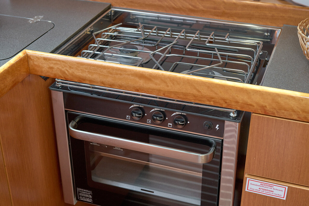 | Inside | Borduhr, Fön, Gasherd mit Backofen, Inverter 12V/220V, Kühlschrank, Ladegerät, Luftpumpe für Beiboot, Pantryausstattung, Radio mit CD/MP3/USB, Warmwasser, WC (elektr.) |