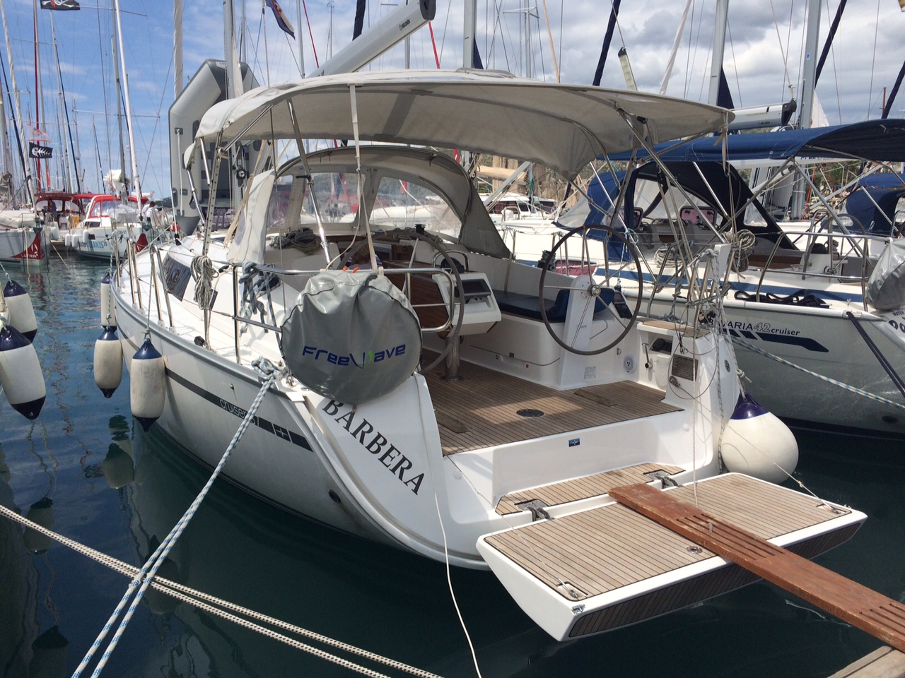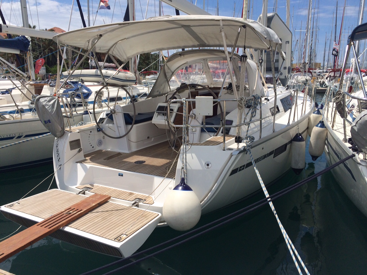 | Outside | Anker mit Kette, Biminitop, Bootshaken, Cockpitdusche, Cockpitlautsprecher, Cockpitpolster, Cockpittisch, Deckbürste, Dieselkanister , elektr. Ankerwinsch, Fender, Festmacherleinen, Gangway, Kugelfender, Sprayhood, Wasserkanister , Wasserschlauch, Winschen |