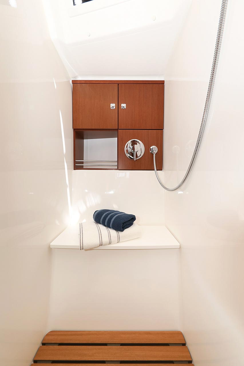 | Outside | 12 V-Anschluss, 220 V-Landanschluss, Anker mit Kette, Ankerwinsch, Badeplattform elektr., Biminitop, Bootshaken, Cockpitdusche, Cockpitlautsprecher, Cockpitpolster, Cockpittisch, Dieselkanister , elektr. Ankerwinsch, Fender, Festmacherleinen, Gangway, Kugelfender, Kunststoff-Eimer (Pütz), Solaranlage, Sprayhood, Teak im Cockpit, Unterwasserbeleuchtung, Wantenschneider, Wasserkanister , Wasserschlauch |