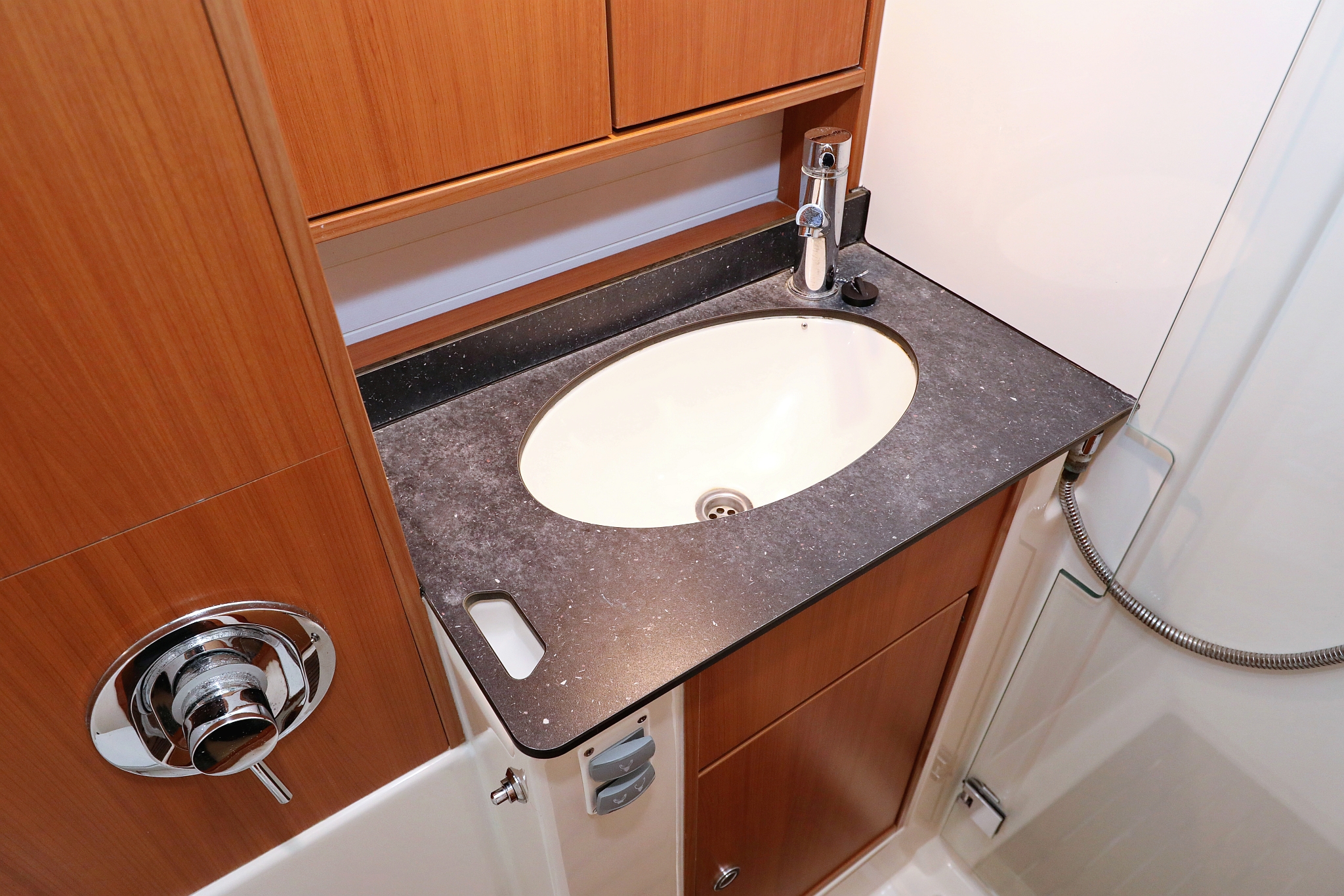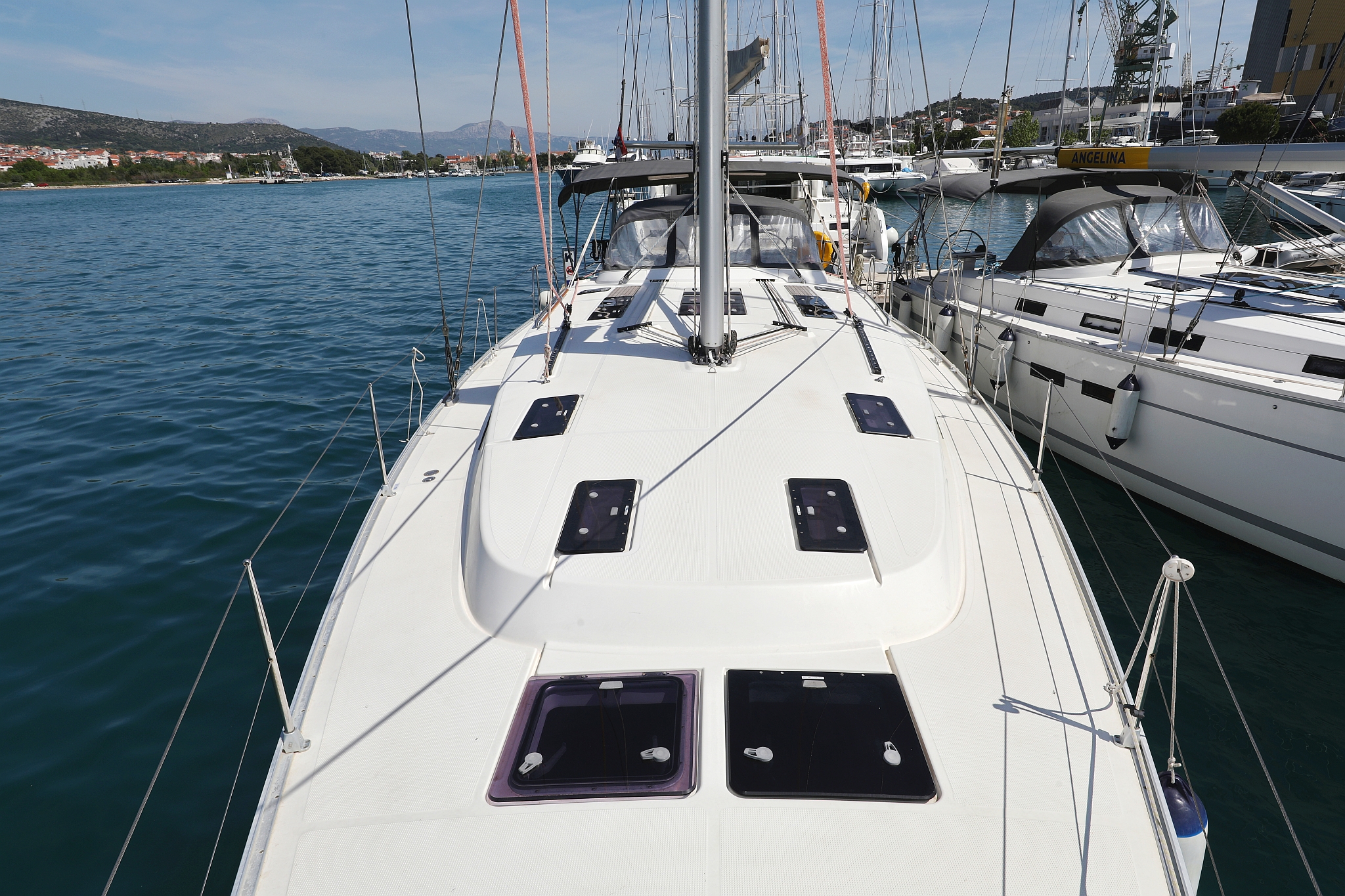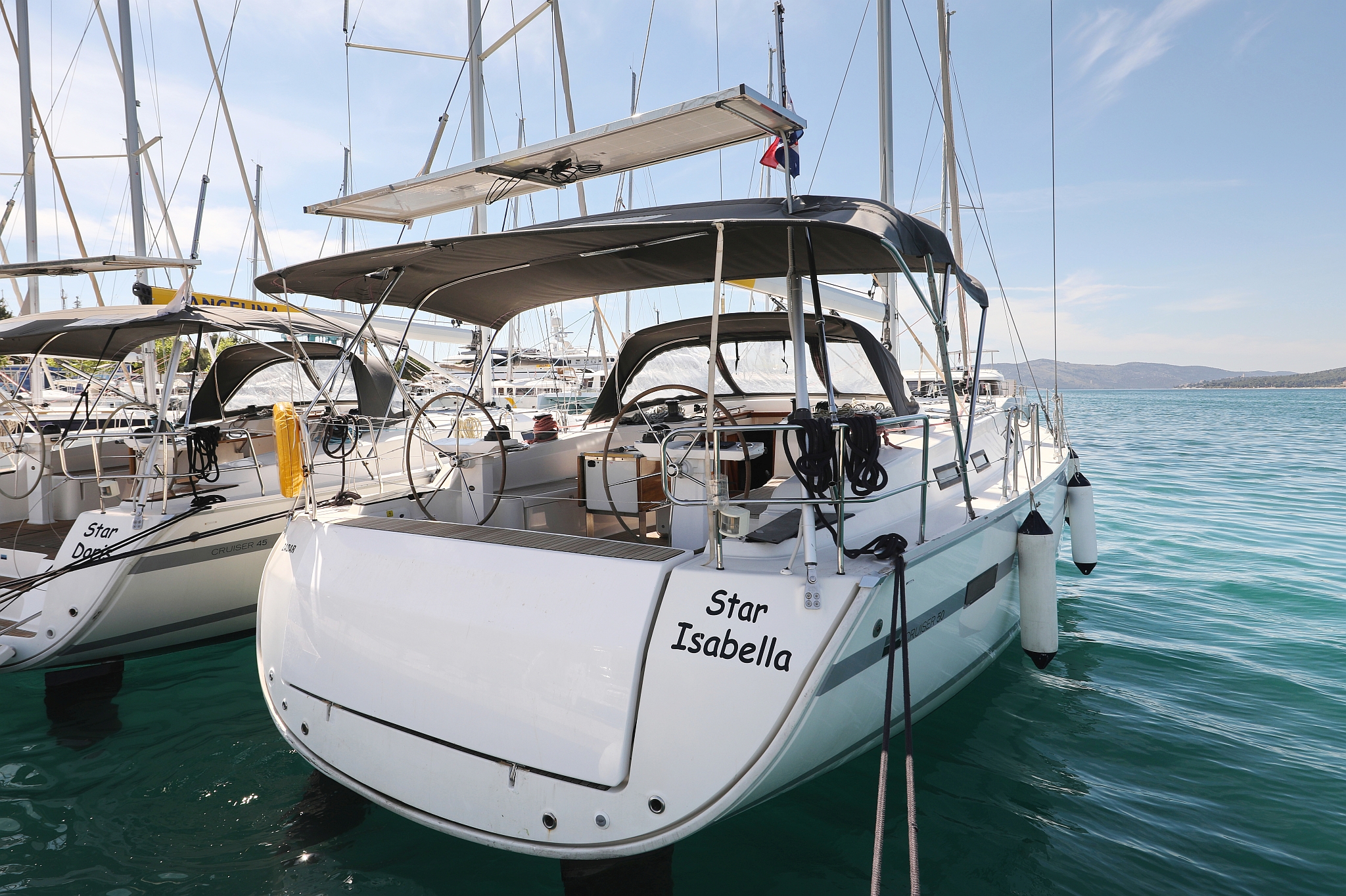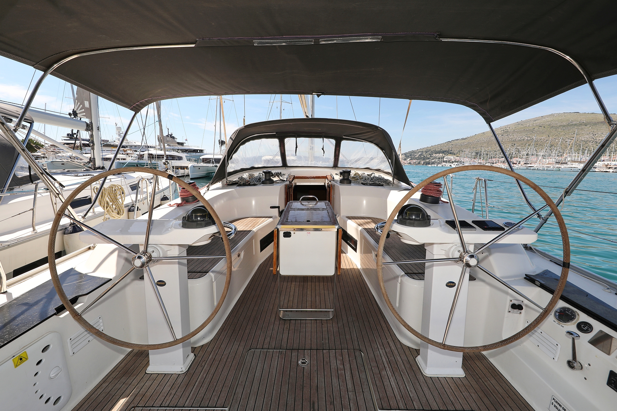 | Outside | 220 V-Landanschluss, Anker mit Kette, Badeplattform, Biminitop, Cockpitdusche, Cockpitlautsprecher, Cockpitpolster, Cockpittisch, elektr. Ankerwinsch, Fender, Gangway, Kugelfender, Solaranlage, Sprayhood, Teak im Cockpit, Winschen |