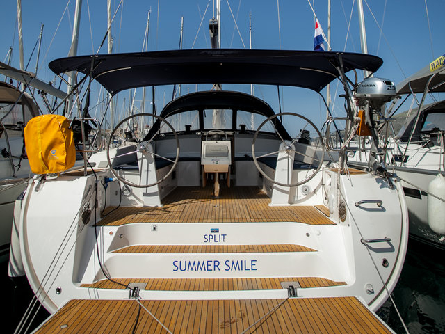 | Outside | Badeplattform, Biminitop, Cockpitdusche, Cockpitpolster, Cockpittisch, elektr. Ankerwinsch, Sprayhood, Teak im Cockpit |