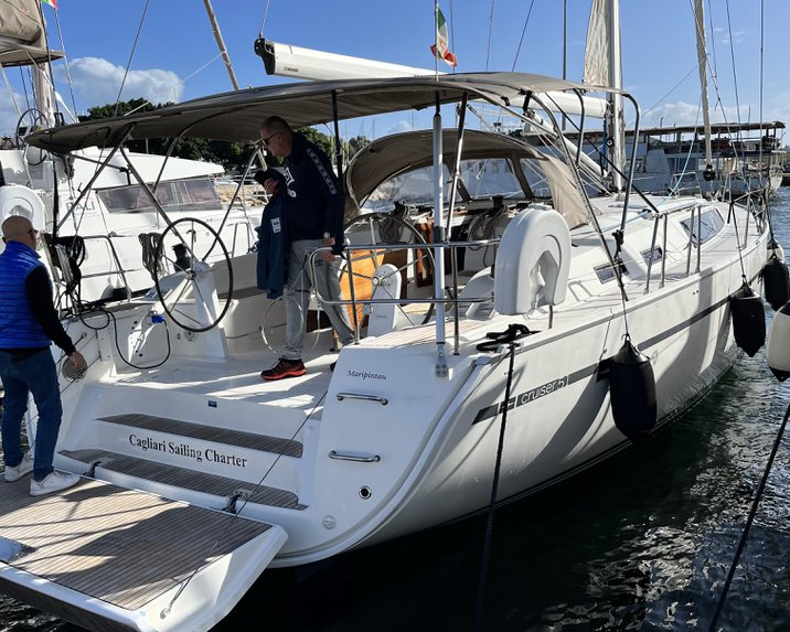 | Outside | Anker mit Kette, Anker mit Seil, Biminitop, Bootshaken, Cockpitdusche, Cockpitlautsprecher, Cockpitpolster, Cockpittisch, Deckbürste, Dieselkanister , elektr. Ankerwinsch, Faltsteuerrad, Fender, Festmacherleinen, Gangway, Kugelfender, Solaranlage, Sprayhood, Wasserschlauch, Winschen |