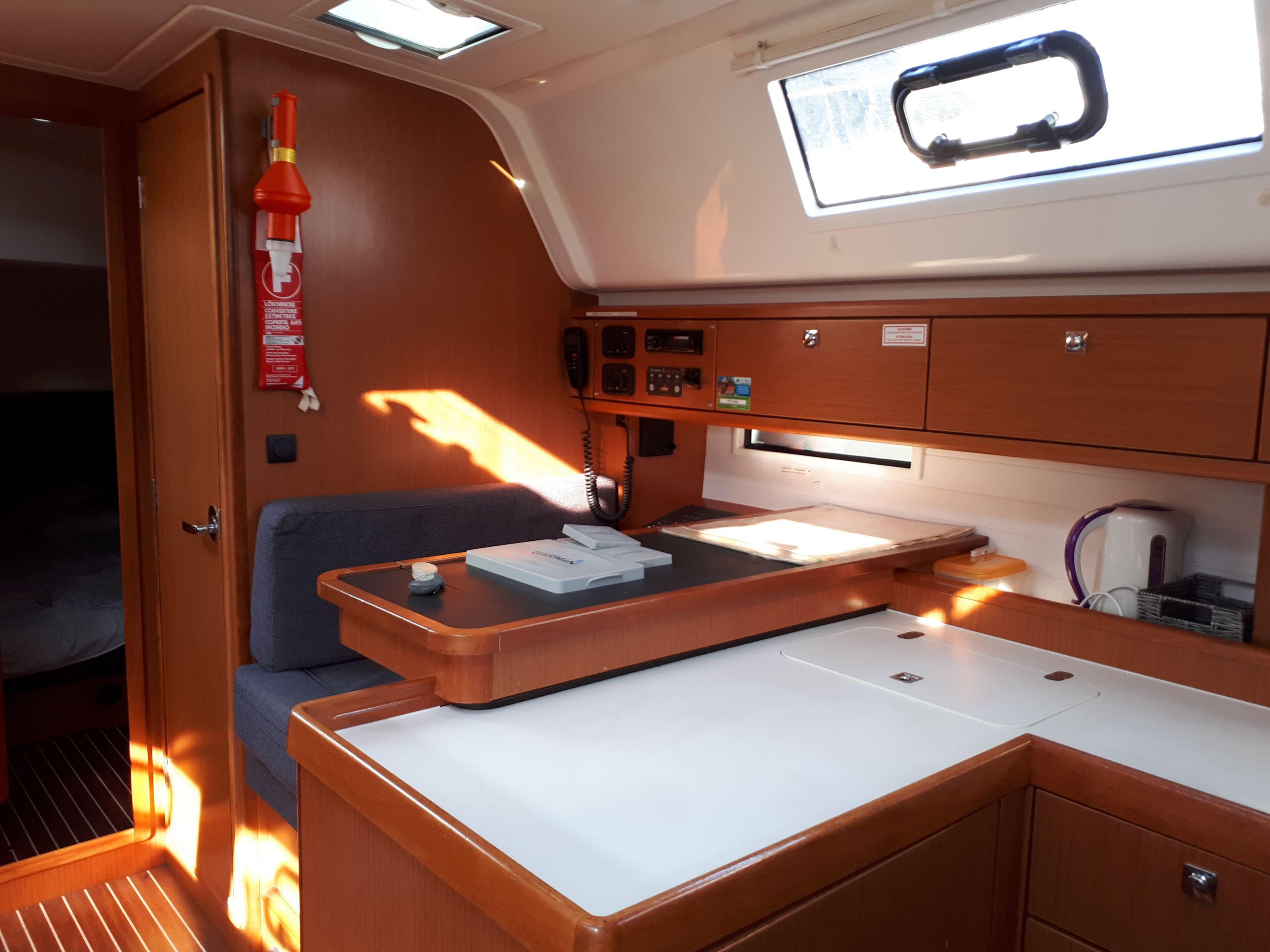 | Navigation | Barometer, Fernglas, Fernglas mit Peilkompass, GPS mit Kartenplotter im Cockpit, Hafenhandbücher, Handpeilkompass, Navigationsbesteck, Seekarten, Tridata (Log, Echolot, Windm.) |