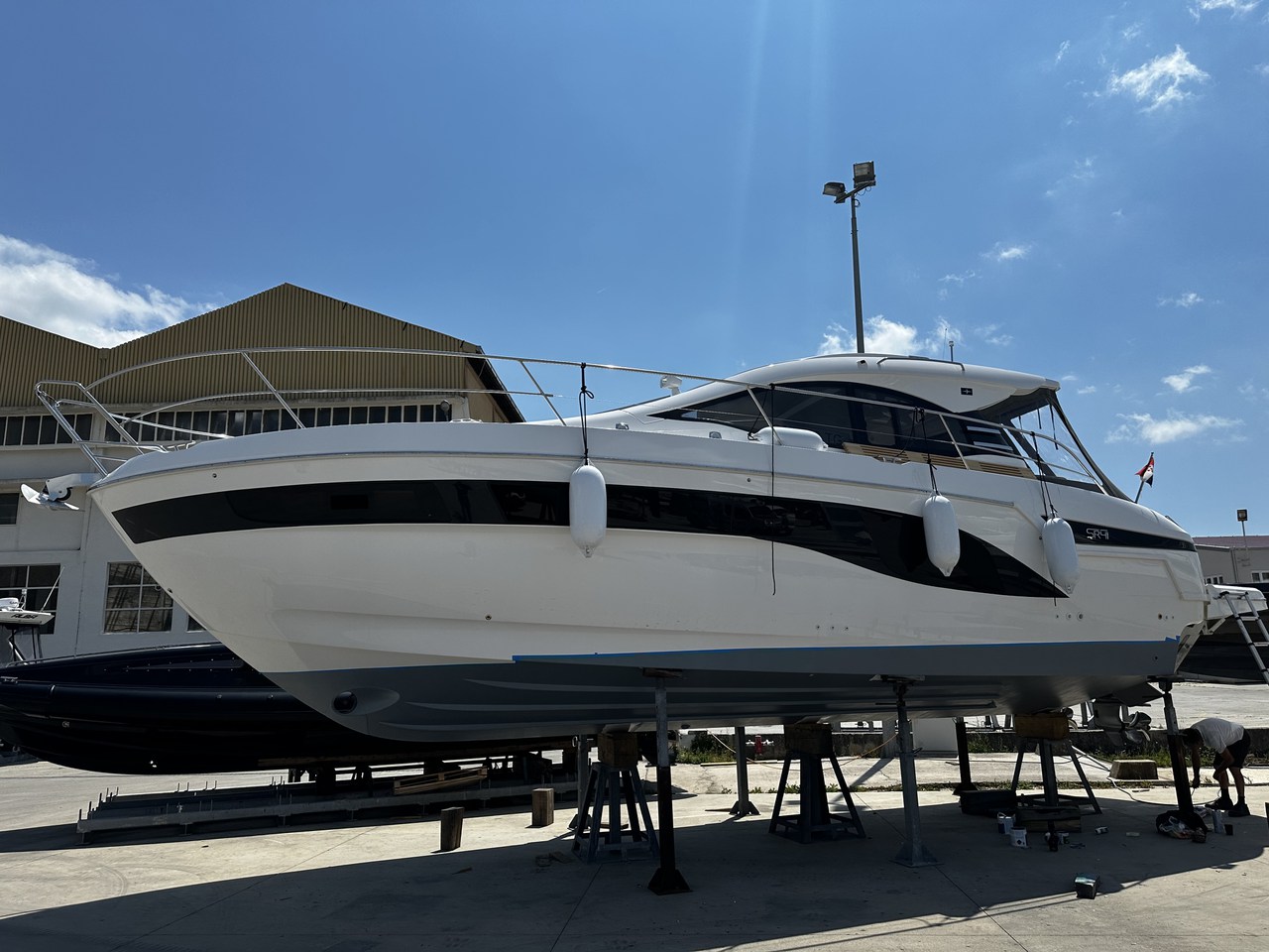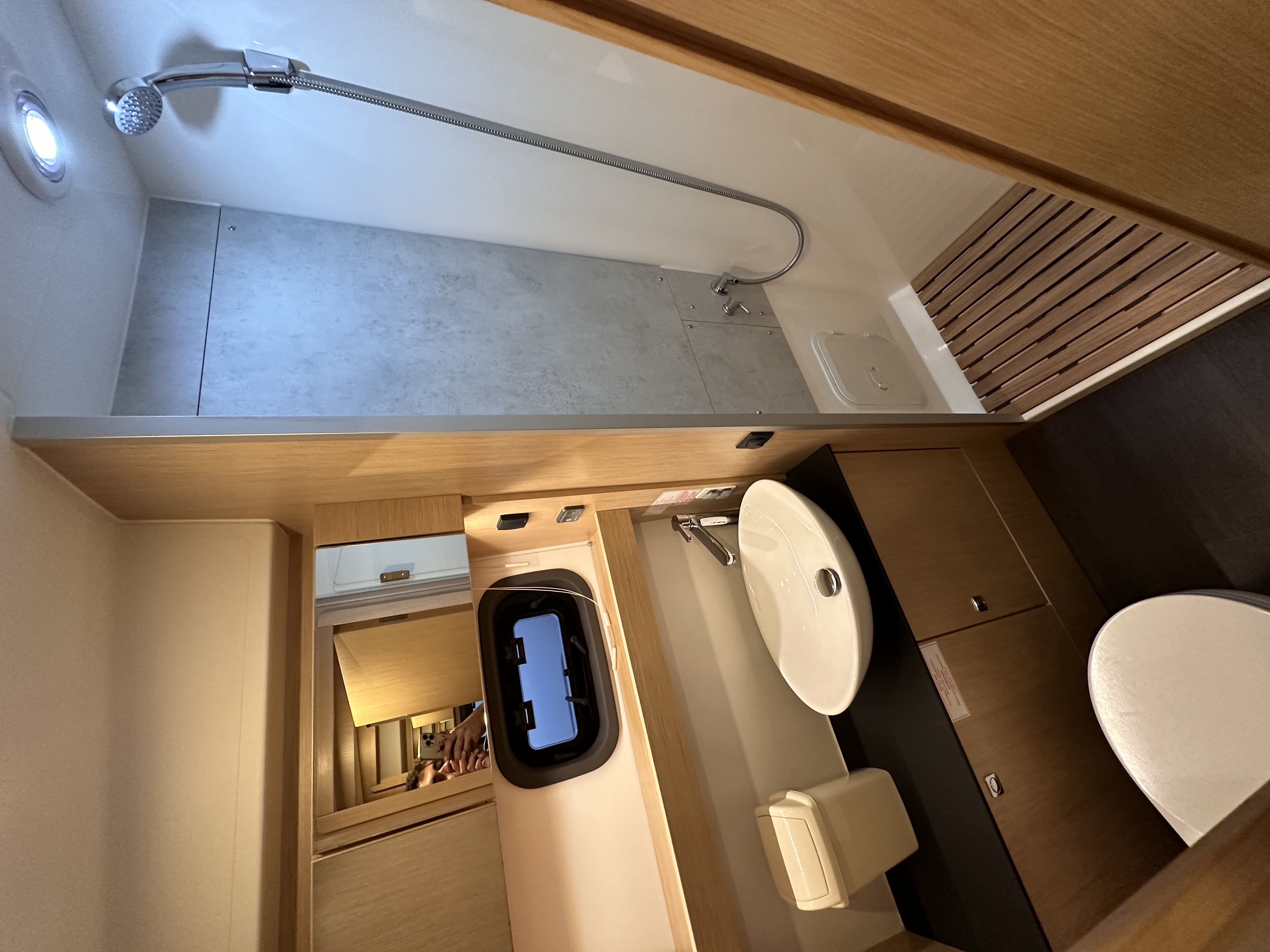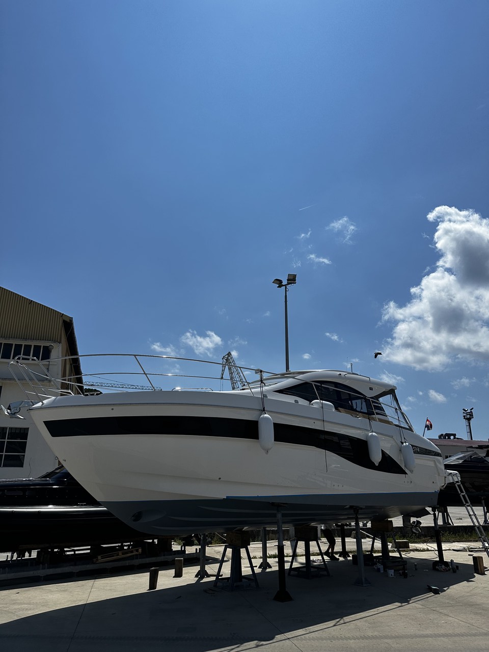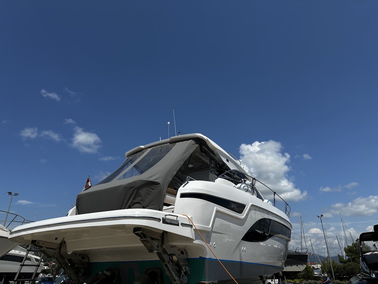 | Outside | Badeleiter, Badeplattform (hydr.), Biminitop, Cockpitdusche, Cockpittisch, Fender, Grill, hydraul. Gangway, Sonnendeck, Sprayhood, Unterwasserbeleuchtung, Wet Bar |