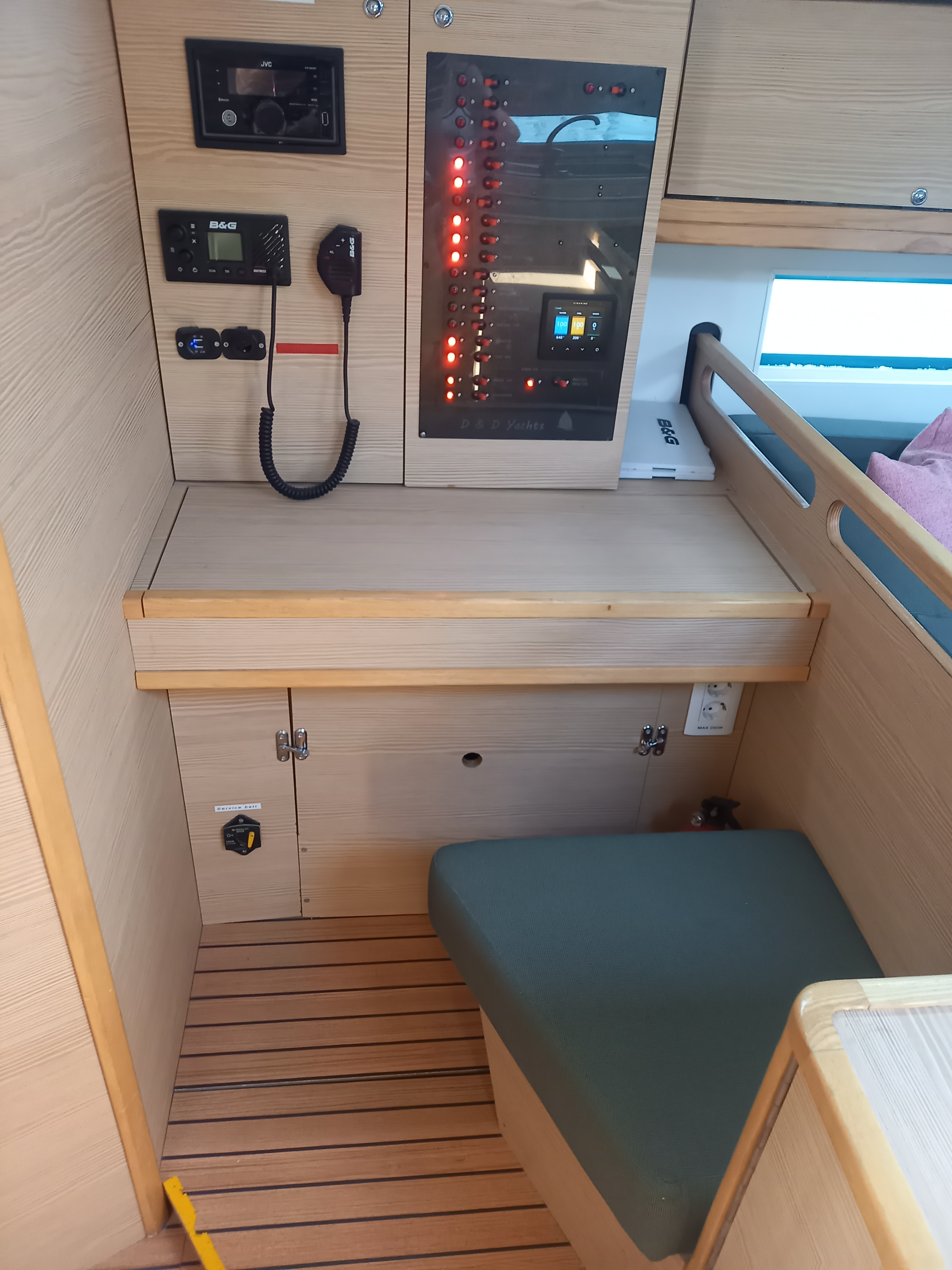 | Navigation | Barometer, Echolot, Fernglas, GPS mit Kartenplotter, Hafenhandbücher, Navigationsbesteck, Seekarten, Sumlog |