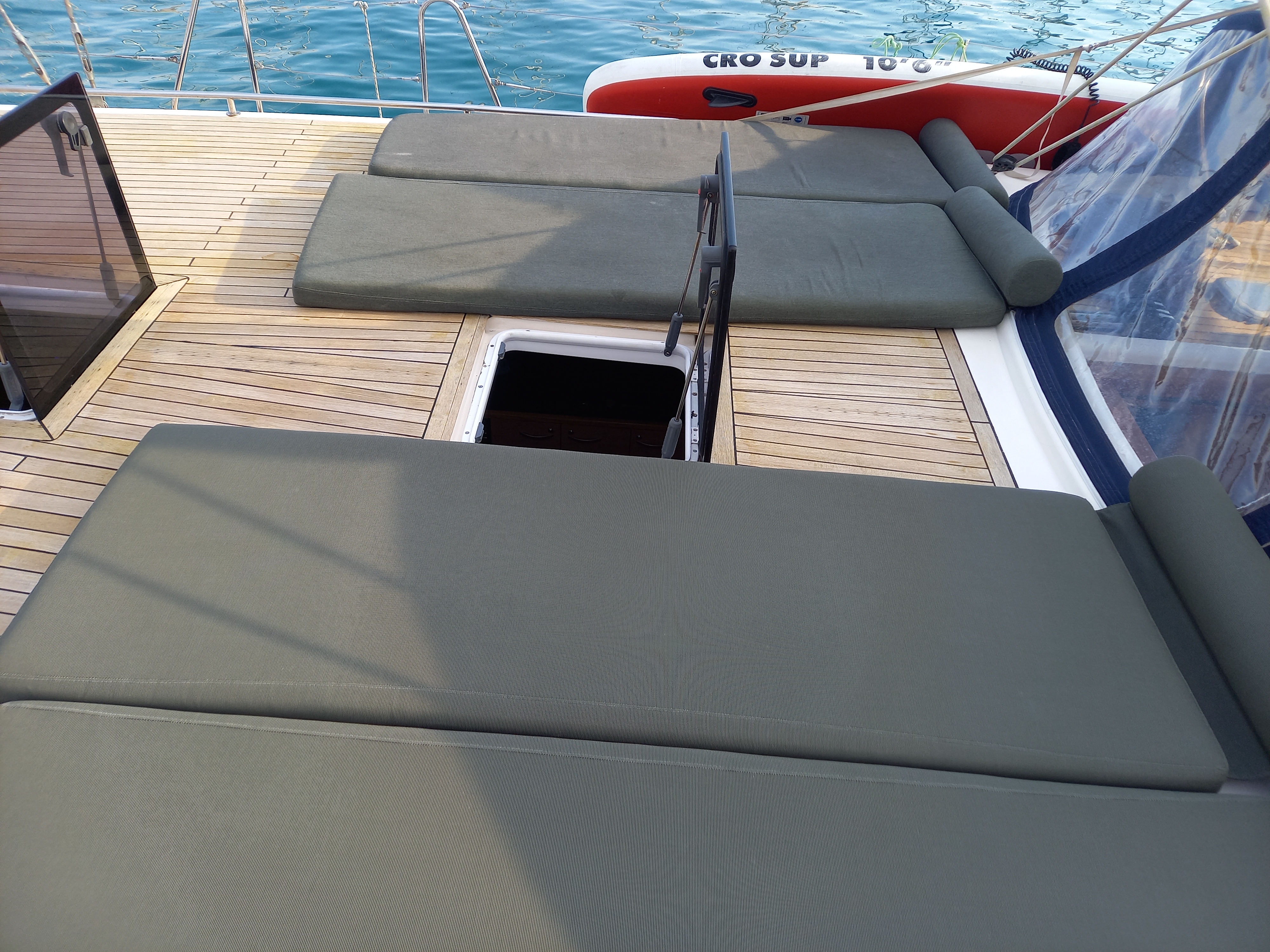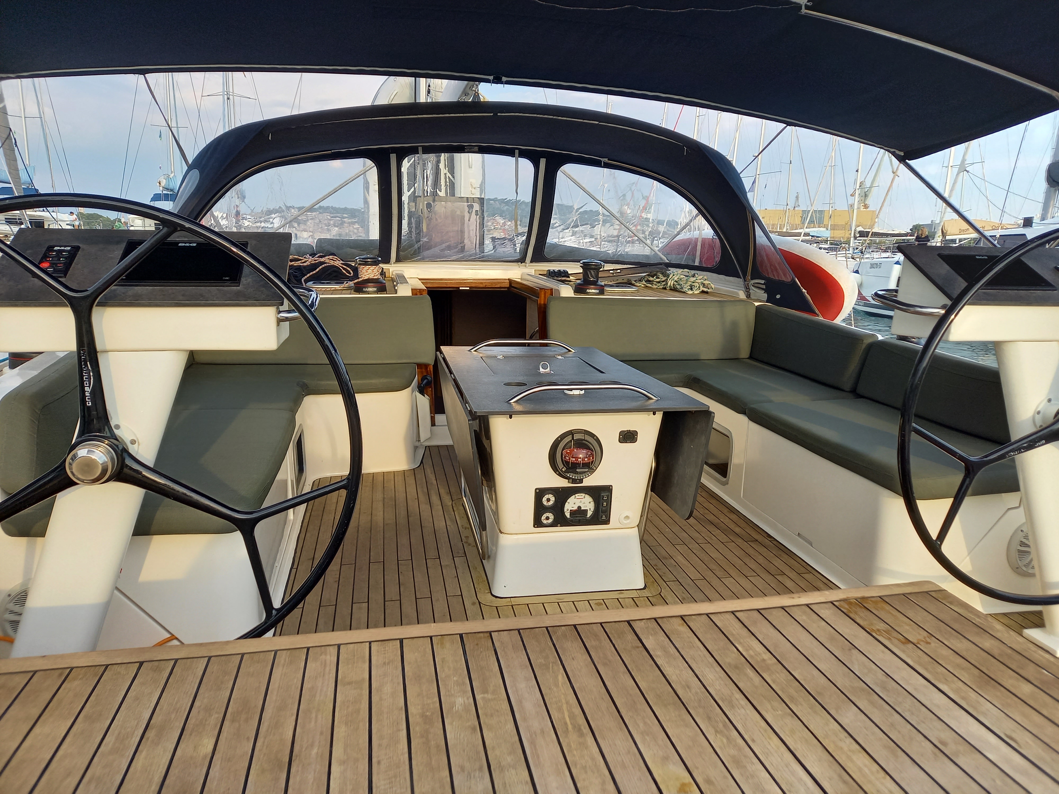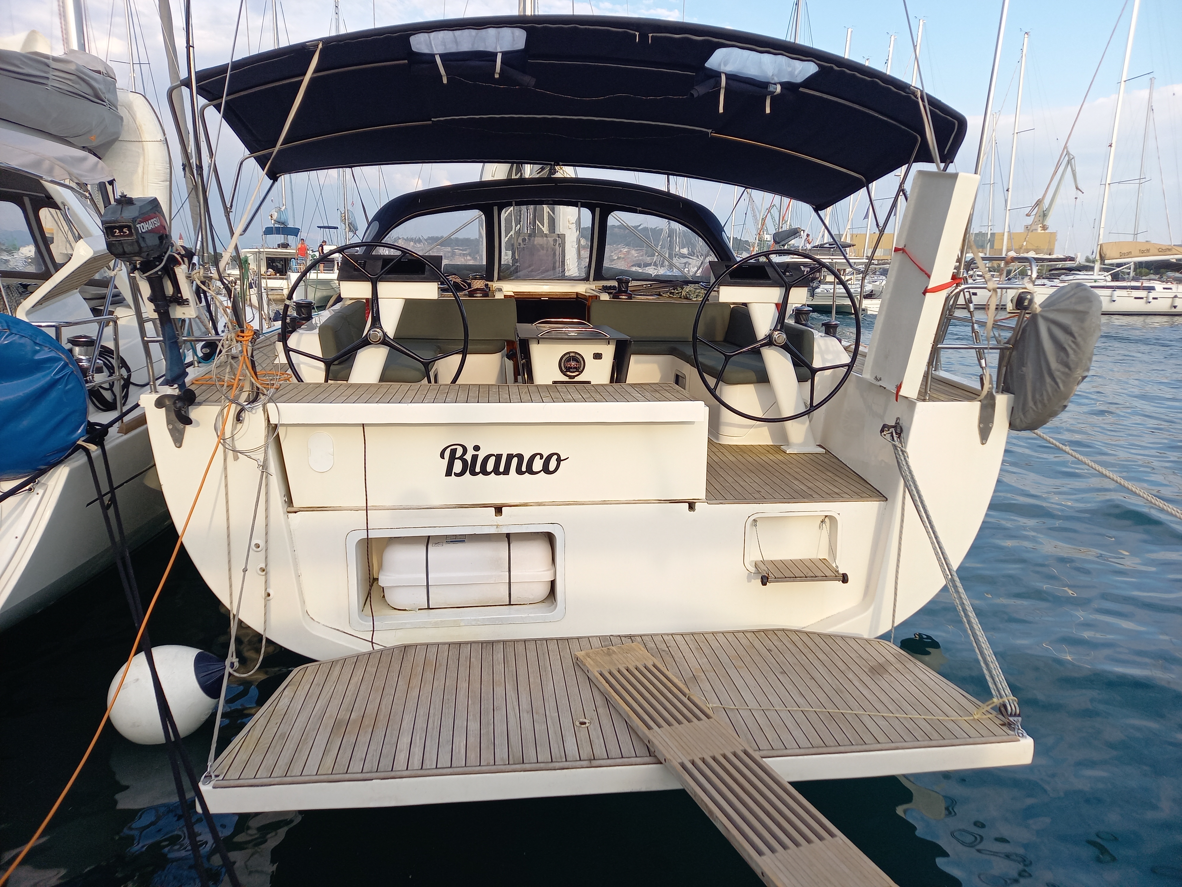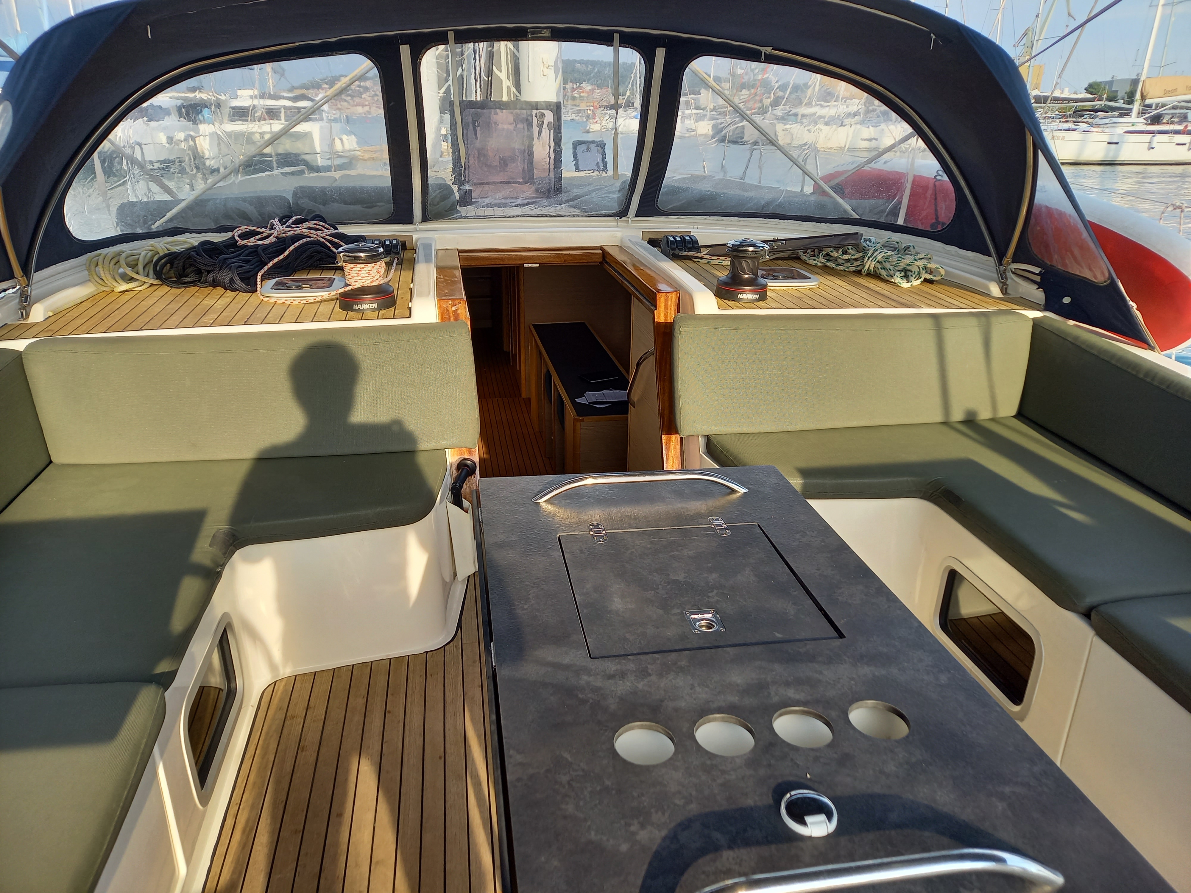 | Outside | 220 V-Landanschluss, Anker mit Kette, Anker mit Seil, Biminitop, Bootshaken, Cockpitdusche, Cockpitkühlschrank, Cockpitlautsprecher, Cockpitpolster, Cockpittisch, Deckbürste, Dieselkanister , elektr. Ankerwinsch, Fender, Festmacherleinen, Gangway, Grill, Kugelfender, Solaranlage, Sprayhood, Wasserkanister , Wasserschlauch, Winschen |