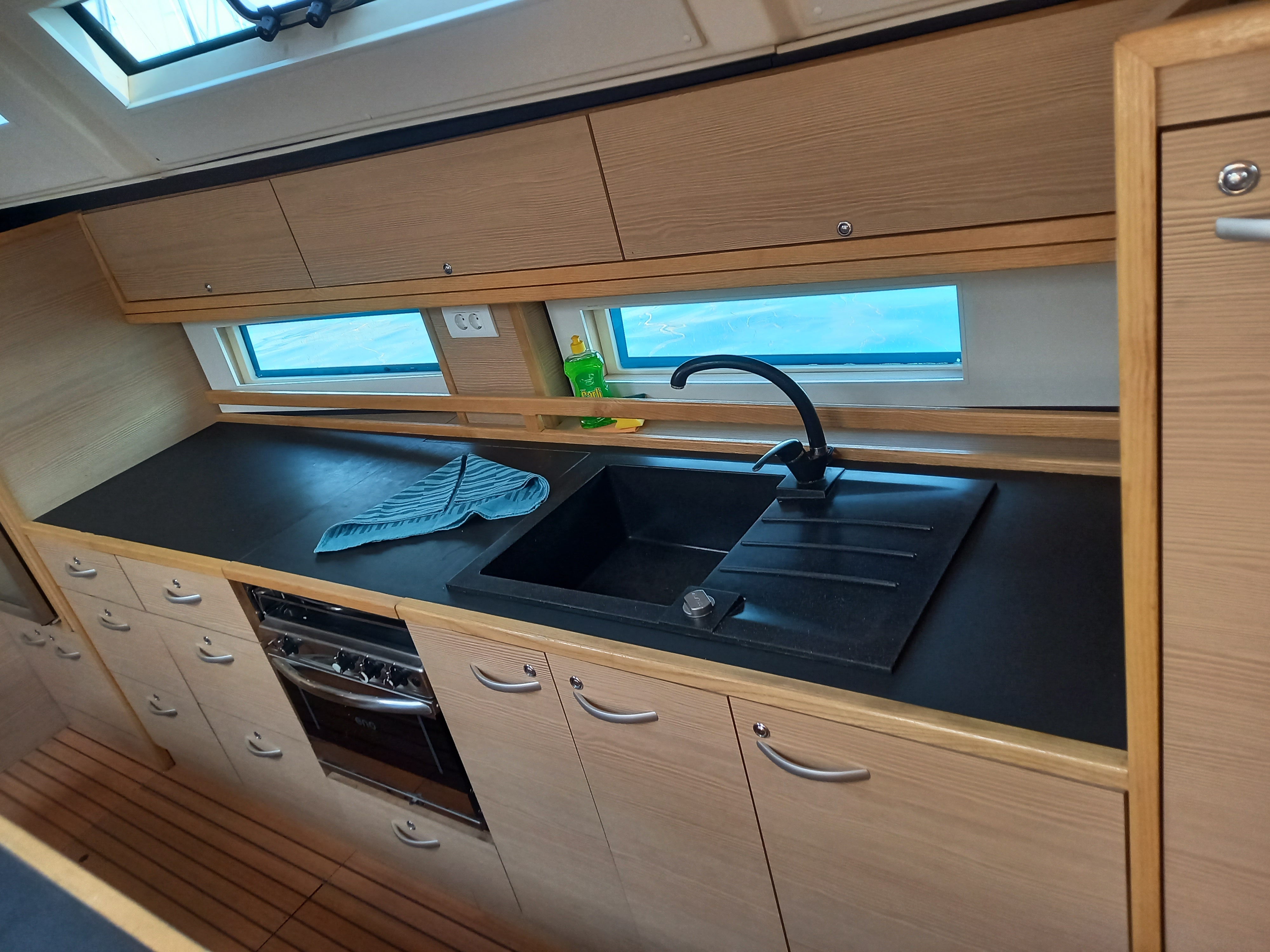 | Inside | Backofen, Besen und Kehrblech, Borduhr, Gasherd, Kleiderbügel, Kühlschrank mit Gefrierfach, Ladegerät, Luftpumpe für Beiboot, Pantryausstattung, Radio mit CD, Weinkühlschrank |