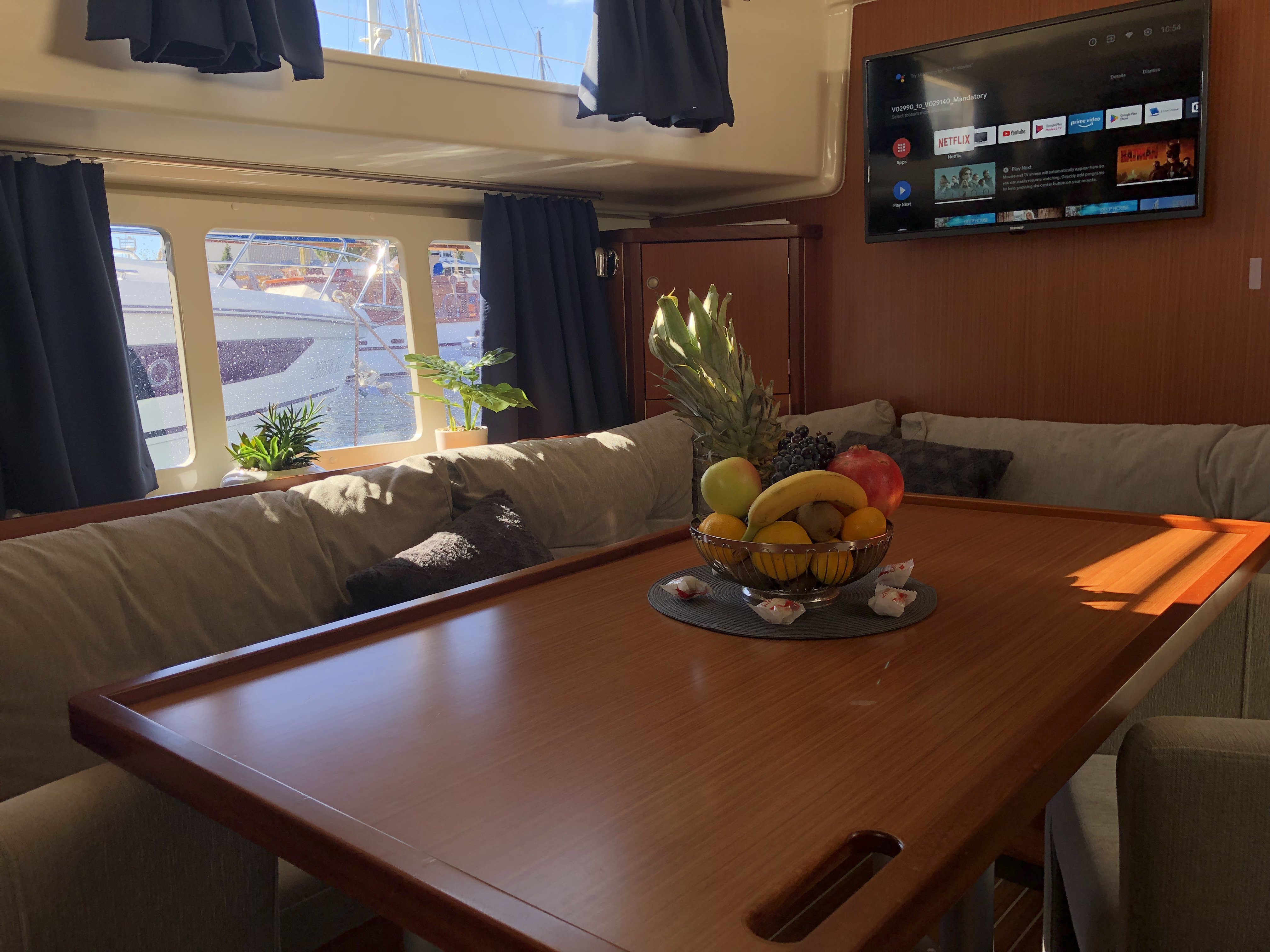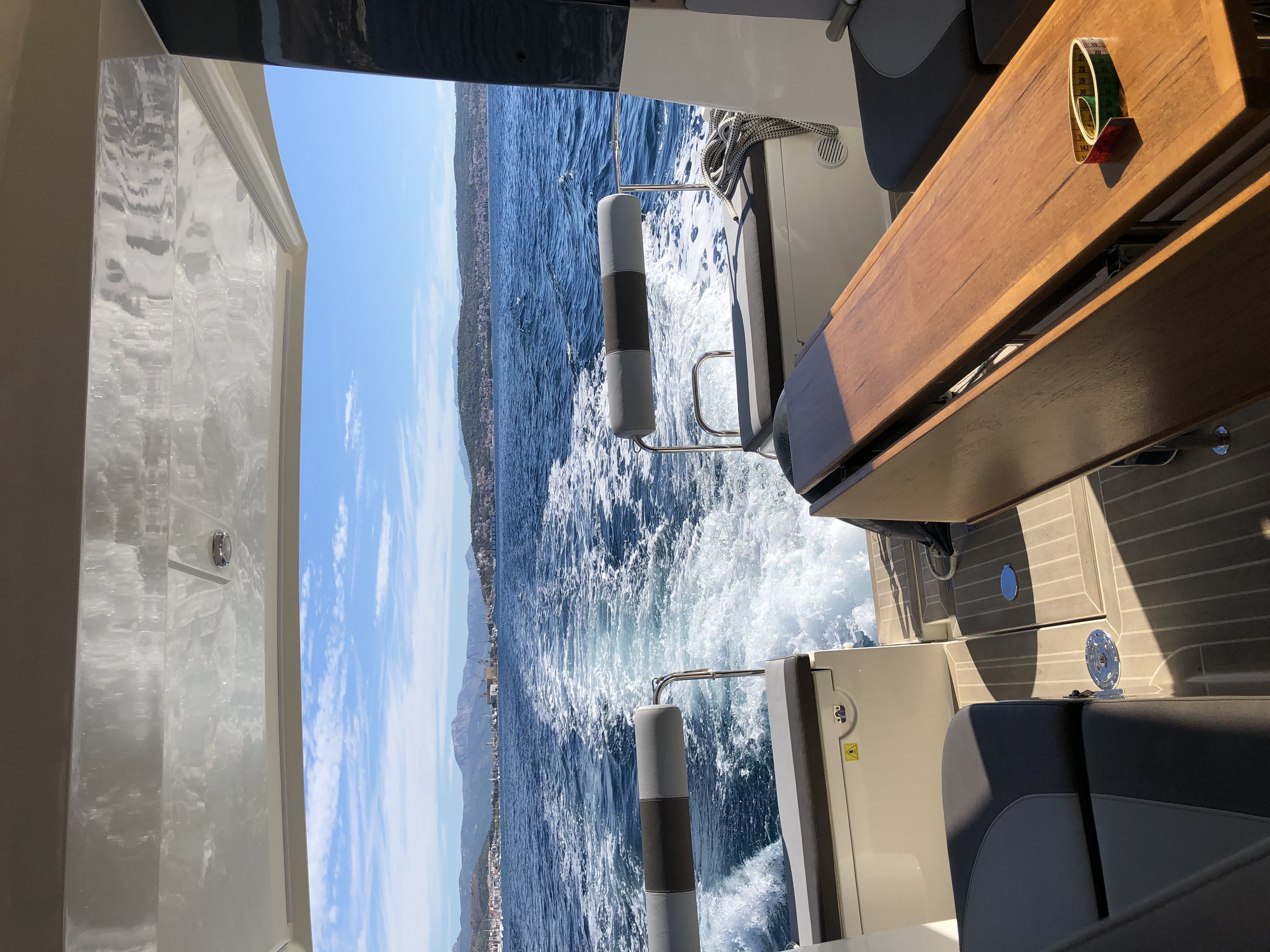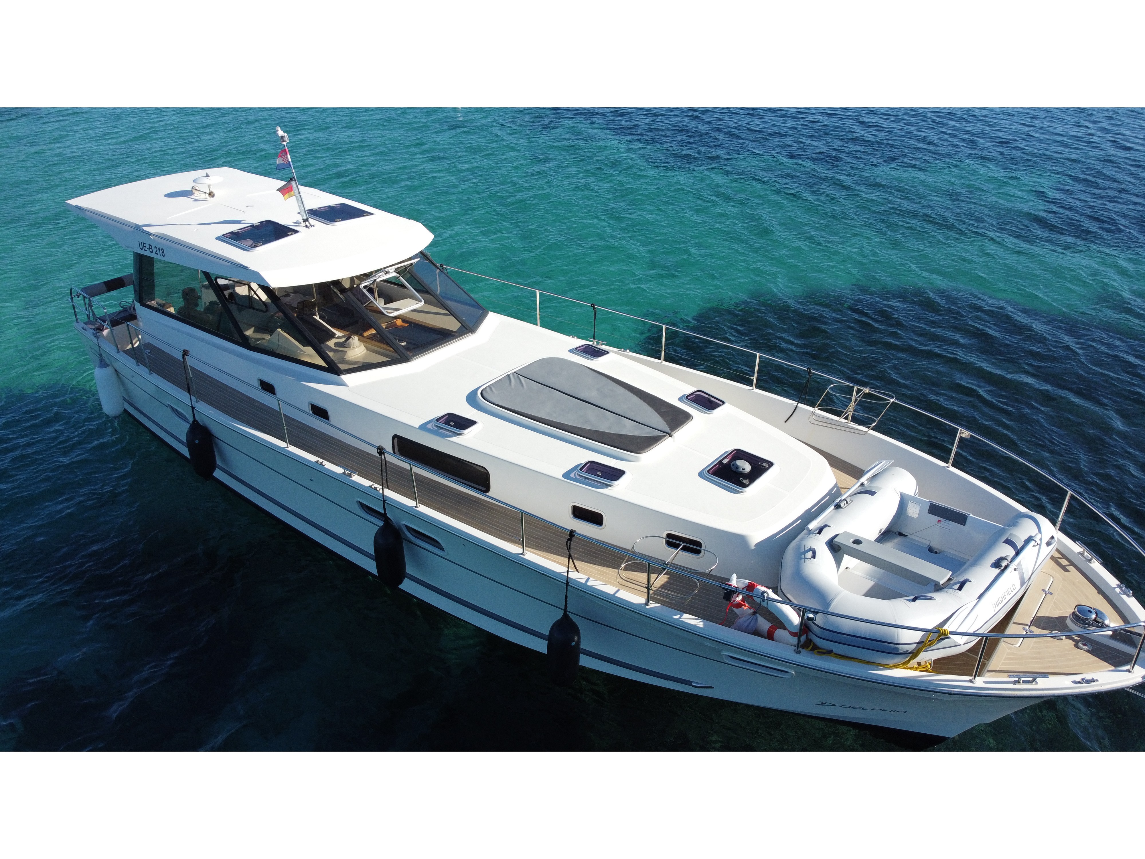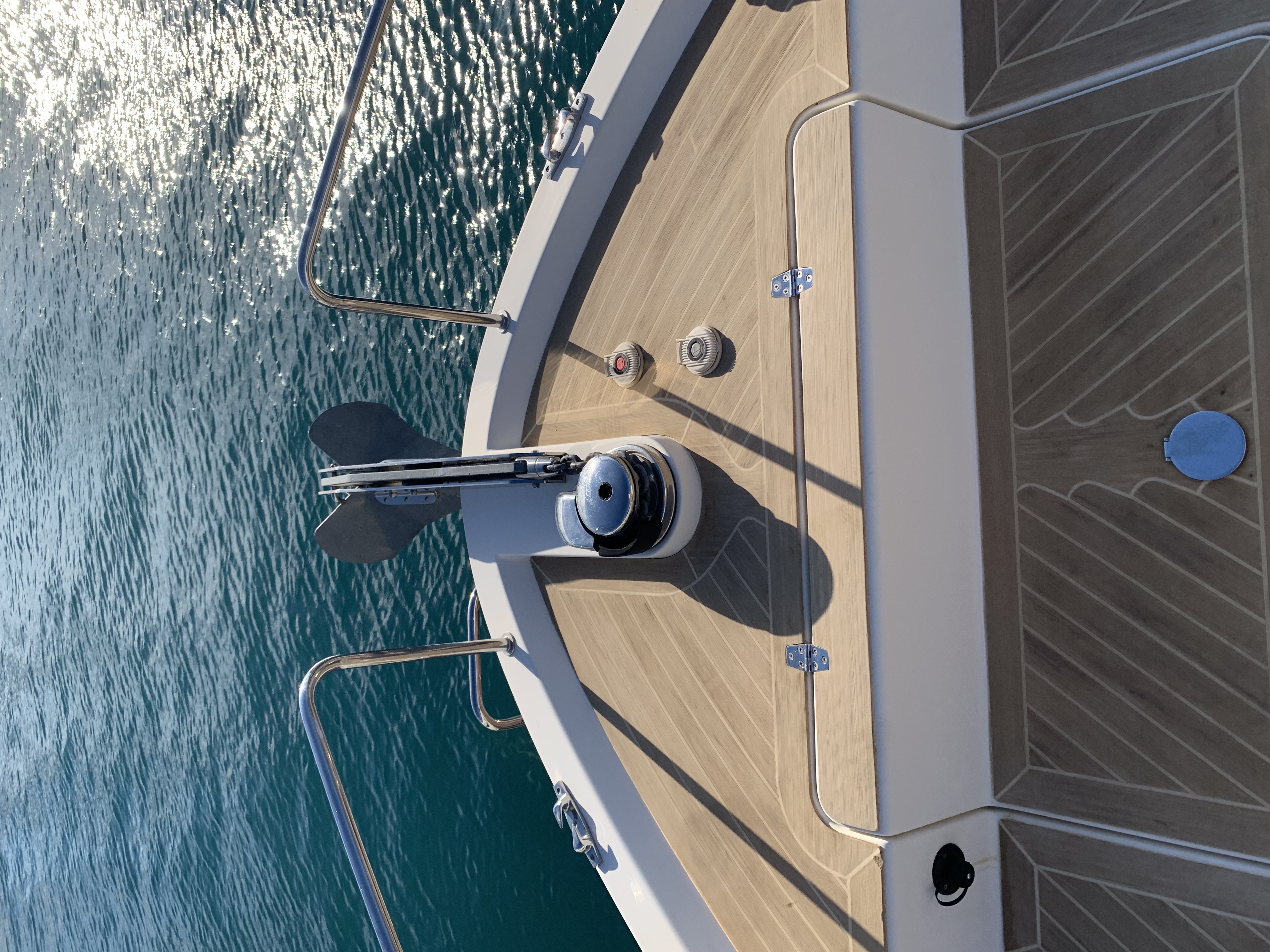 | Outside | 220 V-Landanschluss, Anker mit Kette, Ankerwinsch, Badeleiter, Cockpitdusche, Cockpitlautsprecher, Cockpittisch, Fender, Festmacherleinen, Gangway, Hardtop, Seereling, Sprayhood, Teak im Cockpit, Teakdeck |