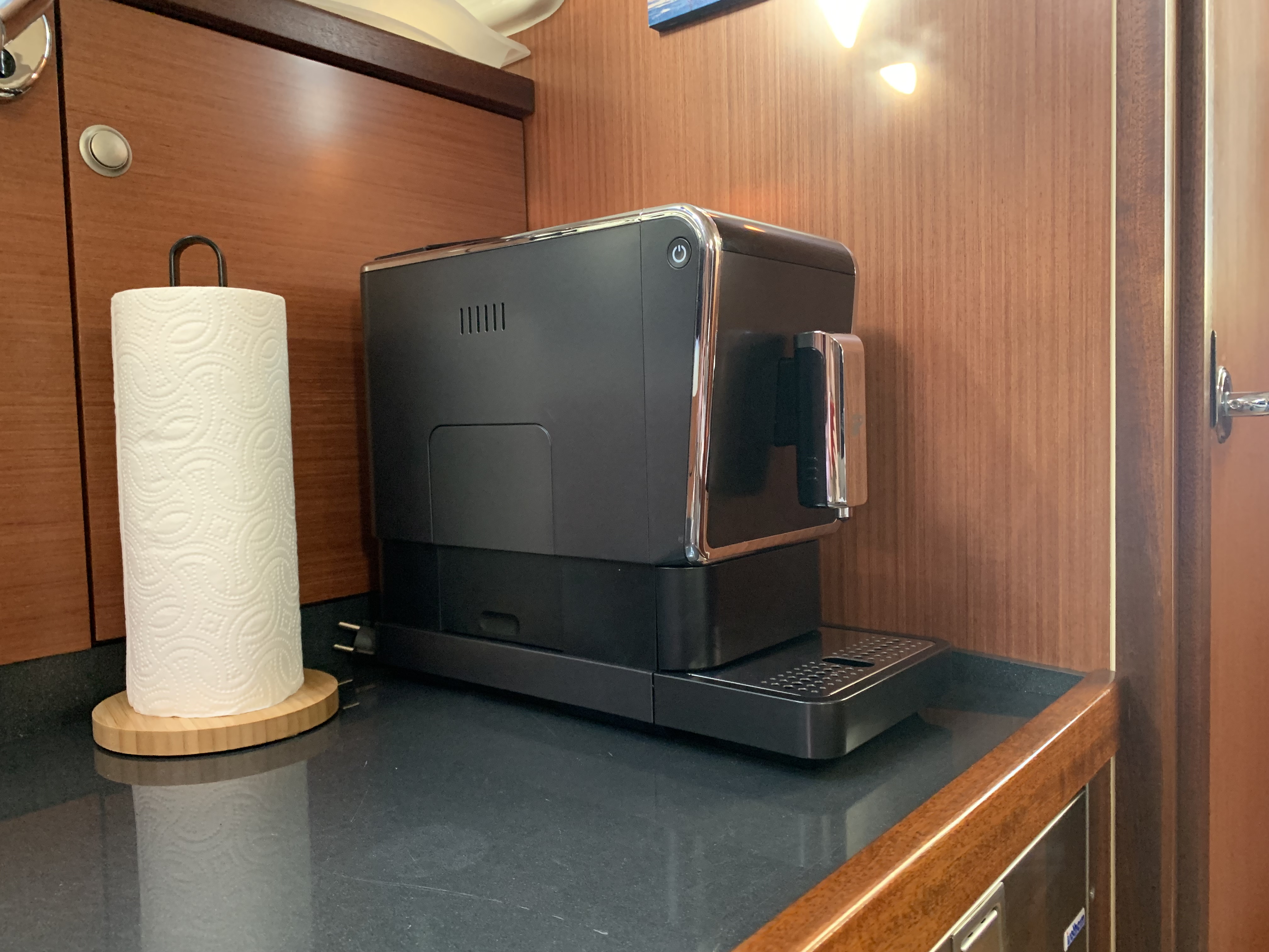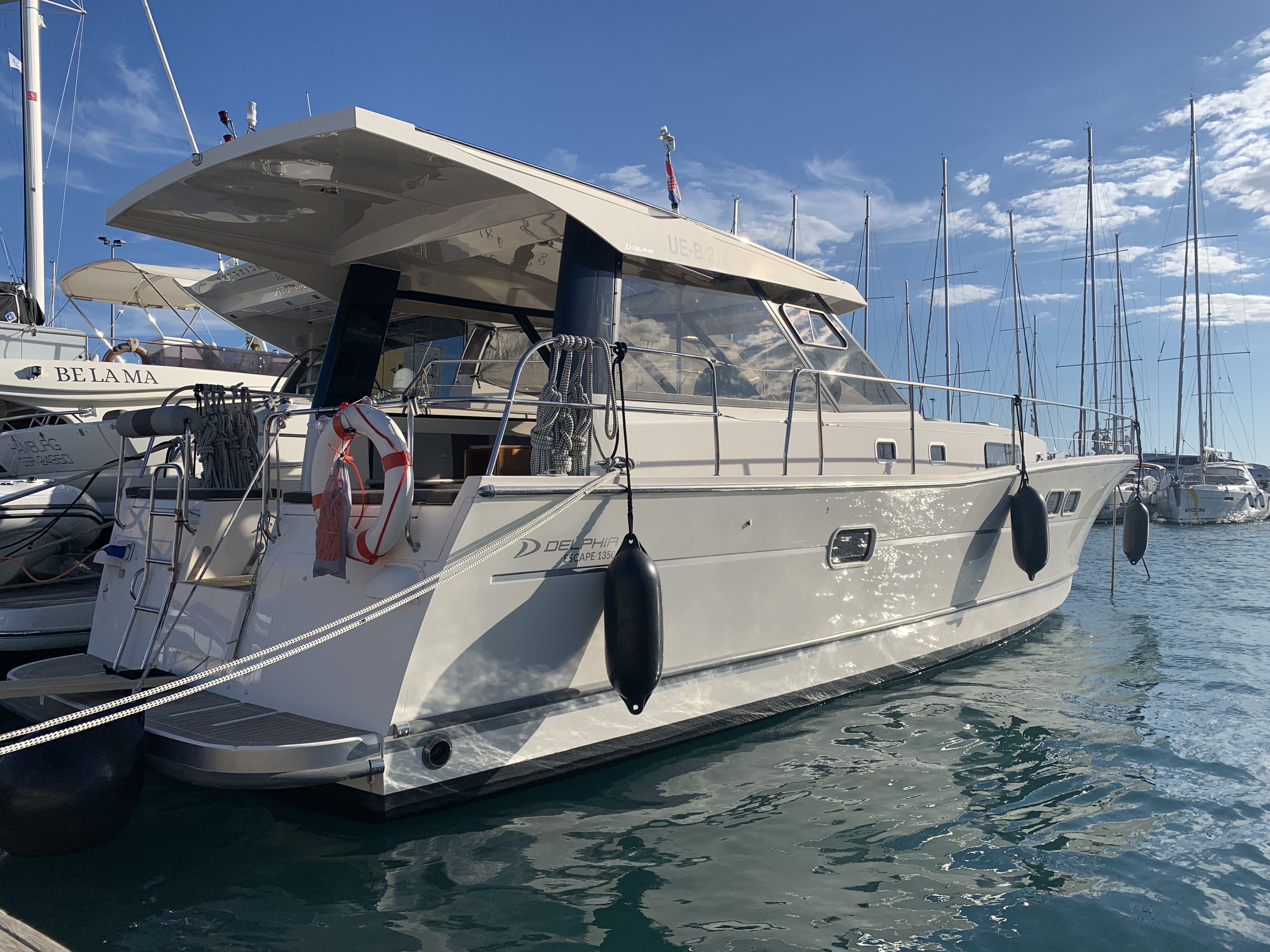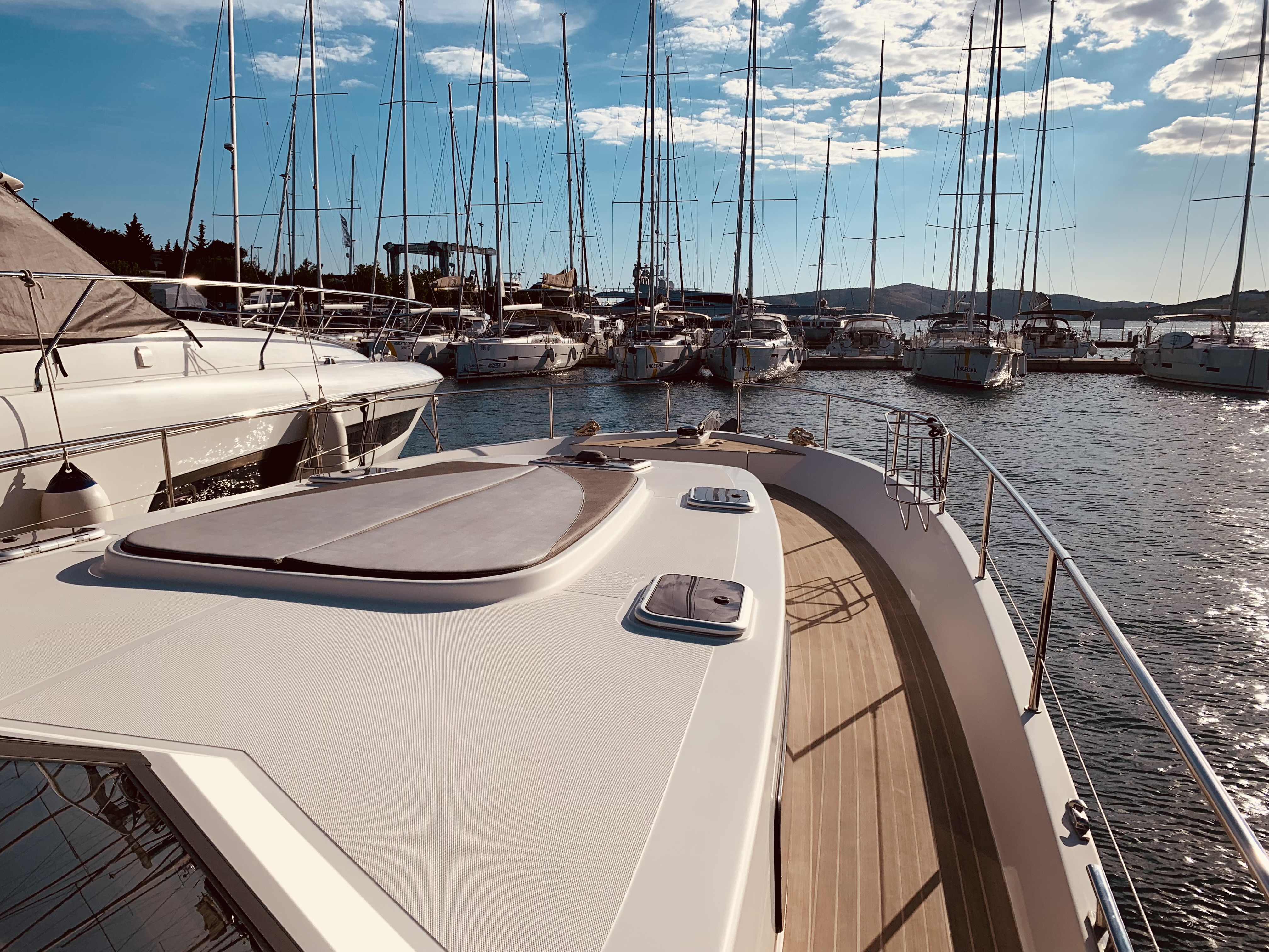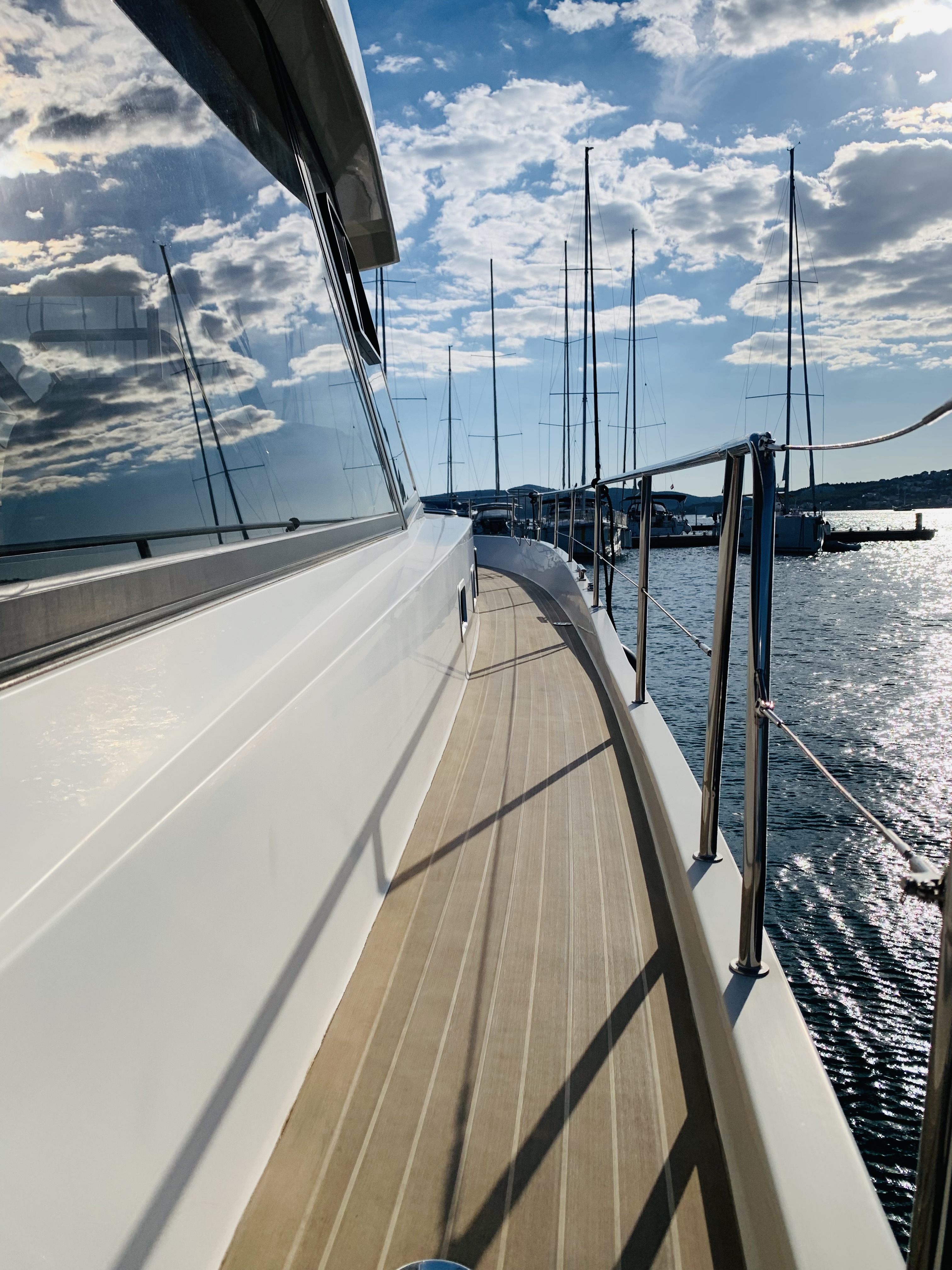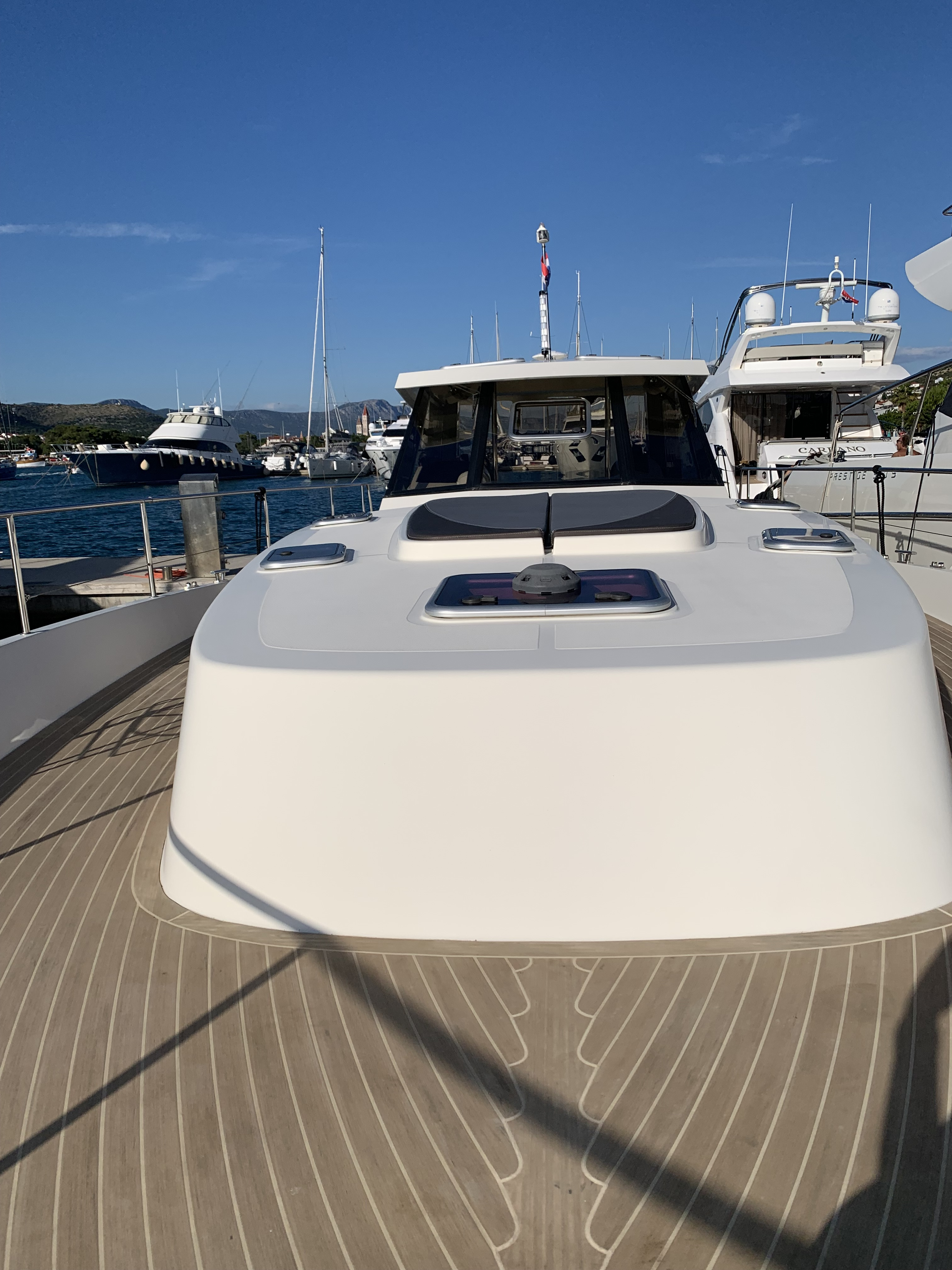 | Outside | 220 V-Landanschluss, Anker mit Kette, Ankerwinsch, Badeleiter, Cockpitdusche, Cockpitlautsprecher, Cockpittisch, Fender, Festmacherleinen, Gangway, Hardtop, Seereling, Sprayhood, Teak im Cockpit, Teakdeck |
