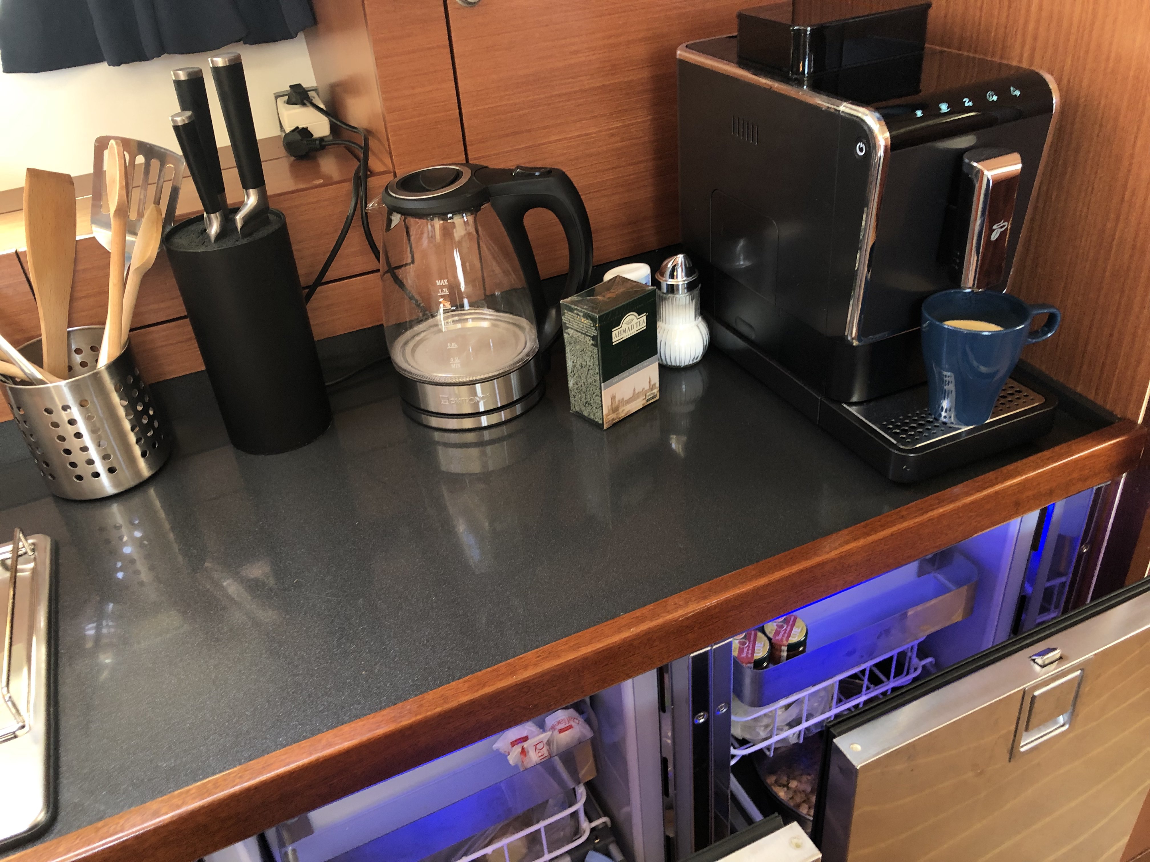 | Navigation | Barometer, Echolot, Fernglas, GPS mit Kartenplotter, Hafenhandbücher, Kompass, Navigationsbesteck, Seekarten, Sumlog |