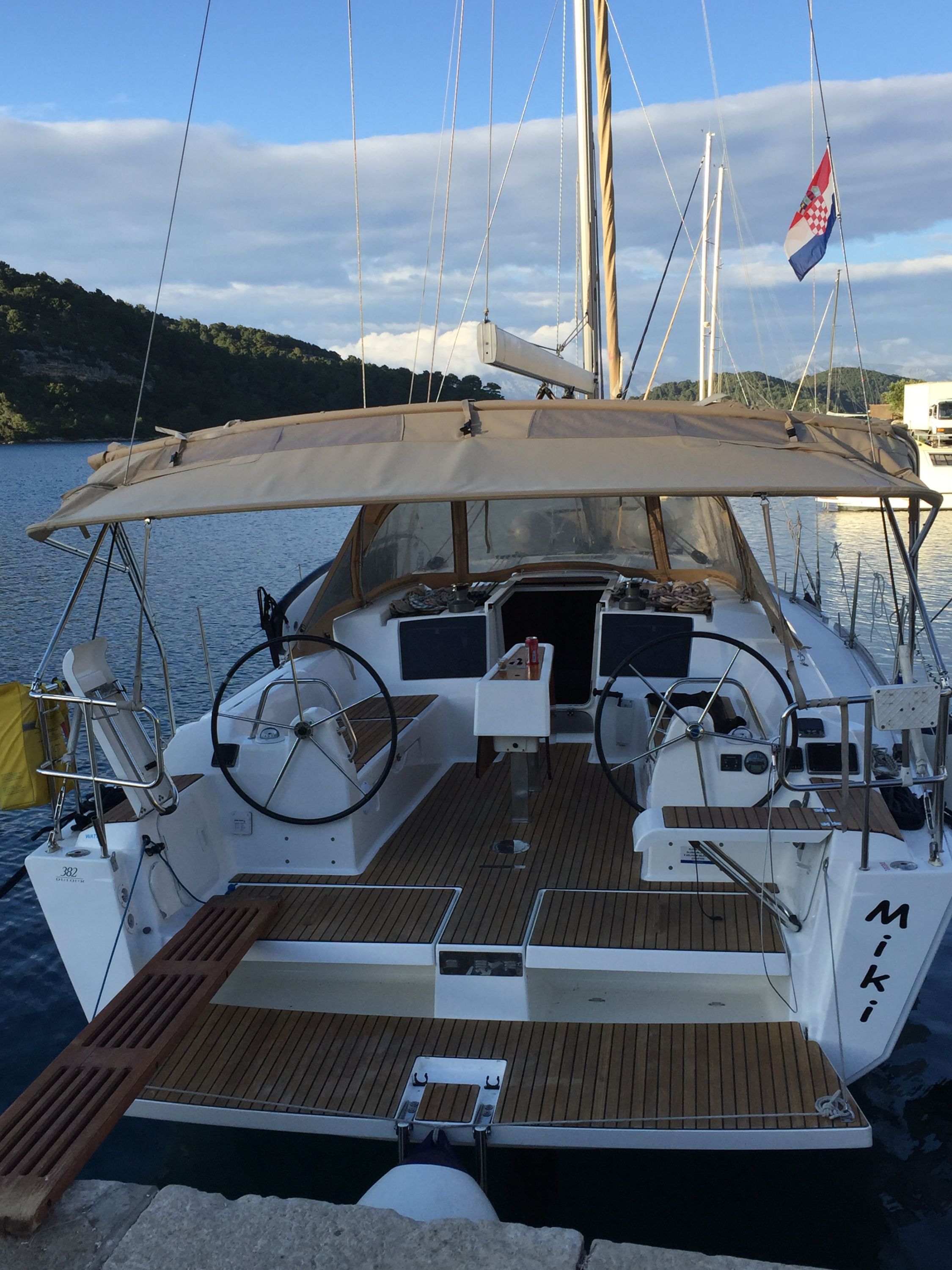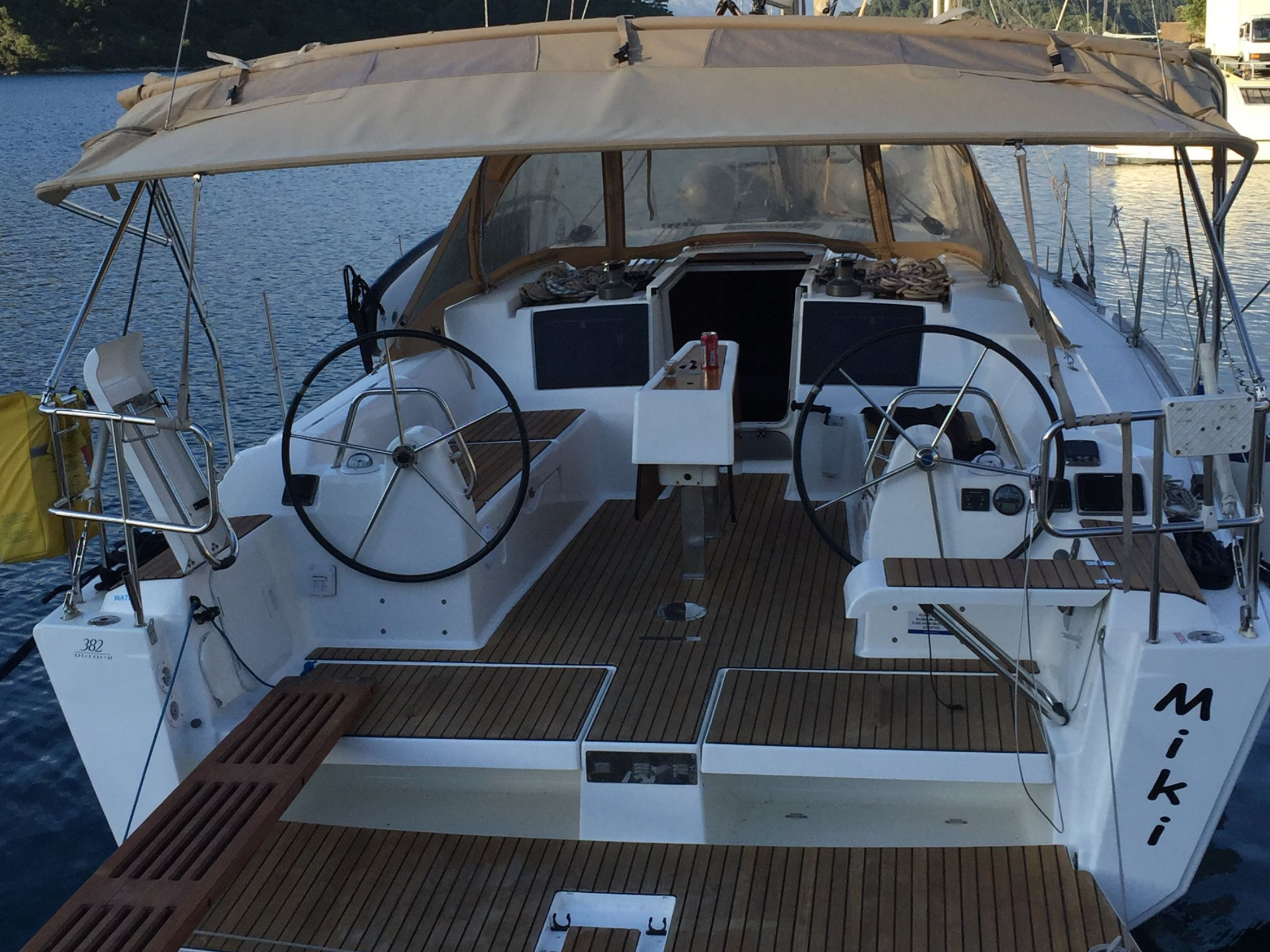 Outside Anker mit Kette, Badeplattform, Biminitop, Bootshaken, Cockpitdusche warm/kalt, Cockpitlautsprecher, Cockpitpolster, Cockpittisch, elektr. Ankerwinsch, Fender, Festmacherleinen, Gangway, Kugelfender, Sprayhood, Teak im Cockpit, Wasserschlauch, Winschen