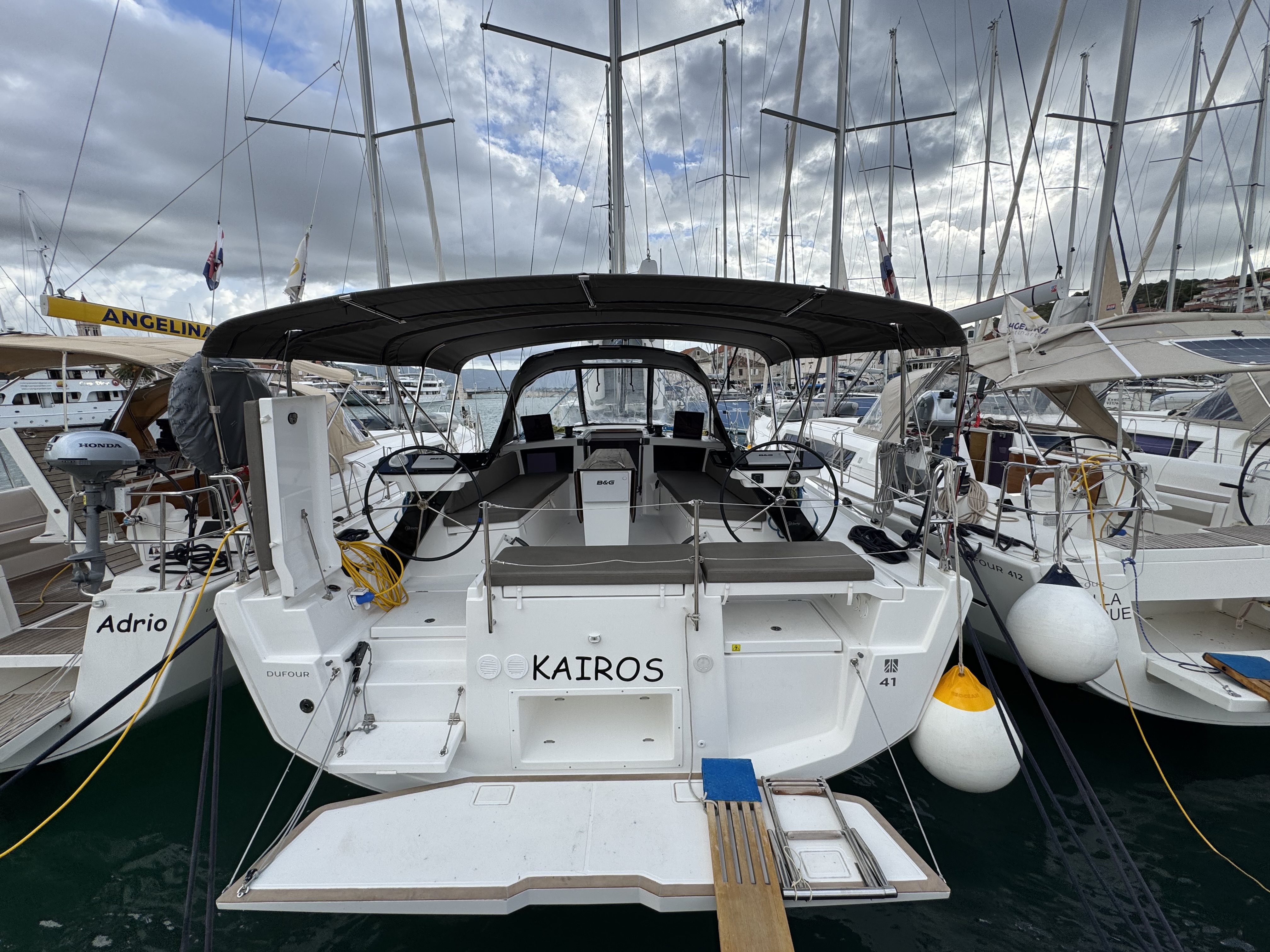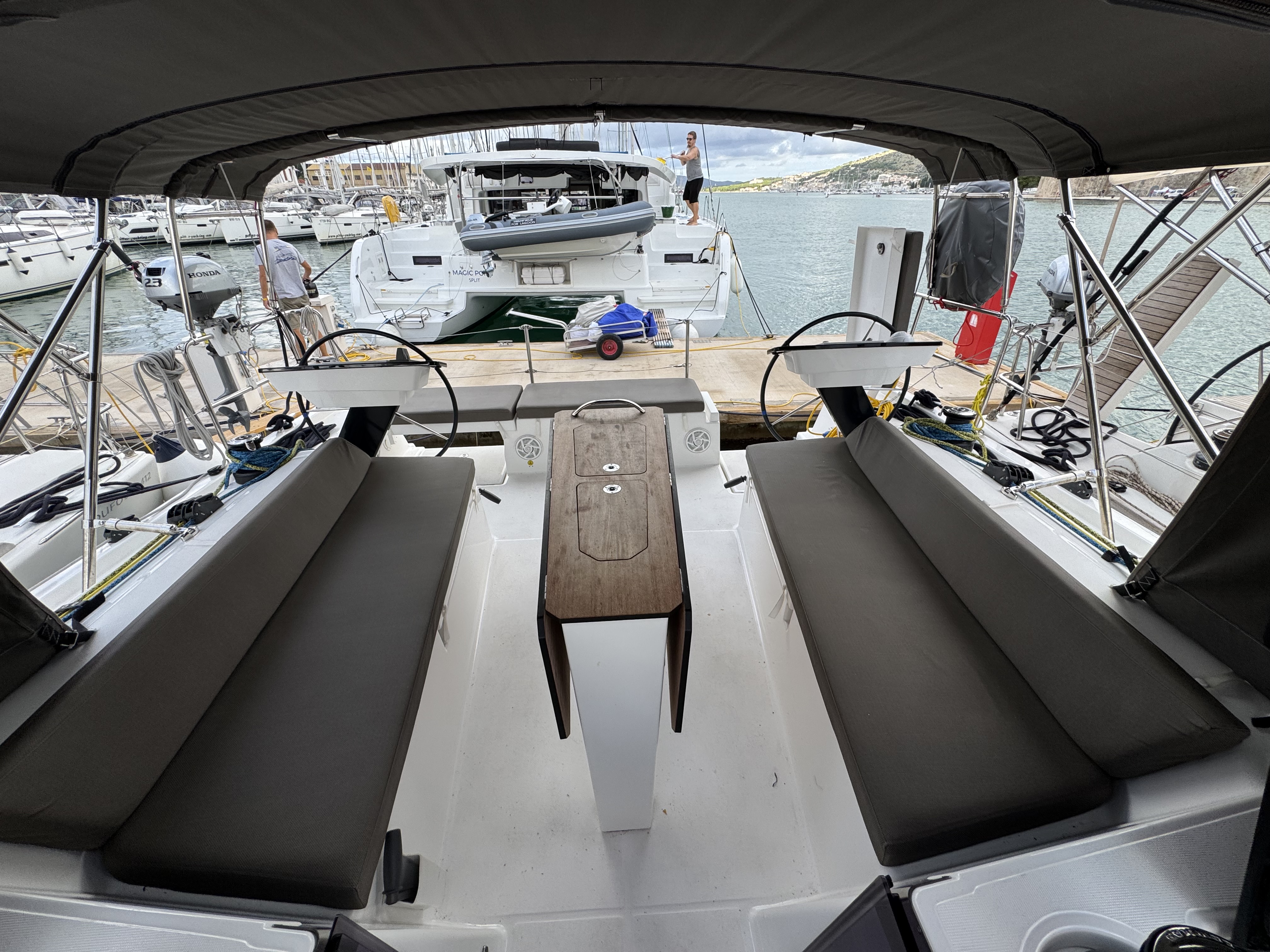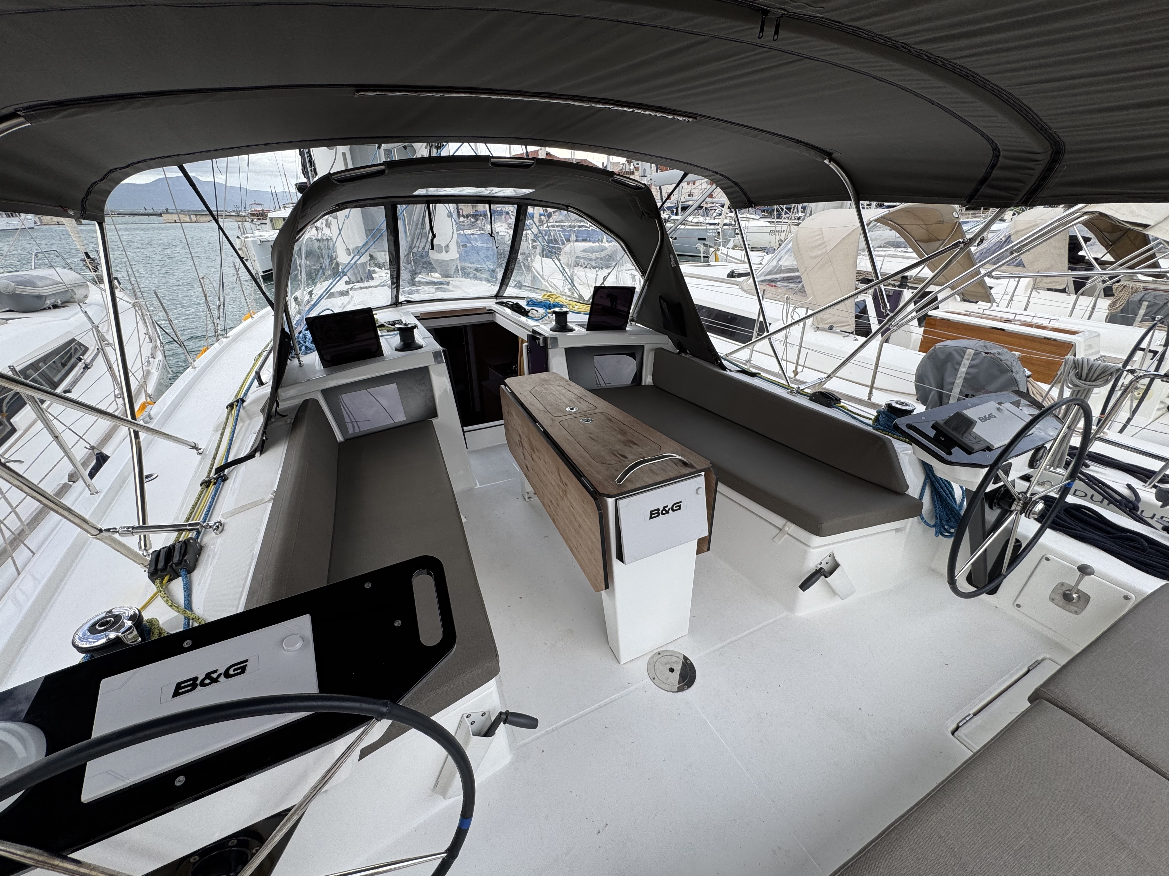 | Outside | 220 V-Landanschluss, Anker mit Kette, Badeplattform, Biminitop, Bootshaken, Cockpitdusche, Cockpitlautsprecher, Cockpitpolster, Cockpittisch, Festmacherleinen, Gangway, Grill, Solaranlage, Sprayhood, Wasserschlauch, Windex, Winschen |