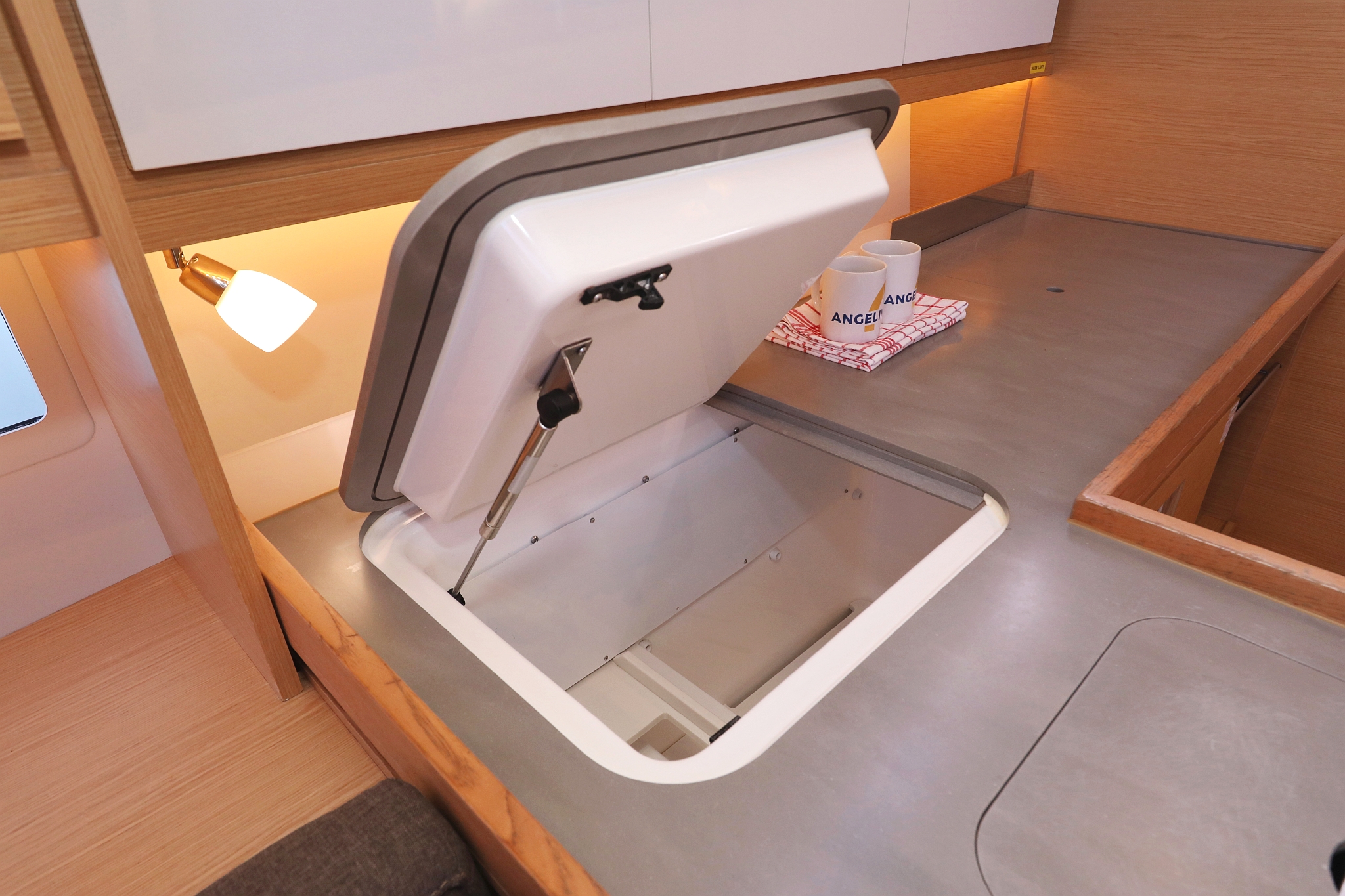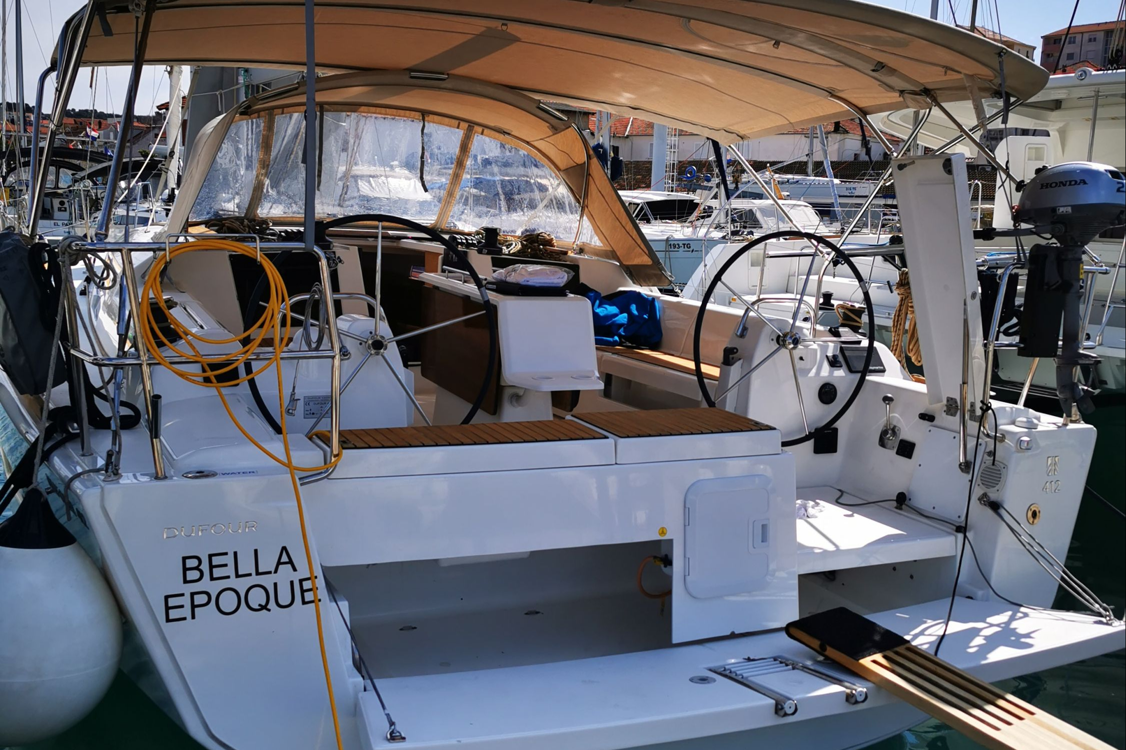 | Outside | 220 V-Landanschluss, Badeplattform, Biminitop, Bootshaken, Cockpitdusche, Cockpitlautsprecher, Cockpitpolster, Cockpittisch, Delta-Anker, elektr. Ankerwinsch, Fender, Festmacherleinen, Gangway, Grill, Solaranlage, Sprayhood, Teak im Cockpit, Wasserschlauch, Winschen |