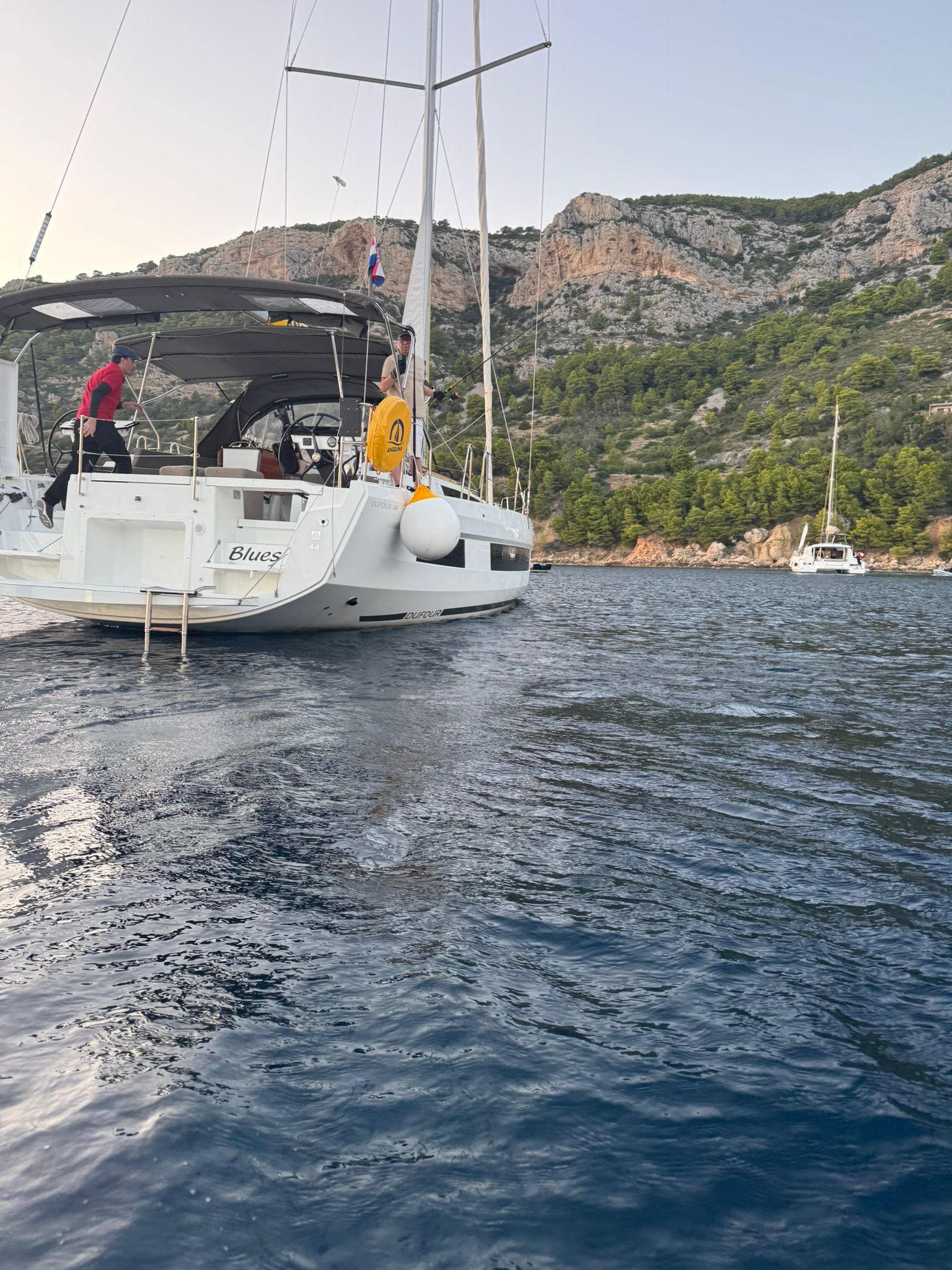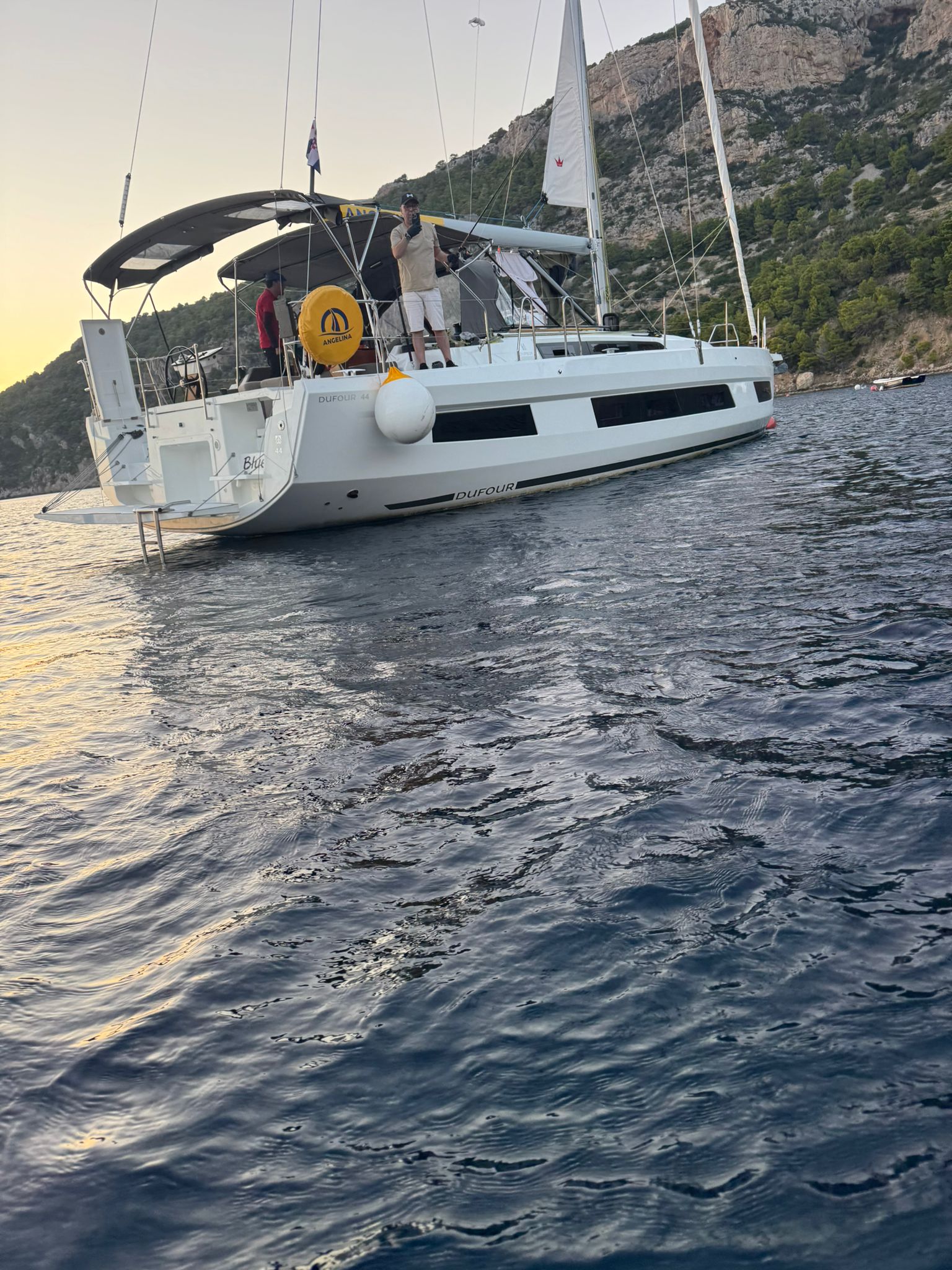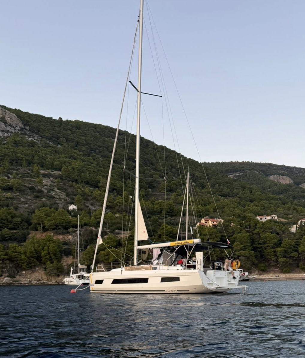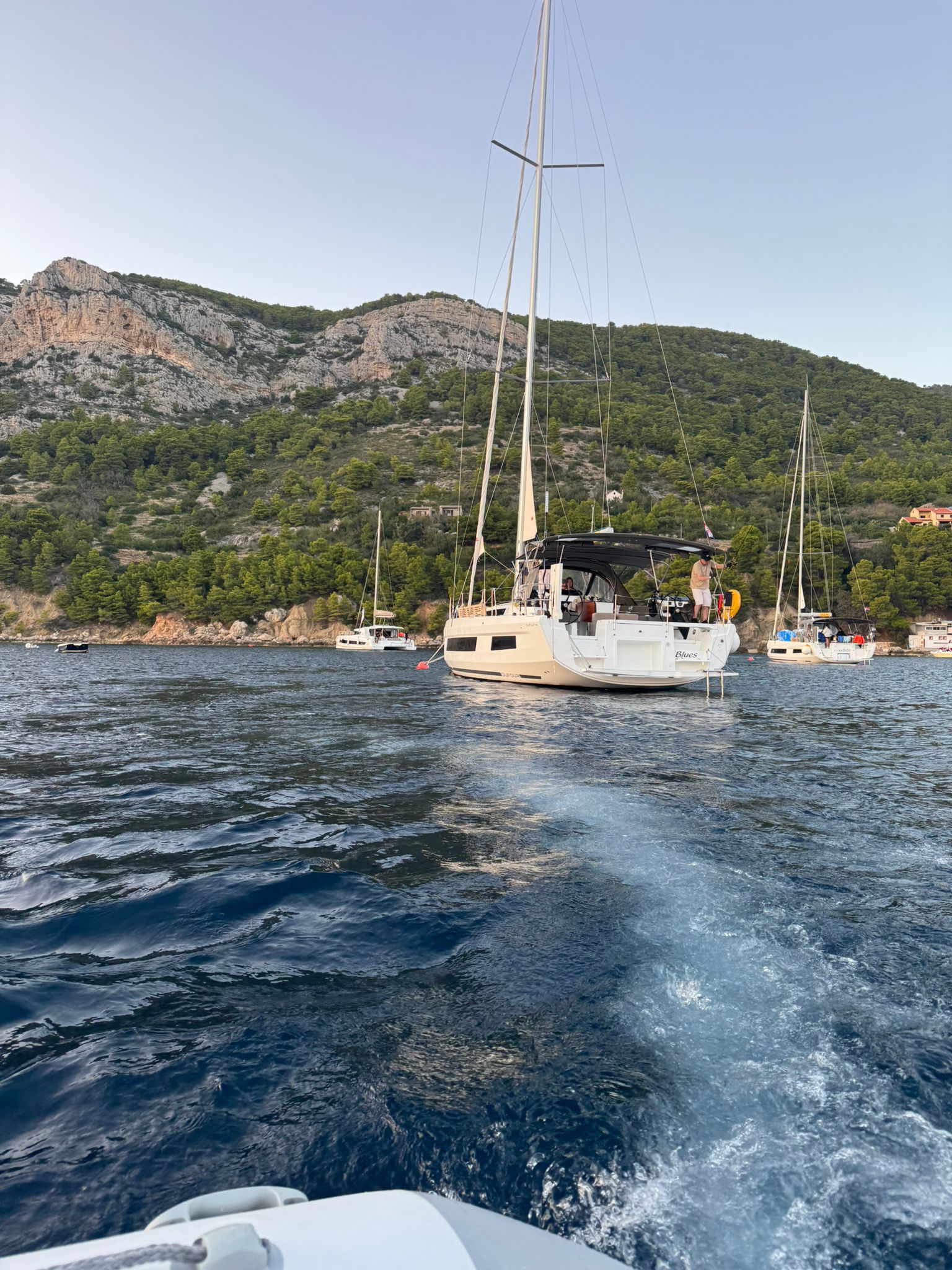 | Outside | 220 V-Landanschluss, Badeplattform, Biminitop, Bootshaken, Cockpitdusche, Cockpitlautsprecher, Cockpitpolster, Cockpittisch, Fender, Festmacherleinen, Gangway, Grill, Solaranlage, Sprayhood, Wasserschlauch, Windex, Winschen |