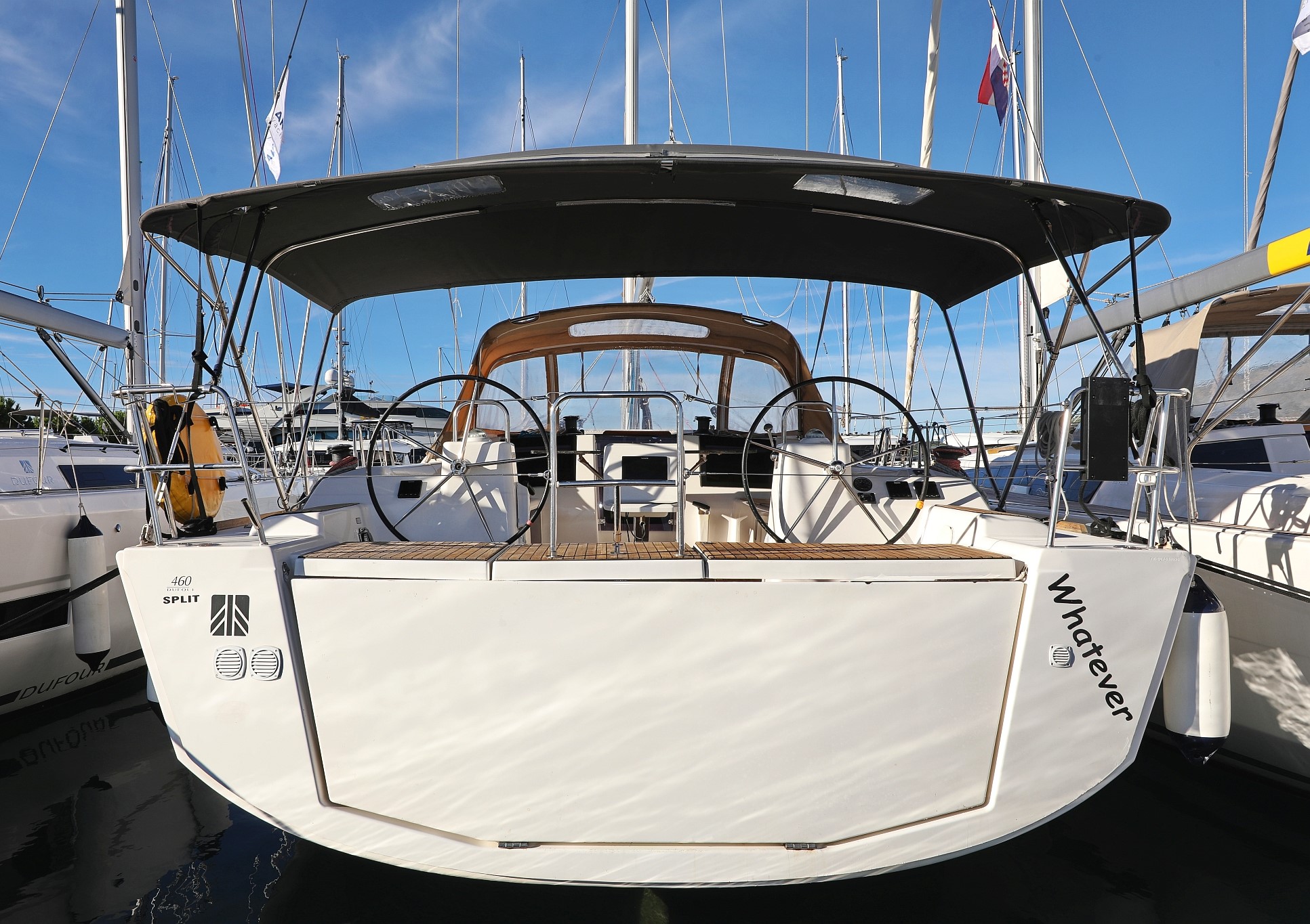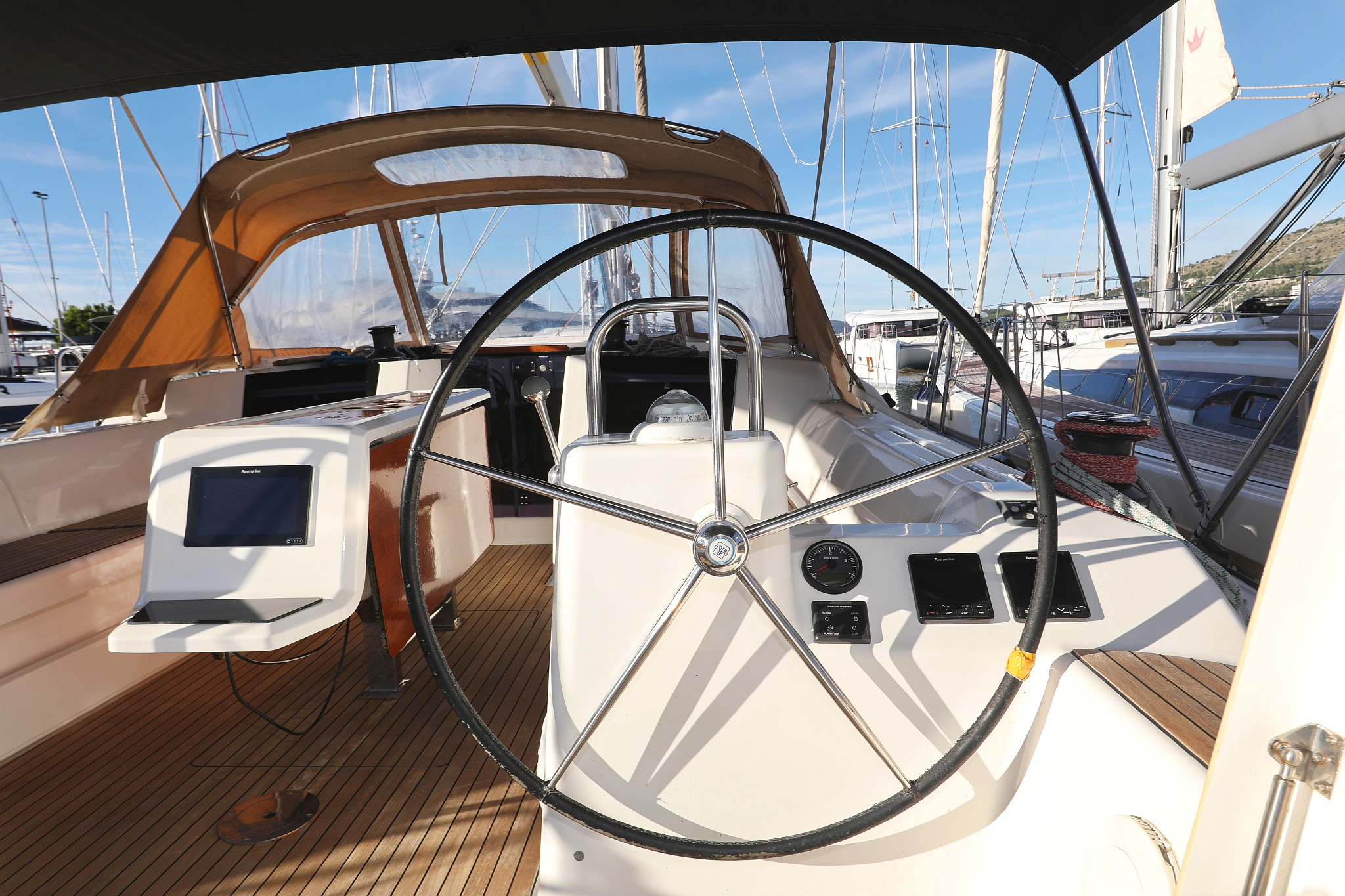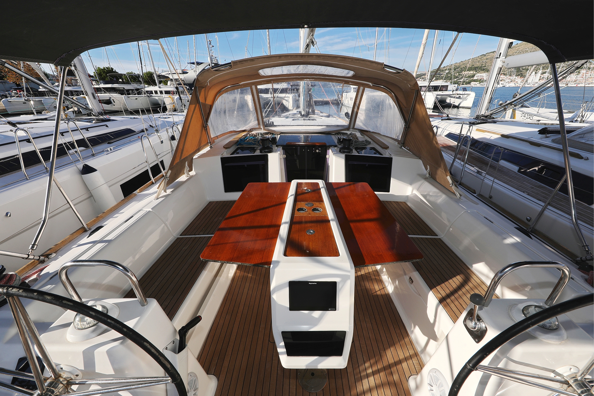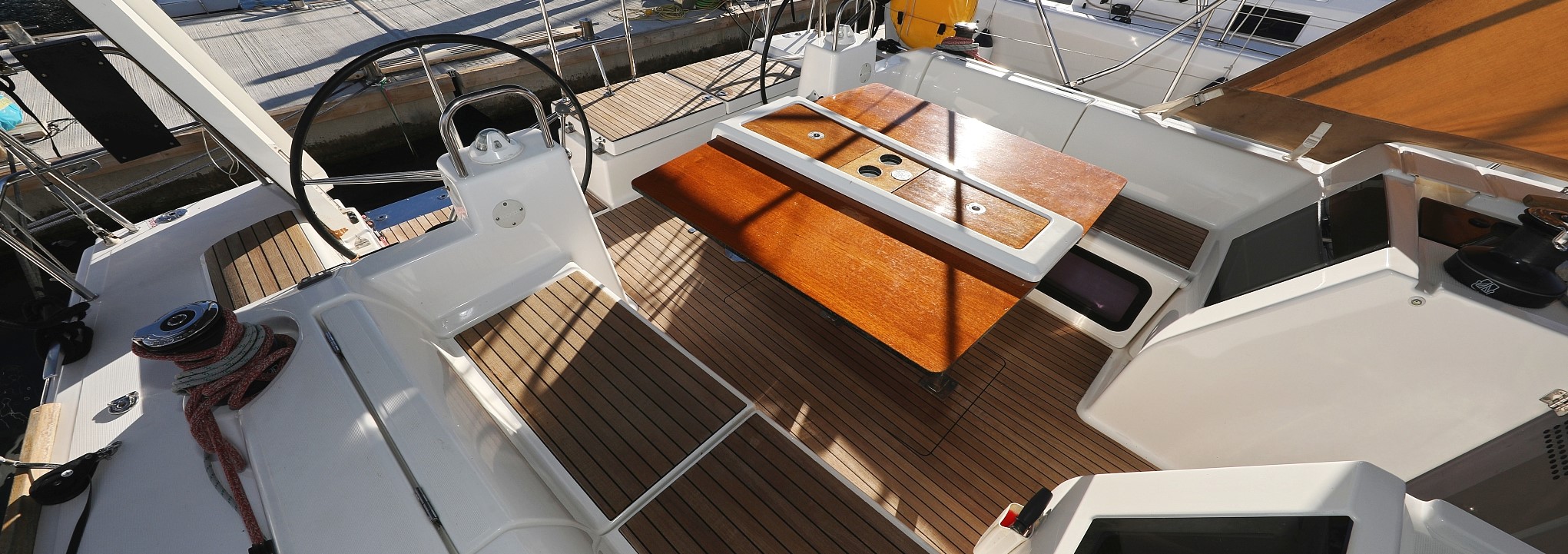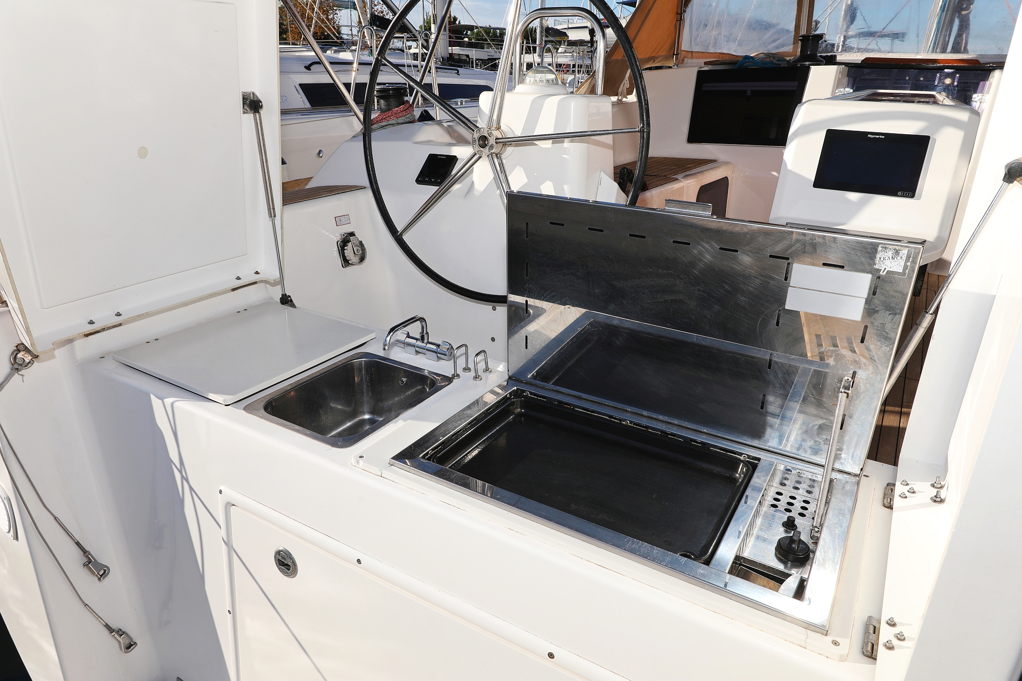 | Outside | 220 V-Landanschluss, Badeplattform, Biminitop, Bootshaken, Cockpitdusche, Cockpitlautsprecher, Cockpitpolster, Cockpittisch, Delta-Anker, elektr. Ankerwinsch, Fender, Festmacherleinen, Gangway, Genuawinschen, Grill, Solaranlage, Sprayhood, Teak im Cockpit, Wasserschlauch, Winschen |