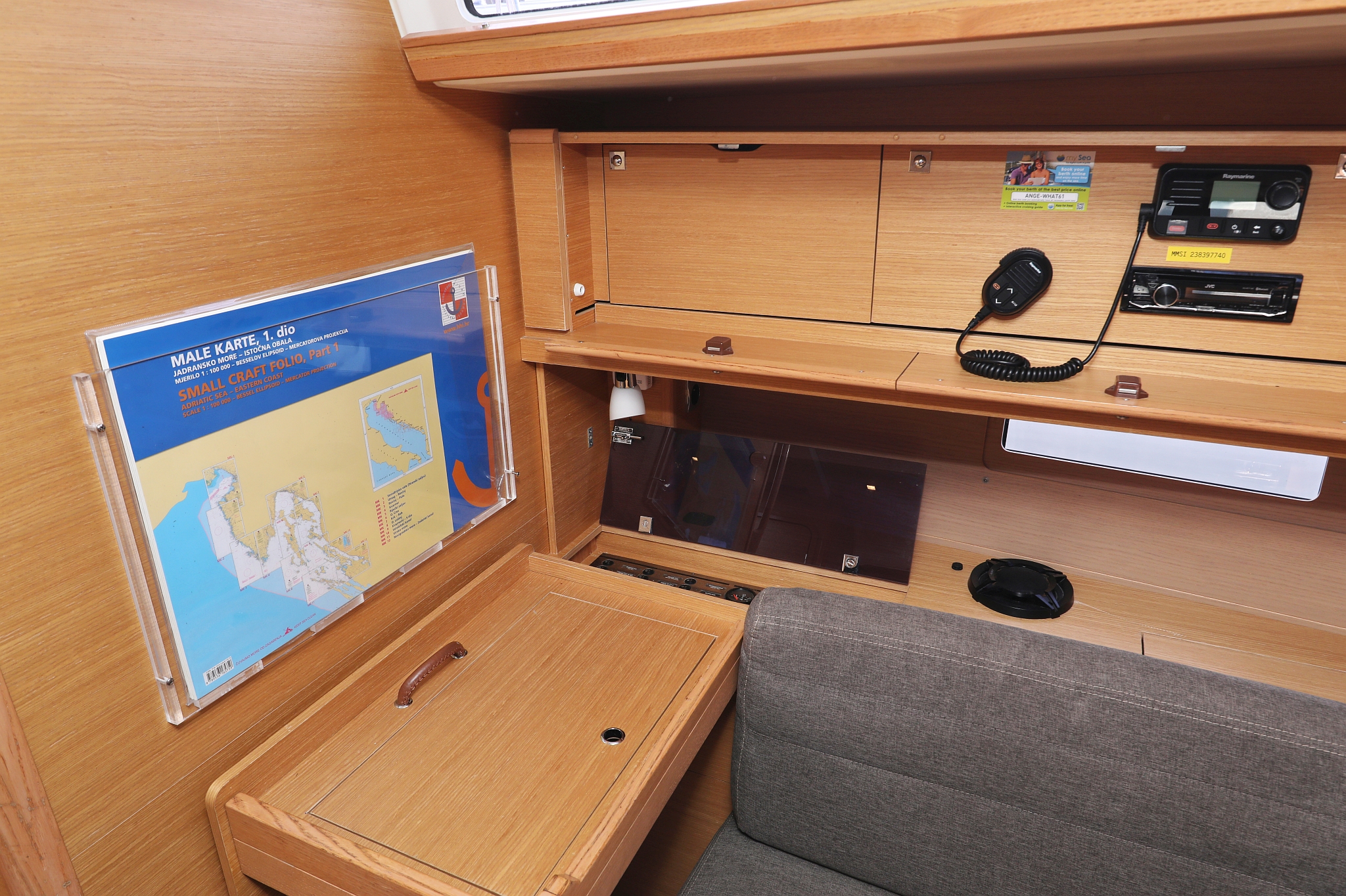 | Navigation | Barometer, Fernglas, GPS mit Kartenplotter im Cockpit, Handpeilkompass, Kompass, Navigationsbesteck, Seekarten, Tridata (Log, Echolot, Windm.), Windmesser |