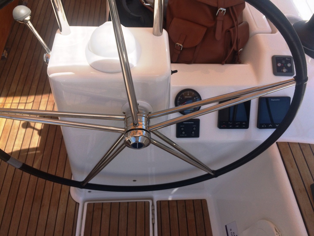 | Outside | 220 V-Landanschluss, Badeplattform, Biminitop, Bootshaken, Cockpitdusche, Cockpitlautsprecher, Cockpitpolster, Cockpittisch, Delta-Anker, elektr. Ankerwinsch, Fender, Festmacherleinen, Gangway, Genuawinschen, Grill, Kugelfender, Solaranlage, Sprayhood, Teak im Cockpit, Wasserschlauch, Winschen |