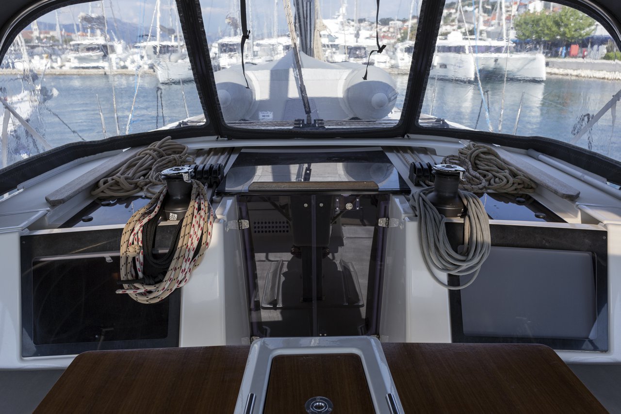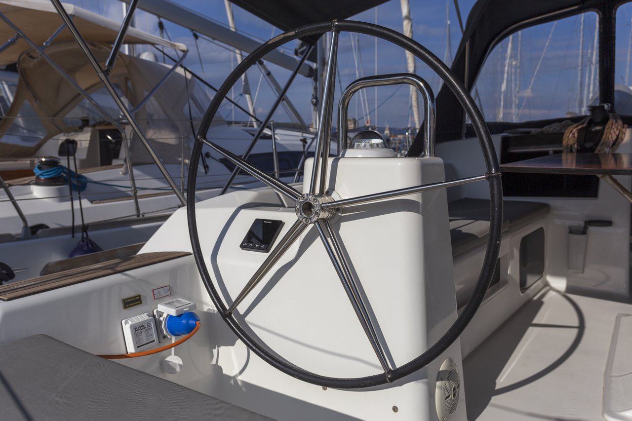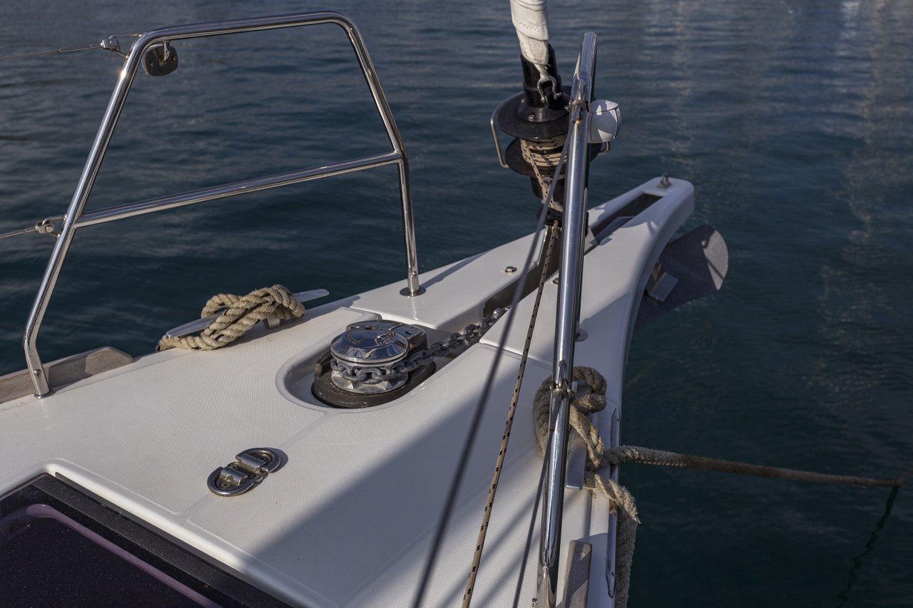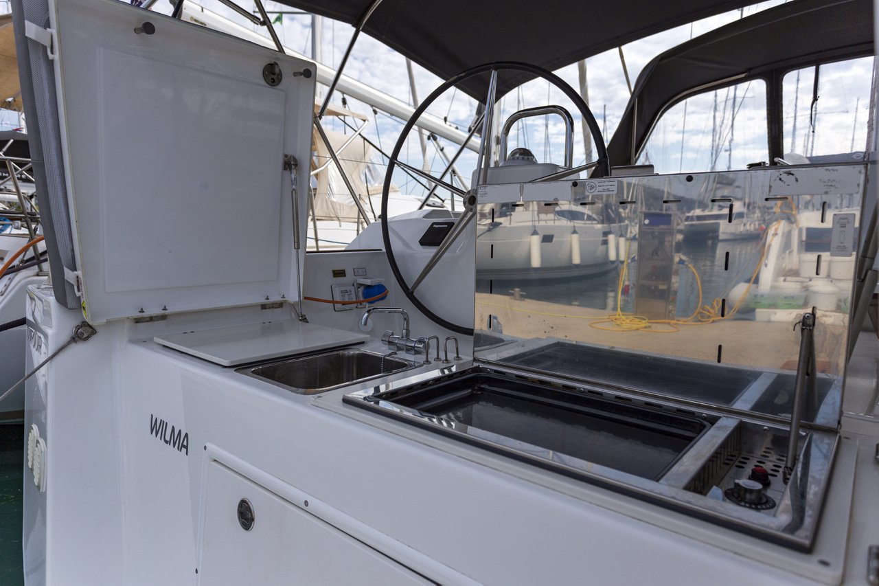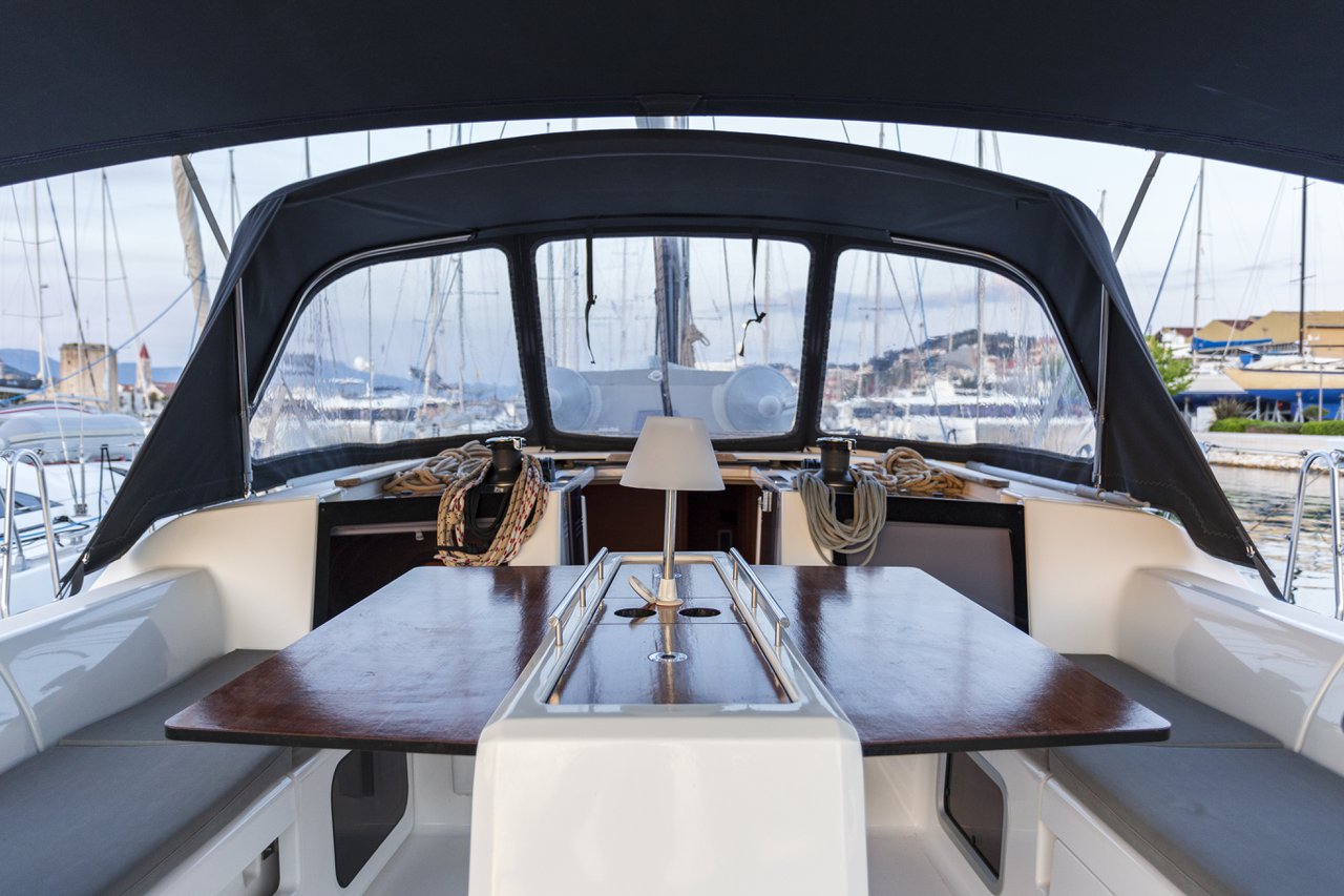 | Outside | 220 V-Landanschluss, Anker mit Kette, Badeleiter, Badeplattform, Biminitop, Bootshaken, Cockpitdusche, Cockpitkühlschrank, Cockpitlautsprecher, Cockpitleuchte, Cockpitpolster, Cockpittisch, Dieselkanister , elektr. Ankerwinsch, Fender, Grill, Sprayhood, Teak im Cockpit |