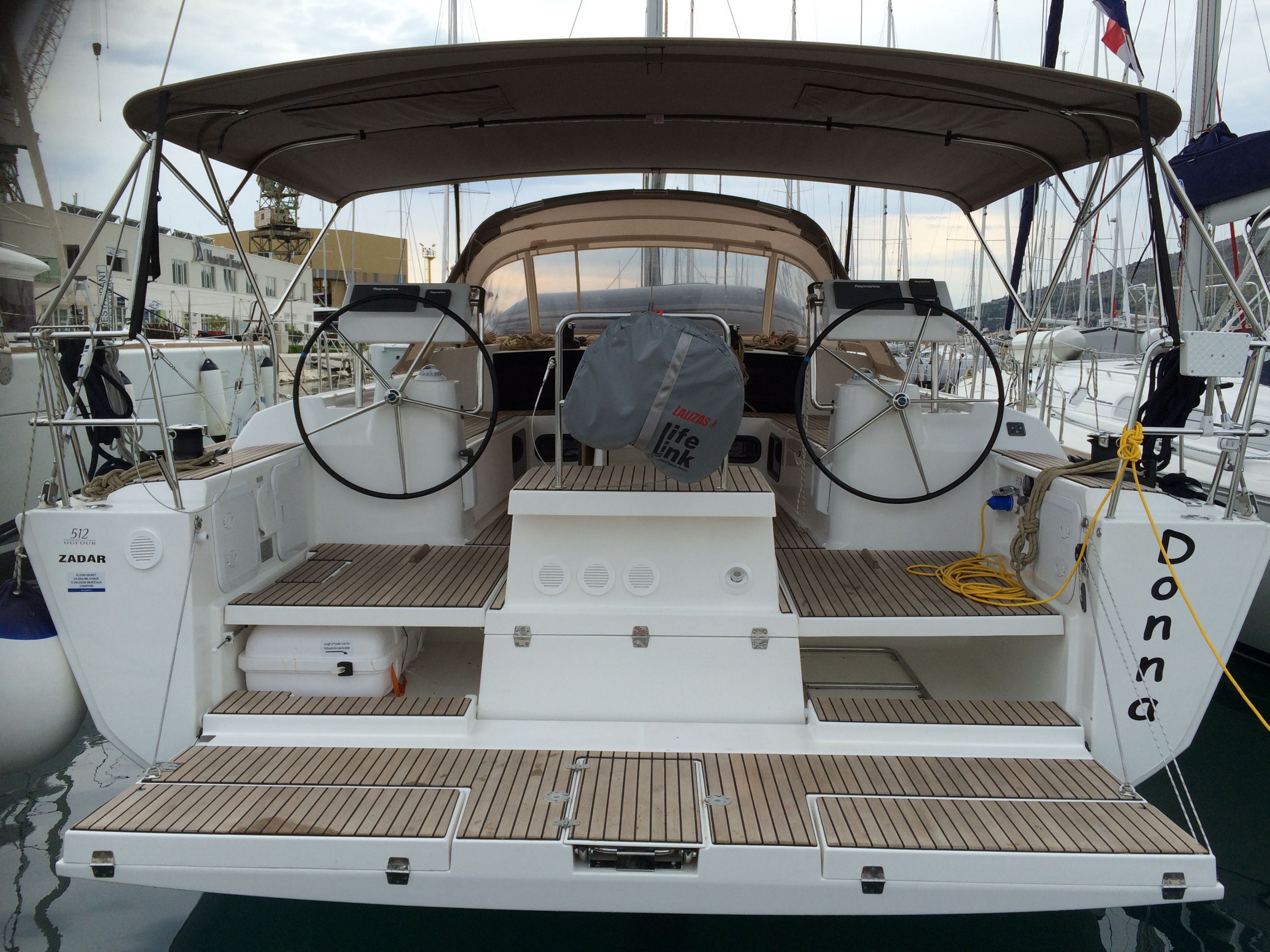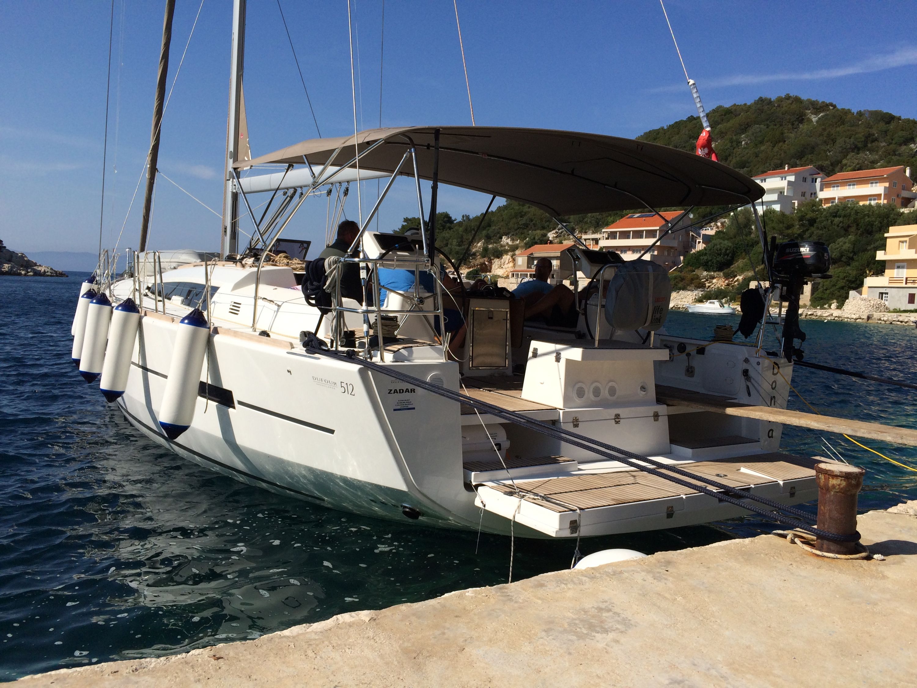 | Outside | 220 V-Landanschluss, Badeplattform elektr., Biminitop, Bootshaken, Cockpitdusche, Cockpitkühlschrank, Cockpitlautsprecher, Cockpitpolster, Cockpittisch, Delta-Anker, elektr. Ankerwinsch, Fender, Festmacherleinen, Gangway, Gas-Barbecue-Grill im Cockpit, Jambo Anker, Kugelfender, Sprayhood, Teak im Cockpit, Wasserschlauch, Winschen |