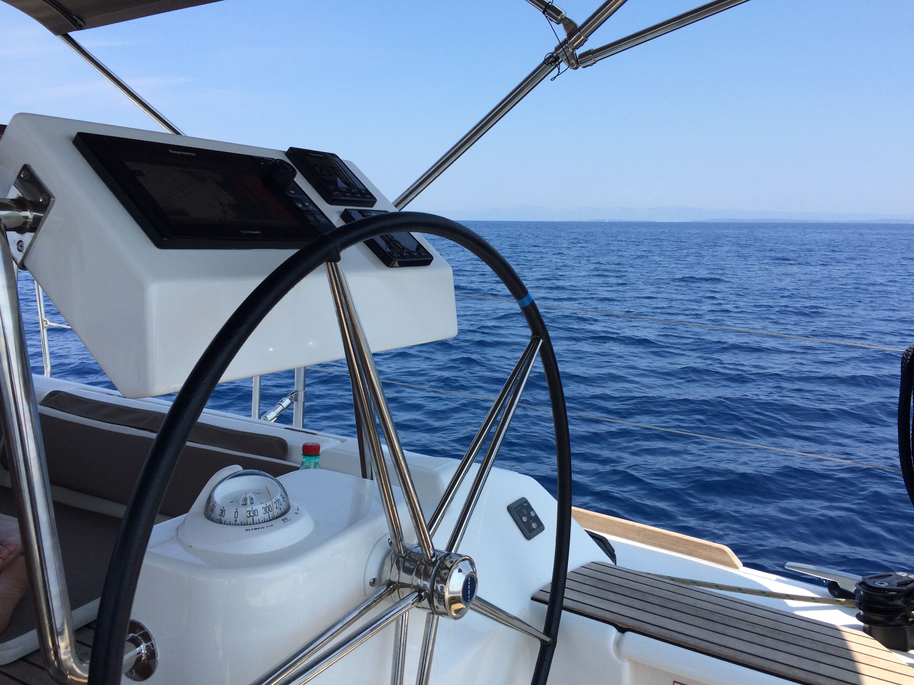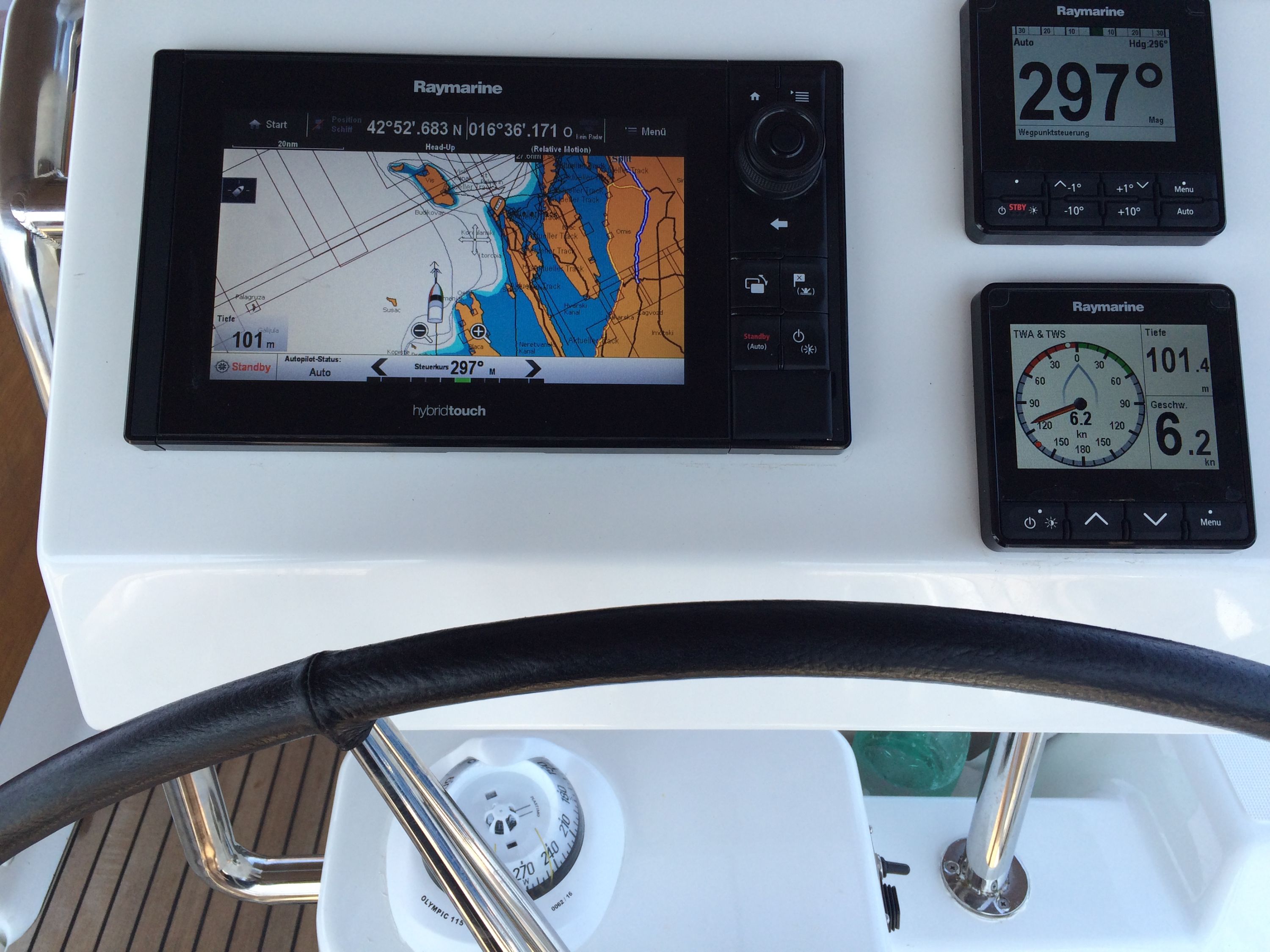 | Navigation | Barometer, Fernglas, GPS mit Kartenplotter im Cockpit, Hafenhandbücher, Handpeilkompass, Kompass, Navigationsbesteck, Seekarten, Tridata (Log, Echolot, Windm.), Windmesser |
