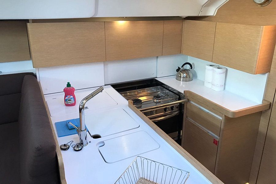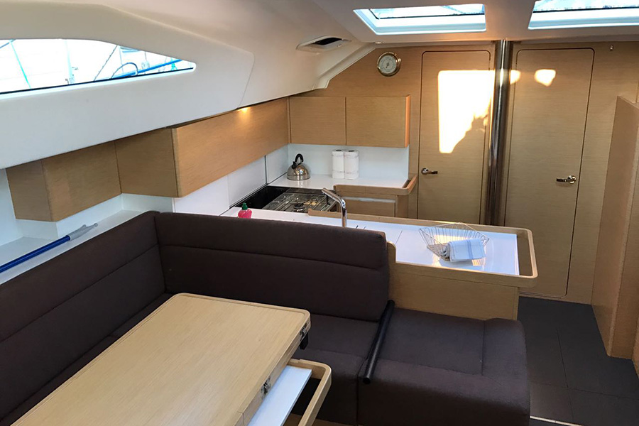 | Outside | Badeplattform, Biminitop, Cockpitdusche, Cockpitkühlschrank, Cockpitlautsprecher, Cockpitpolster, Cockpittisch, elektr. Ankerwinsch, Sprayhood, Teak im Cockpit |