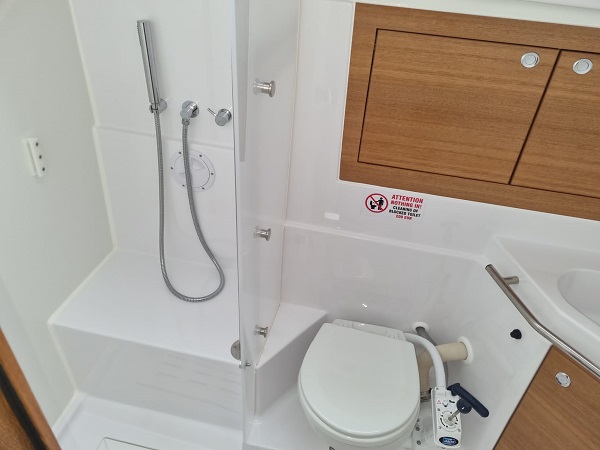 | Outside | 220 V-Landanschluss, Außendusche, Biminitop, Cockpitdusche, Cockpittisch, elektr. Ankerwinsch, Sprayhood |