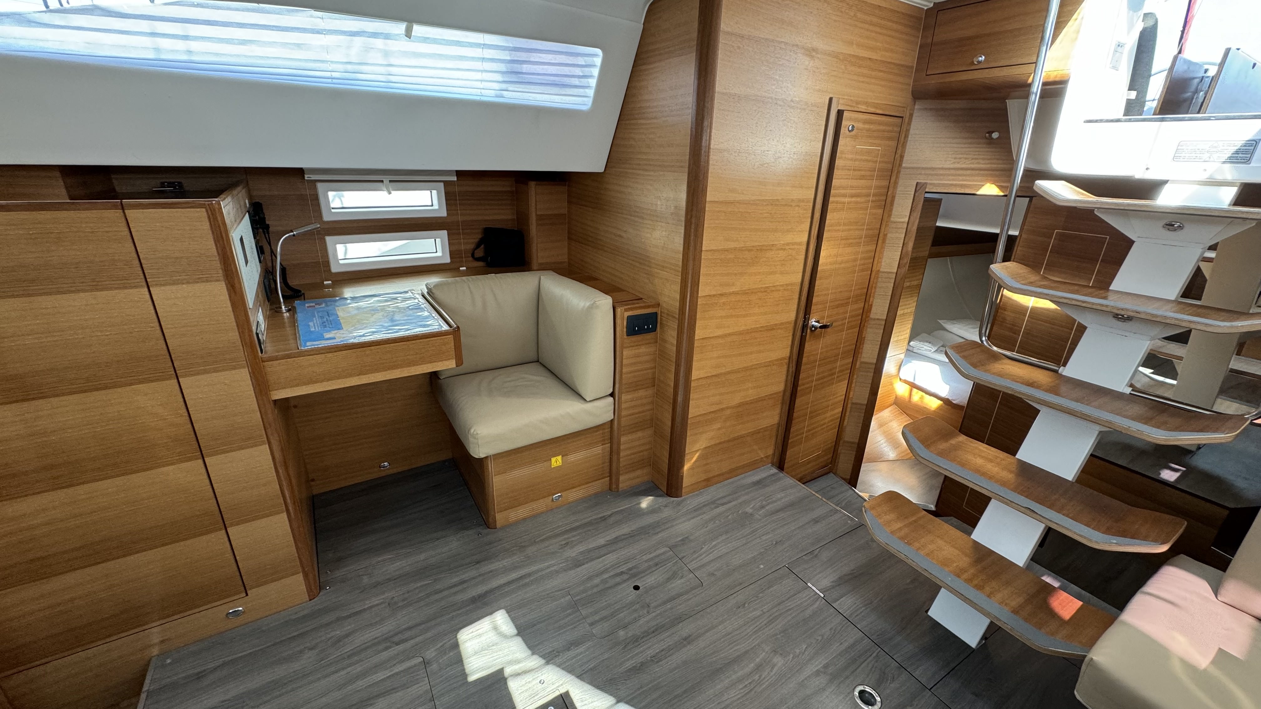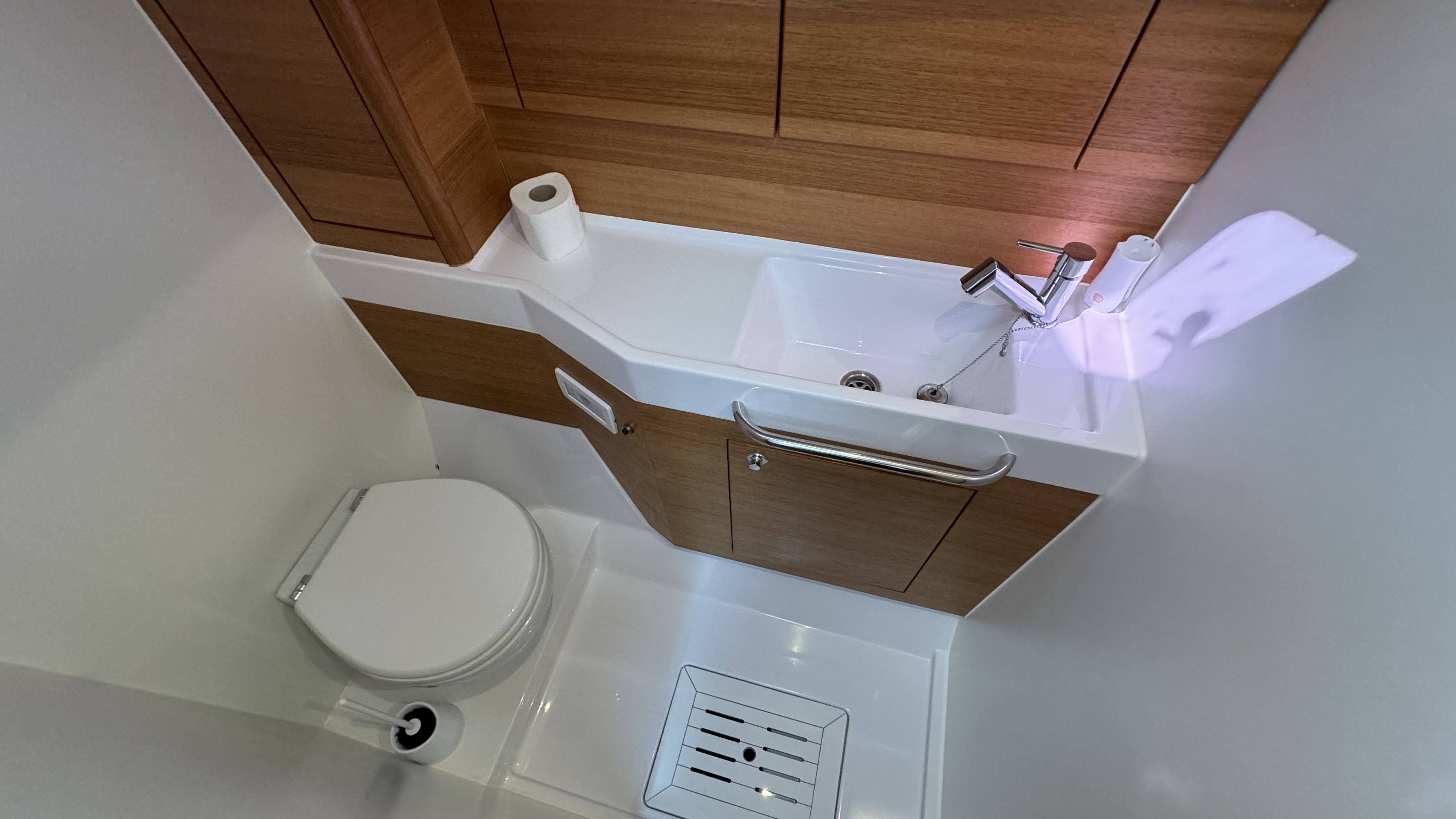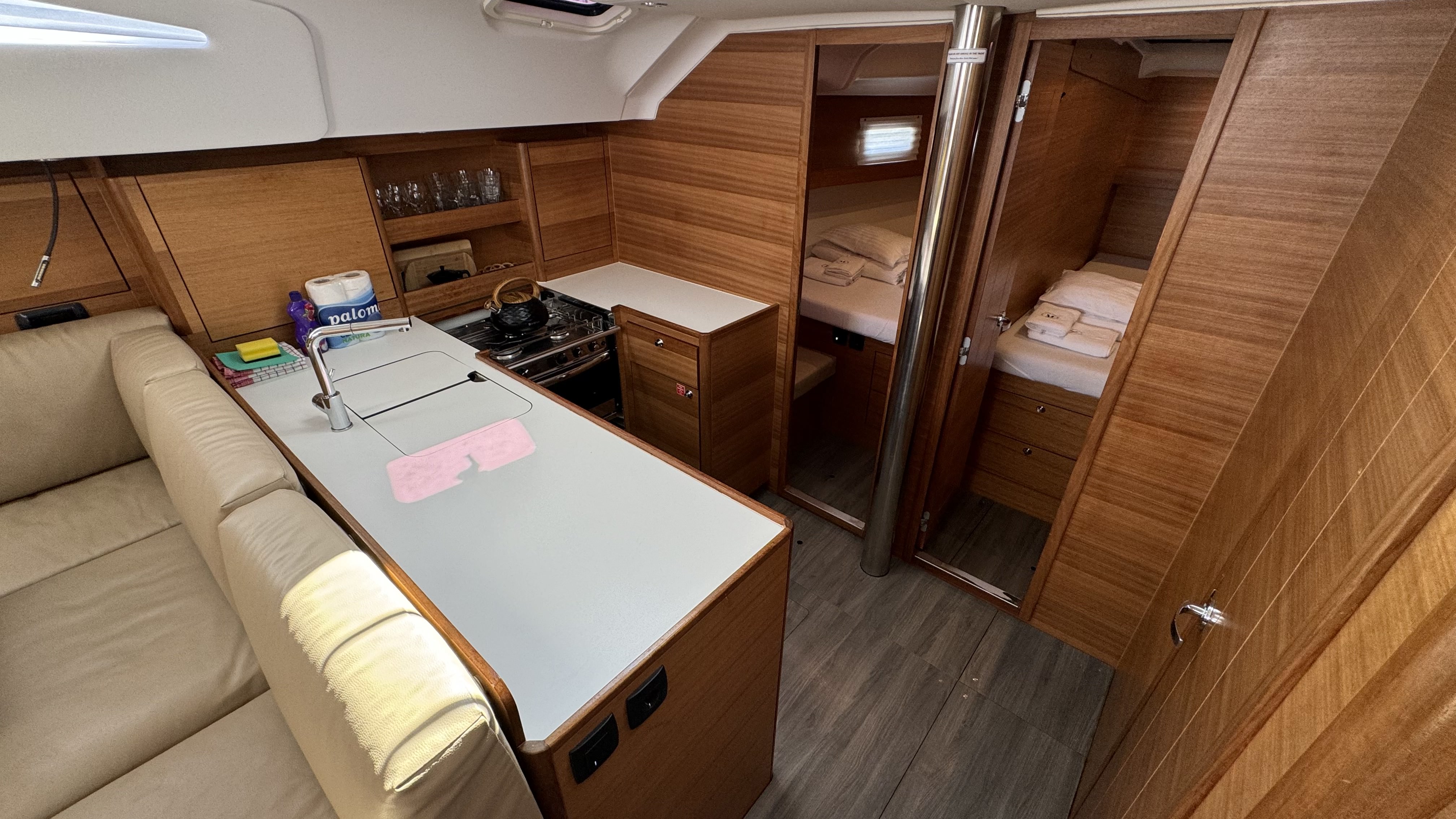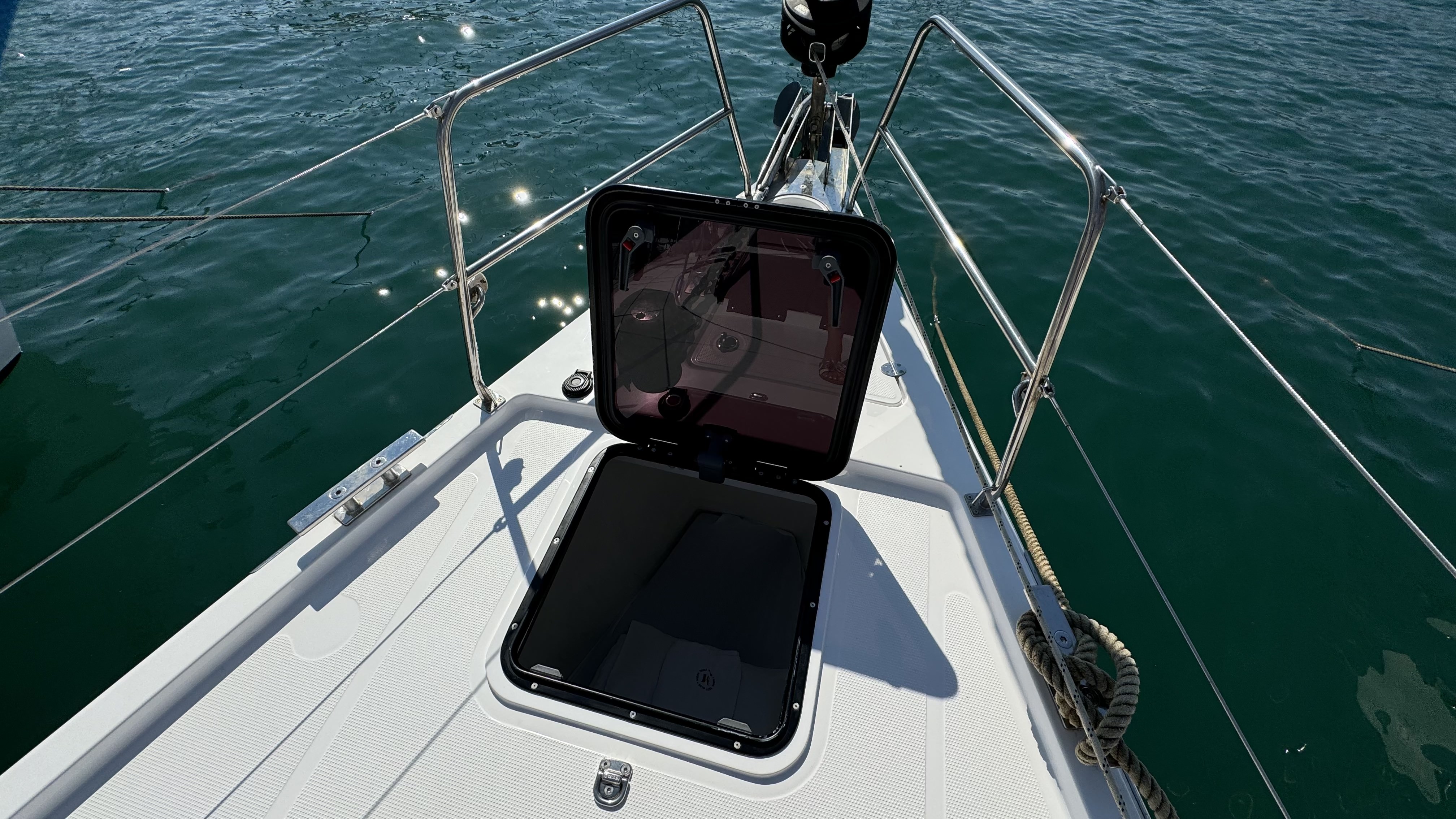 | Outside | 220 V-Landanschluss, Anker mit Kette, Badeleiter, Badeplattform elektr., Biminitop, Bootshaken, Cockpitdusche, Cockpitkühlschrank, Cockpitlautsprecher, Cockpitleuchte, Cockpitpolster, Cockpittisch, Dieselkanister , elektr. Ankerwinsch, elektr. Winsch, Faltpropeller, Fender, Grill, Sprayhood, Teak im Cockpit |