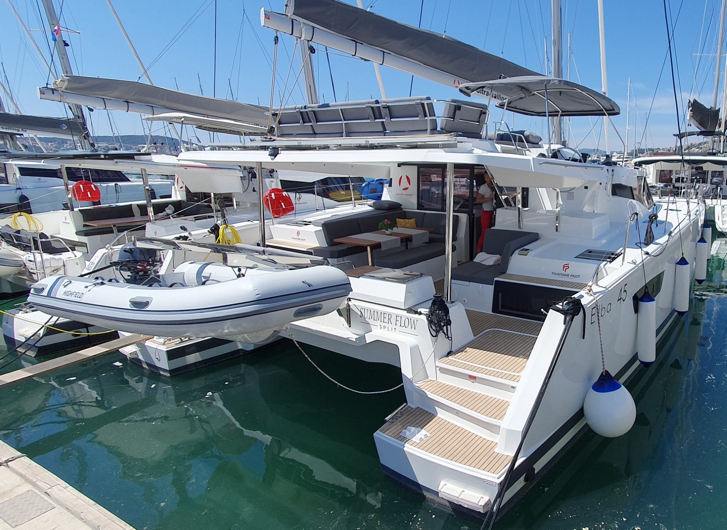 | Outside | 220 V-Landanschluss, Anker mit Kette, Biminitop, Bootshaken, Cockpitdusche, Cockpitkühlschrank, Cockpitlautsprecher, Cockpitpolster, Cockpittisch, elektr. Ankerwinsch, elektr. Winsch, Fender, Gangway, Grill, Kugelfender, Solaranlage |