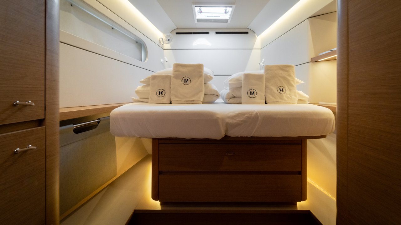 | Inside | Eiswürfelmaschine, Fäkalientank, FUSION Sound System, Gefrierschrank, Generator, Heizung, Inverter 12V/220V, Kaffeemaschine, Klimaanlage (ohne Landstrombedarf), Kühlschrank, Ladegerät, Pantryausstattung, Radio mit MP3 , Ventilatoren in Salon und Kabinen, Warmwasser, Watermaker, WC (elektr.) |