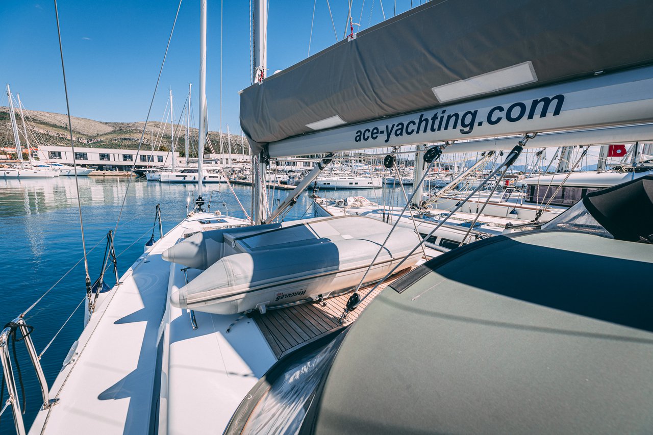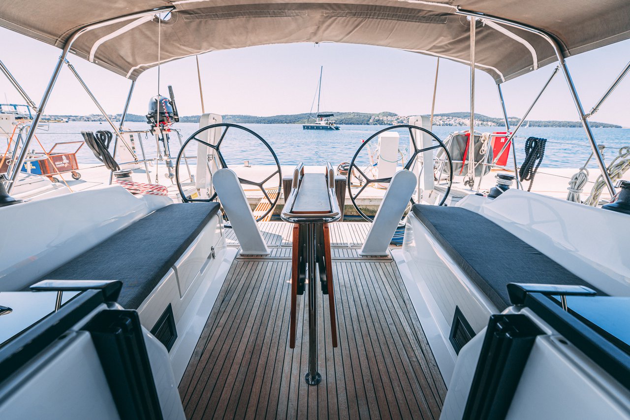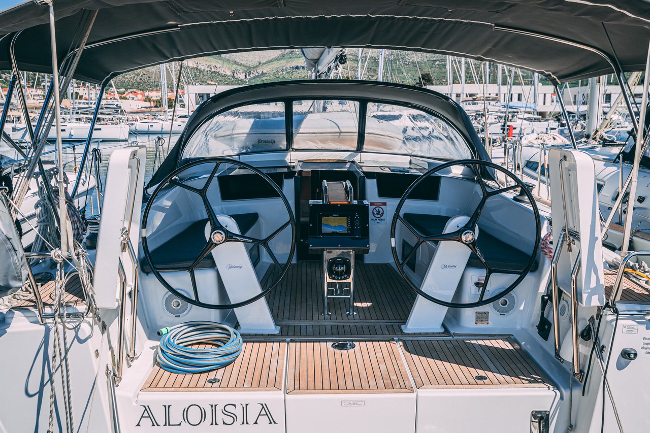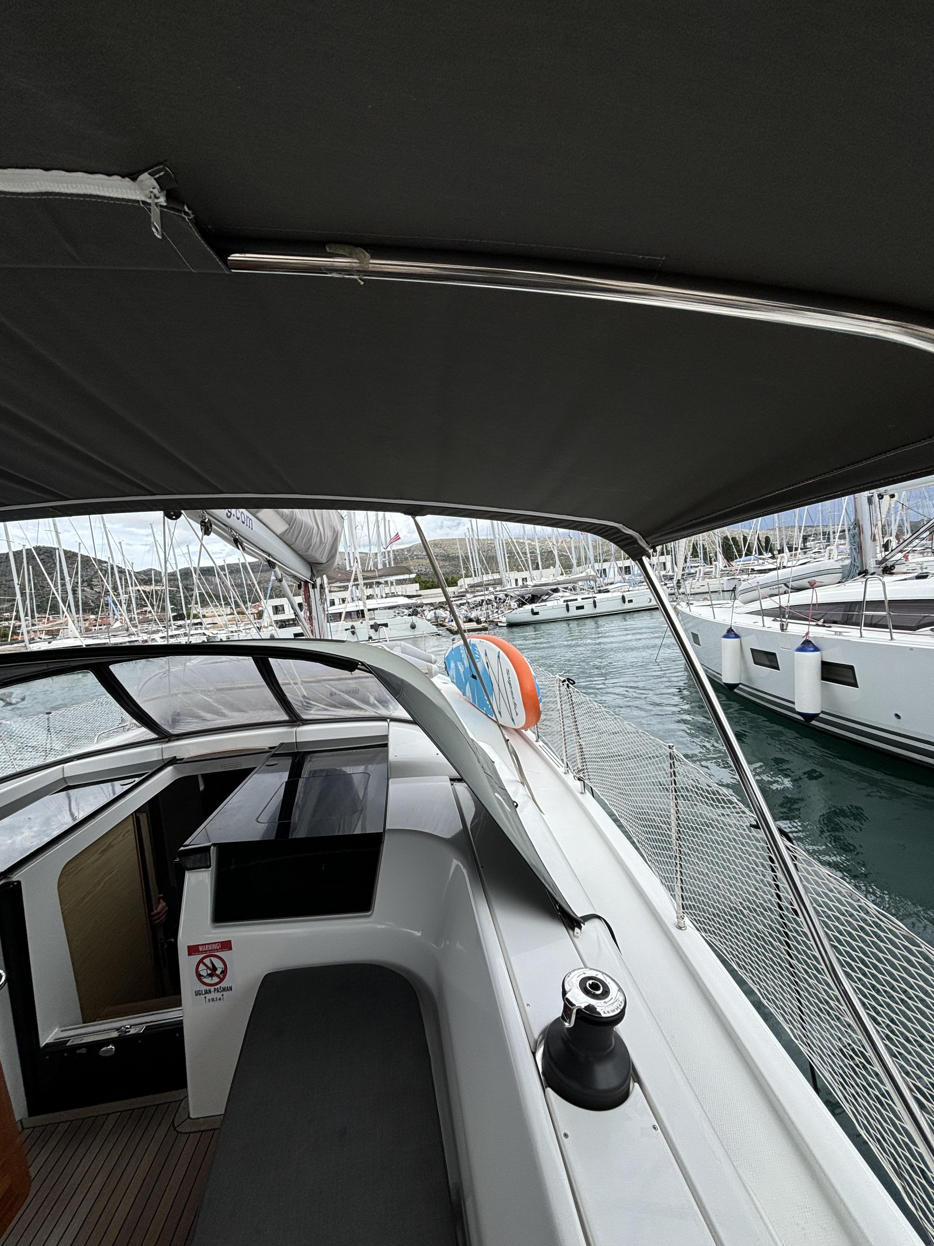 | Outside | Badeplattform, Biminitop, Cockpitdusche, Cockpitlautsprecher, Cockpittisch, elektr. Winsch, Solaranlage, Sprayhood, Teak im Cockpit, Winschen |