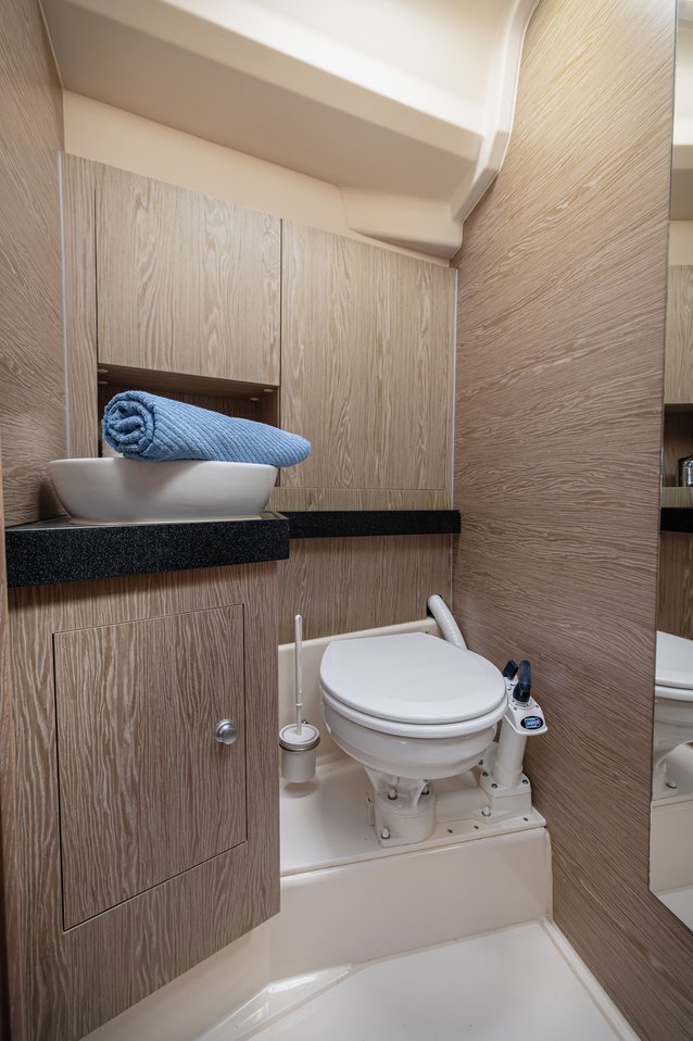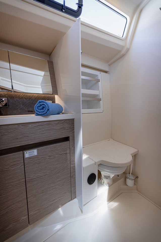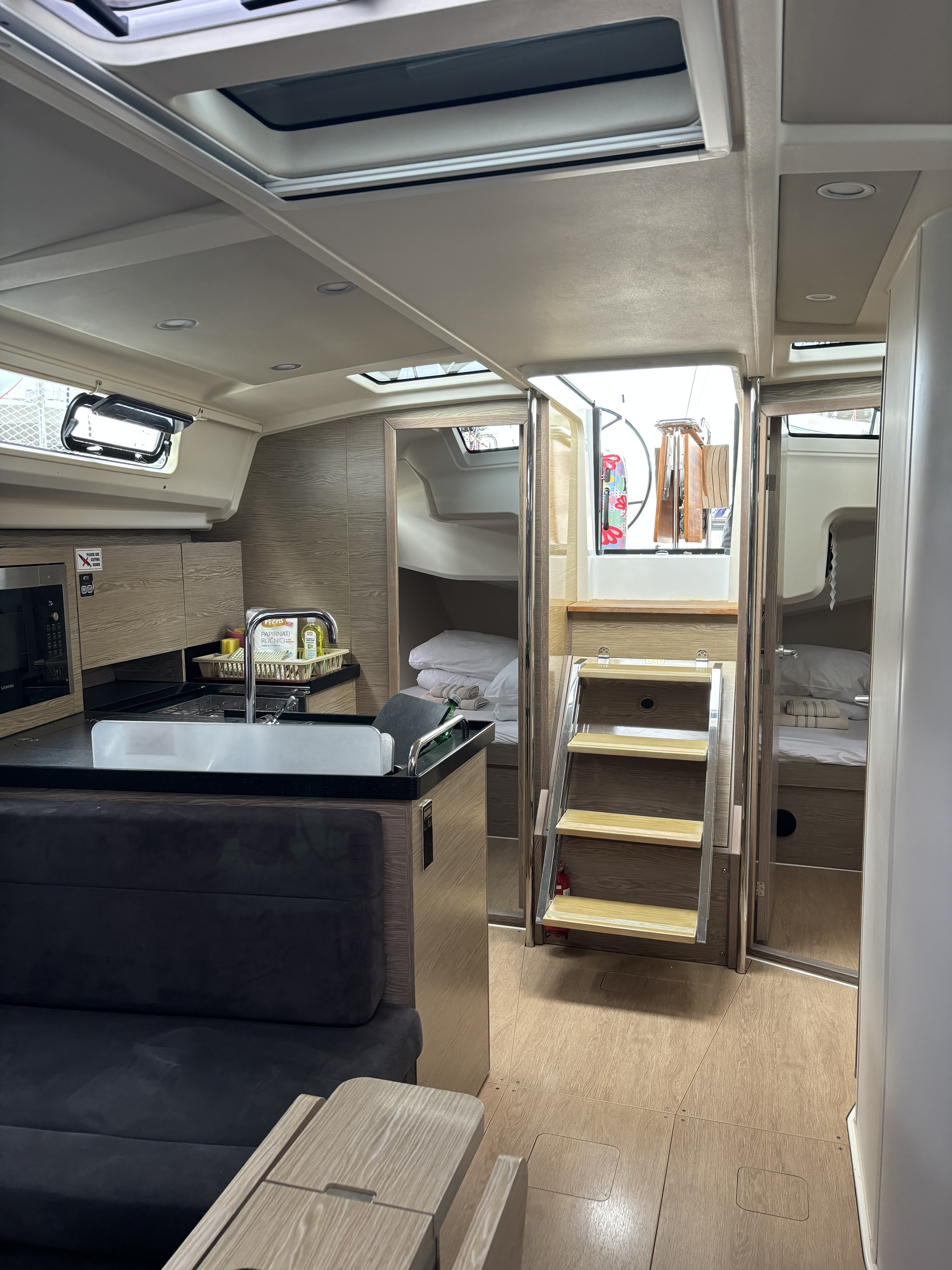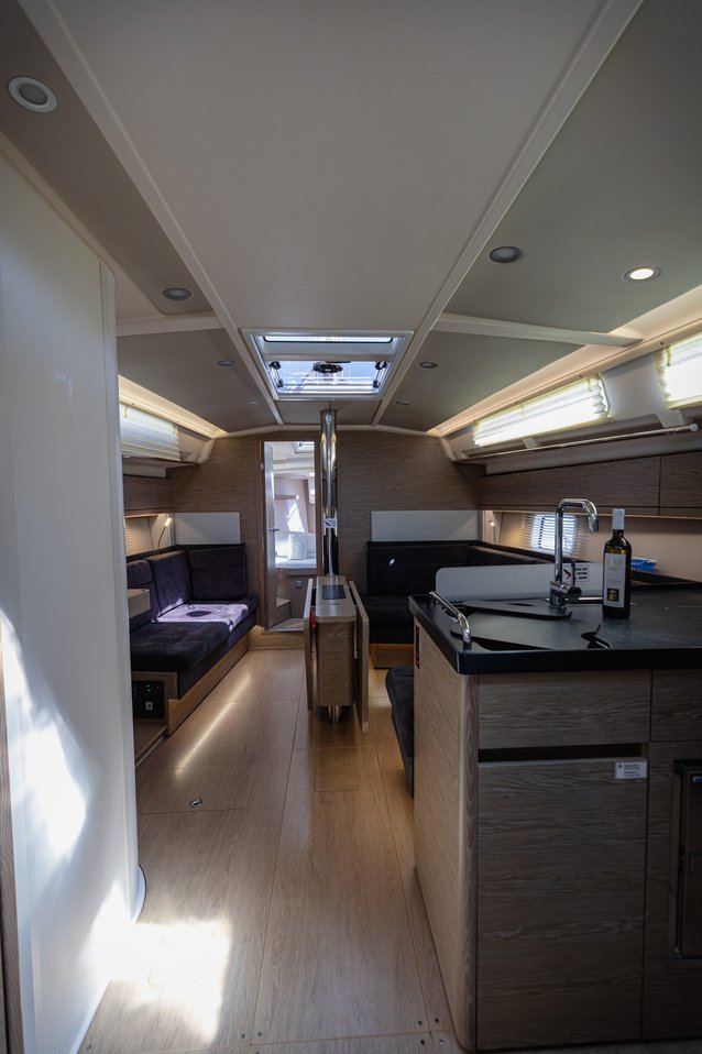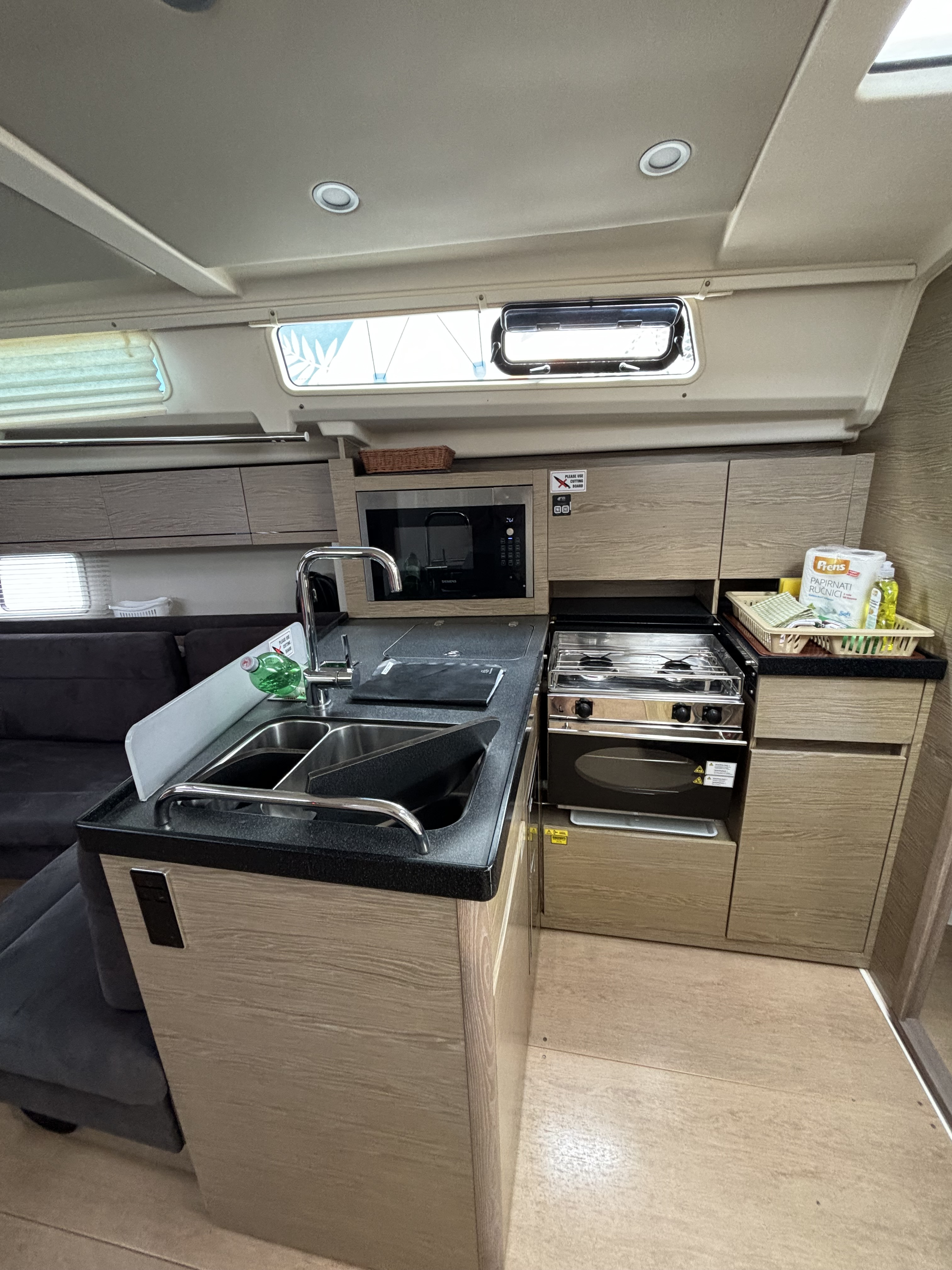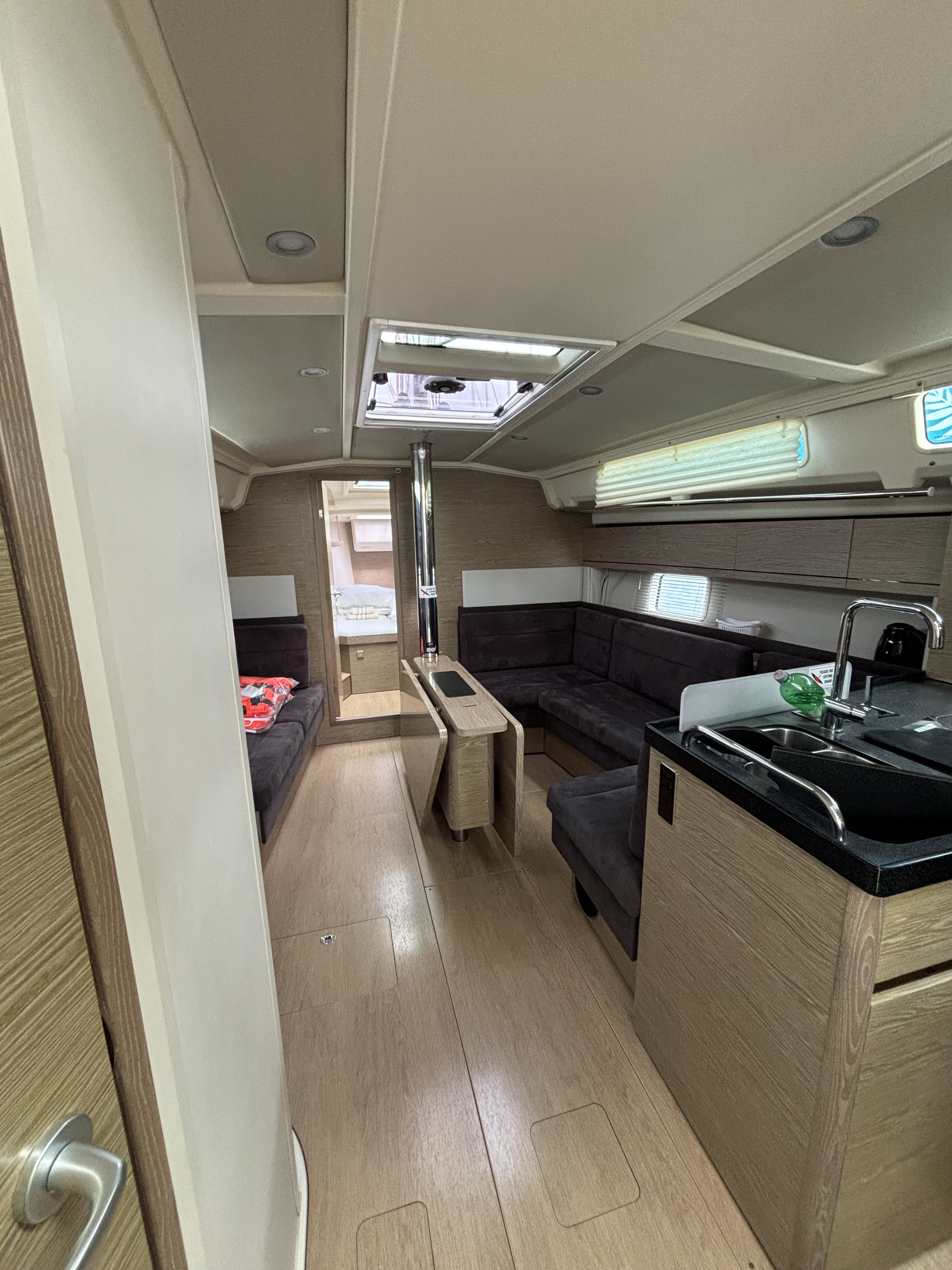 | Outside | Badeplattform, Biminitop, Cockpitdusche, Cockpitlautsprecher, Cockpittisch, elektr. Winsch, Solaranlage, Sprayhood, Teak im Cockpit, Winschen |