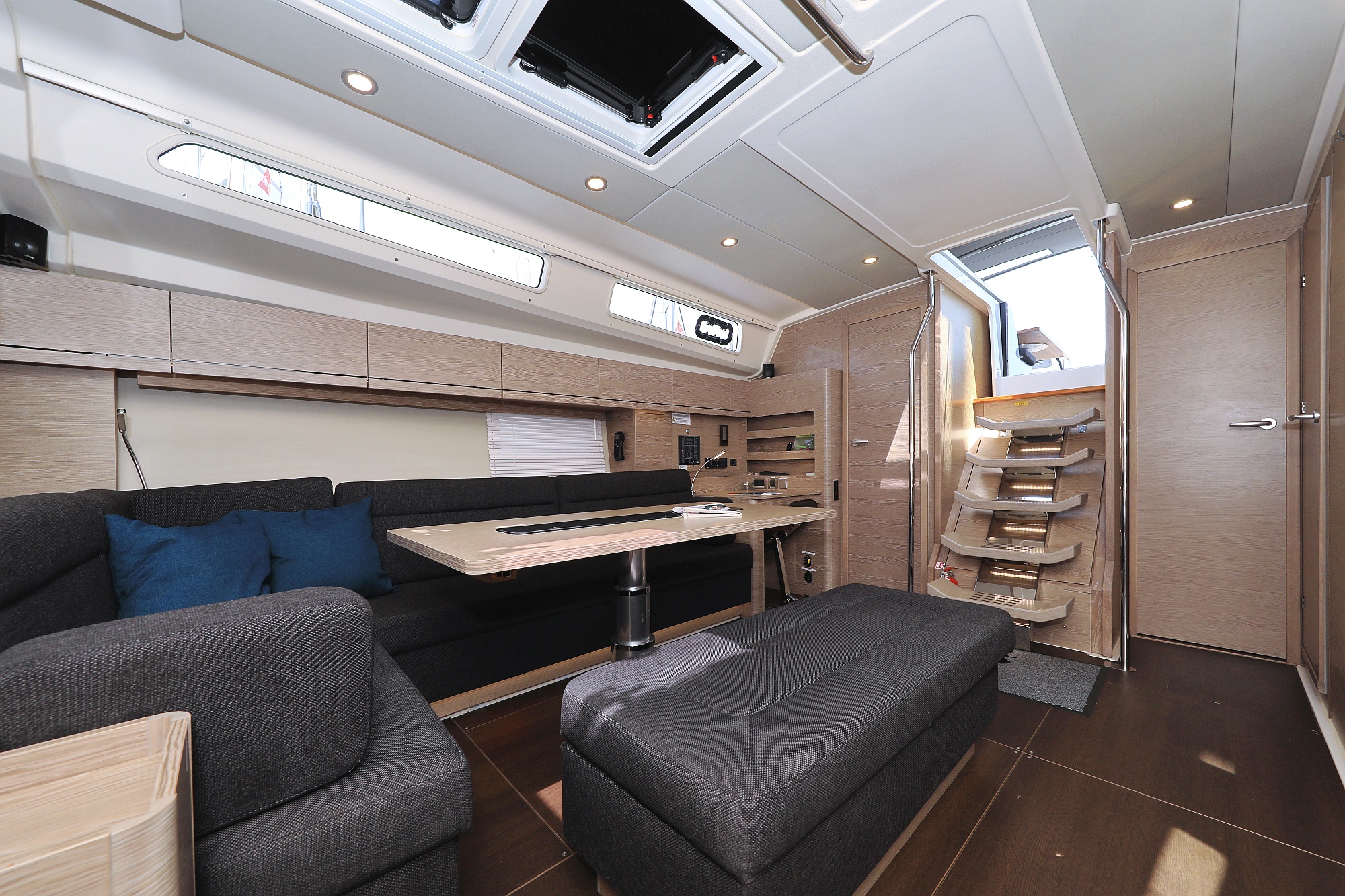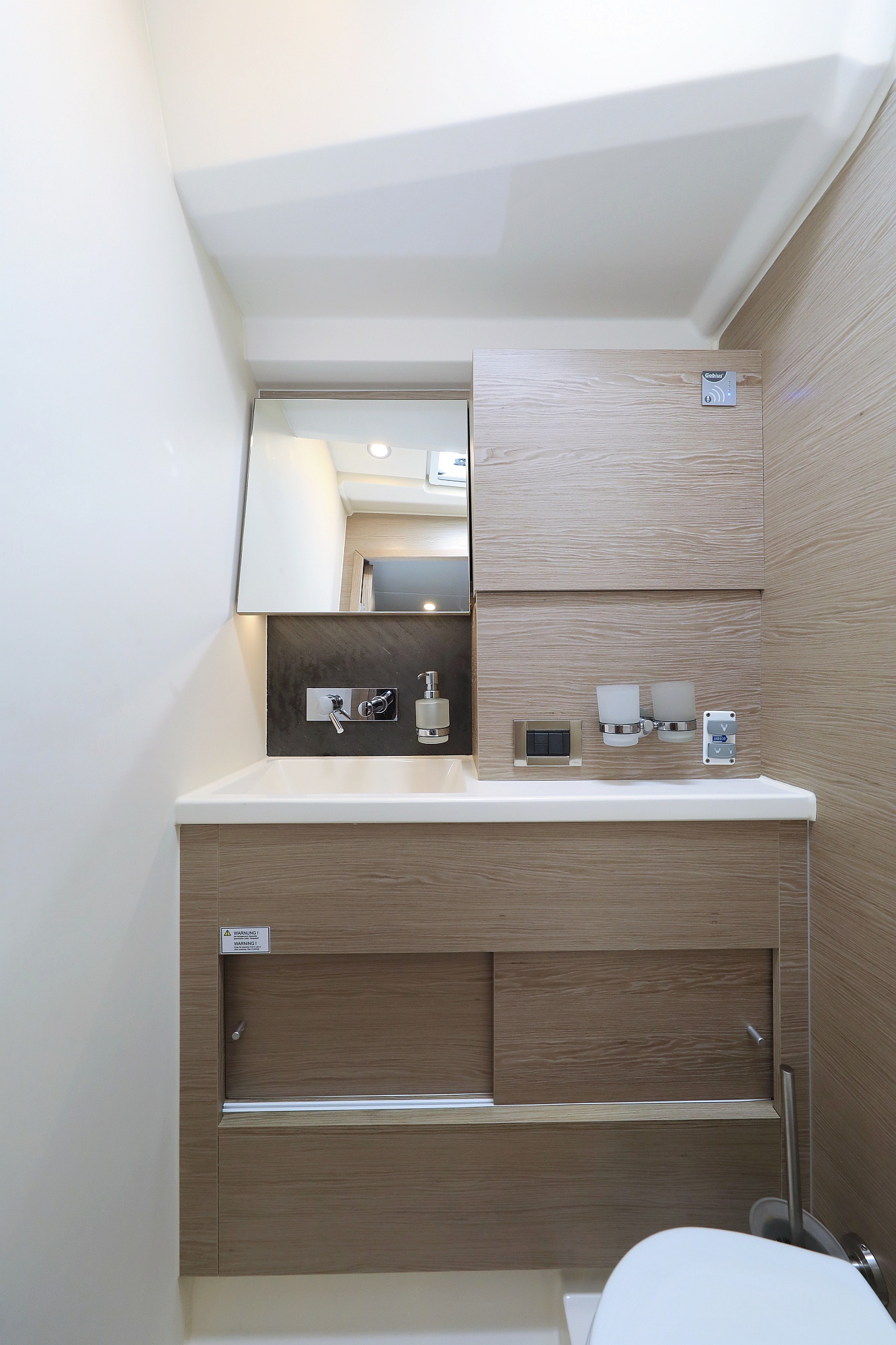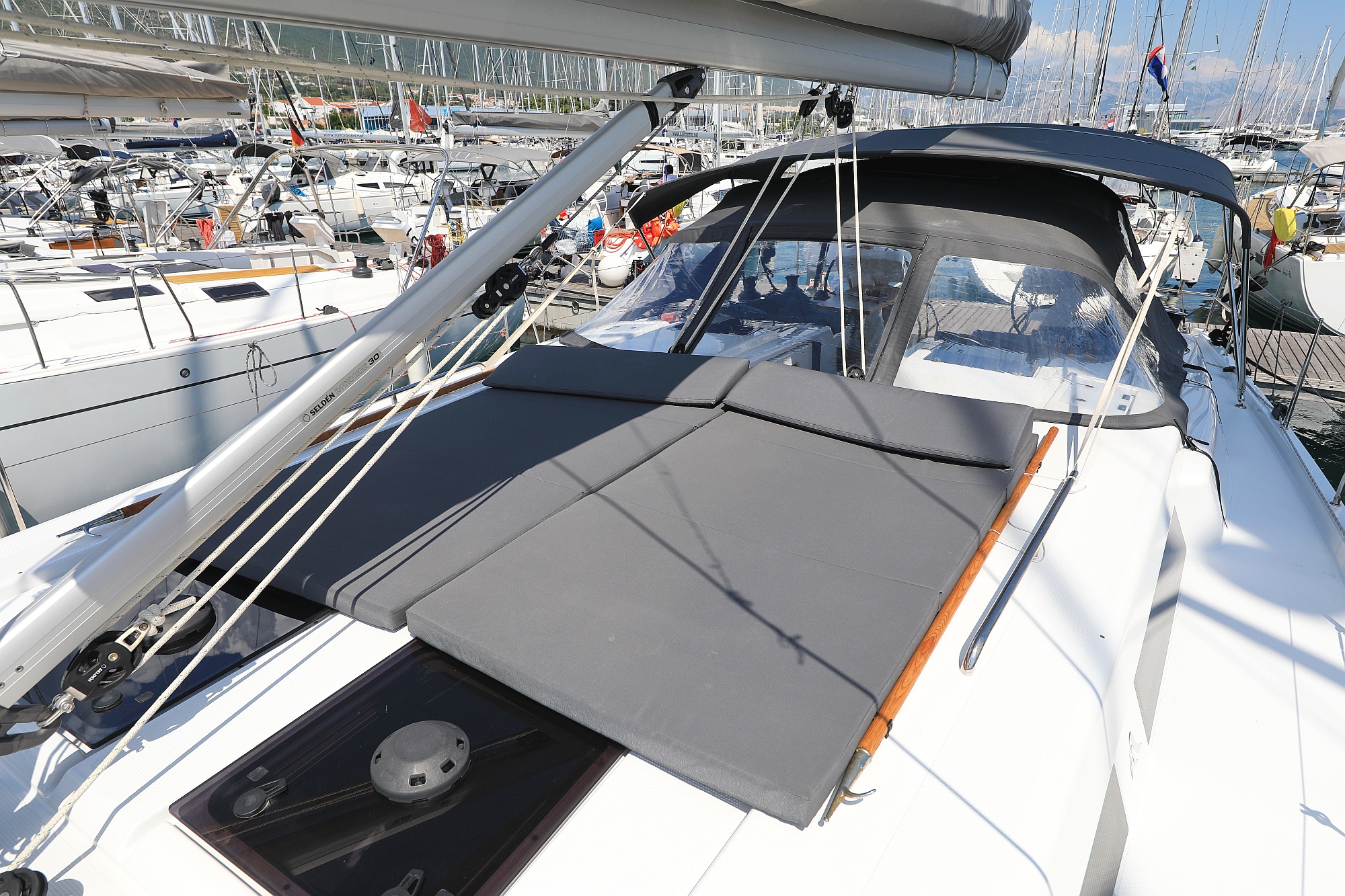 | Outside | Badeplattform (hydr.), Biminitop, Cockpitdusche, Cockpitlautsprecher, Cockpitpolster, Cockpittisch, Deckpolster, elektr. Ankerwinsch, Faltpropeller, Sprayhood, Teak im Cockpit |