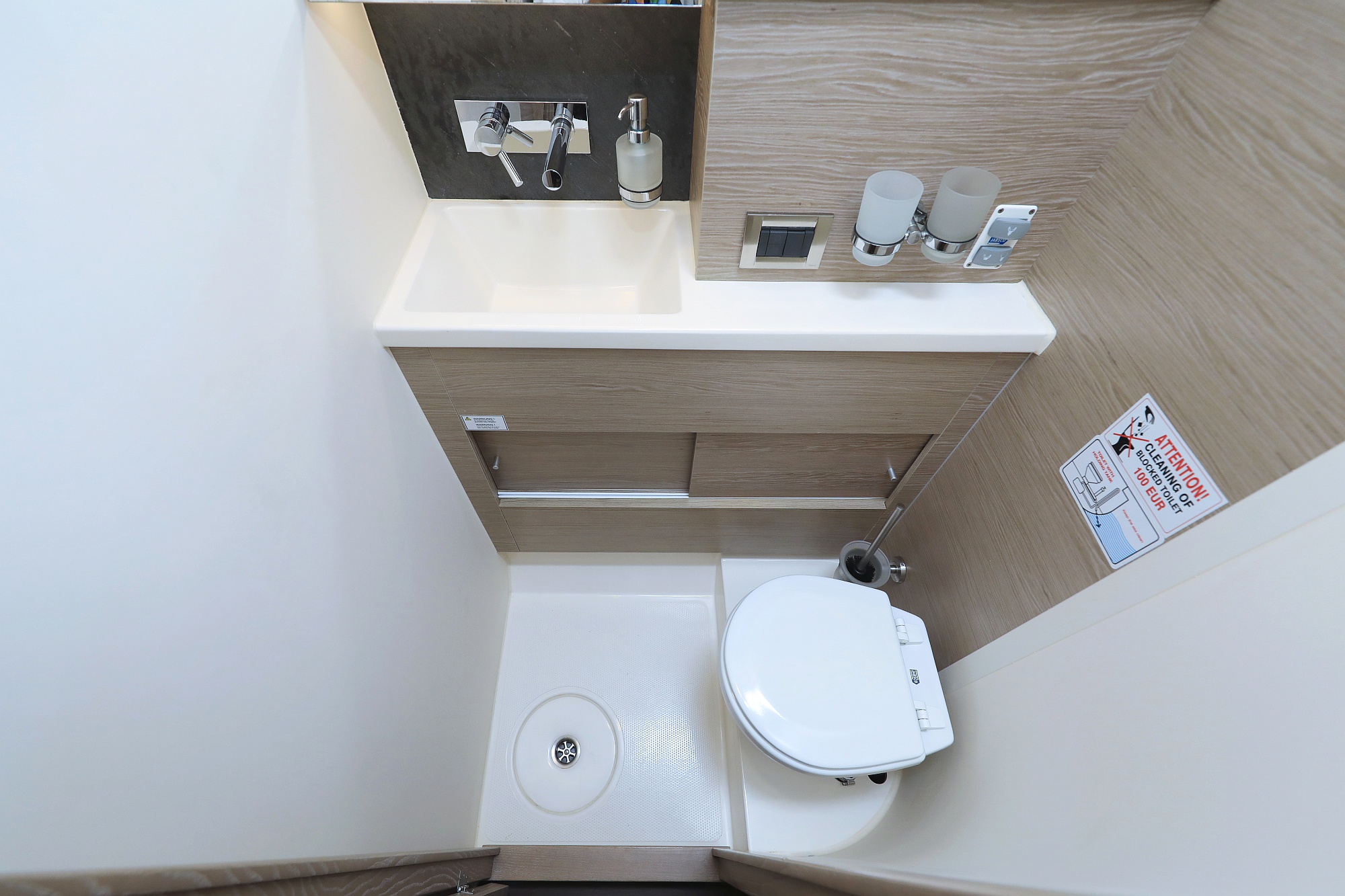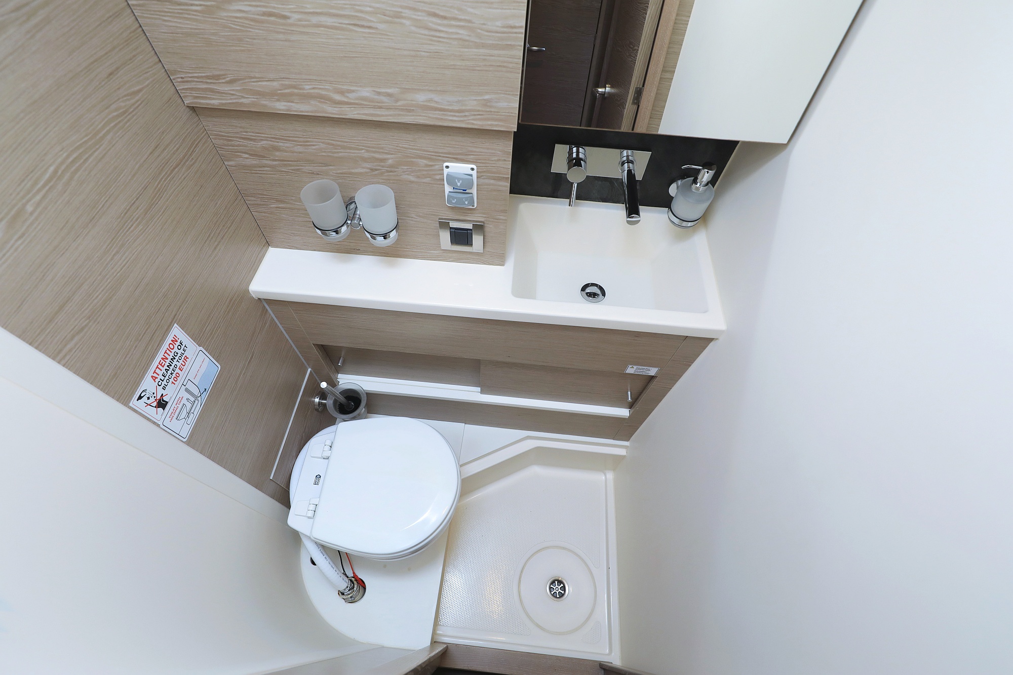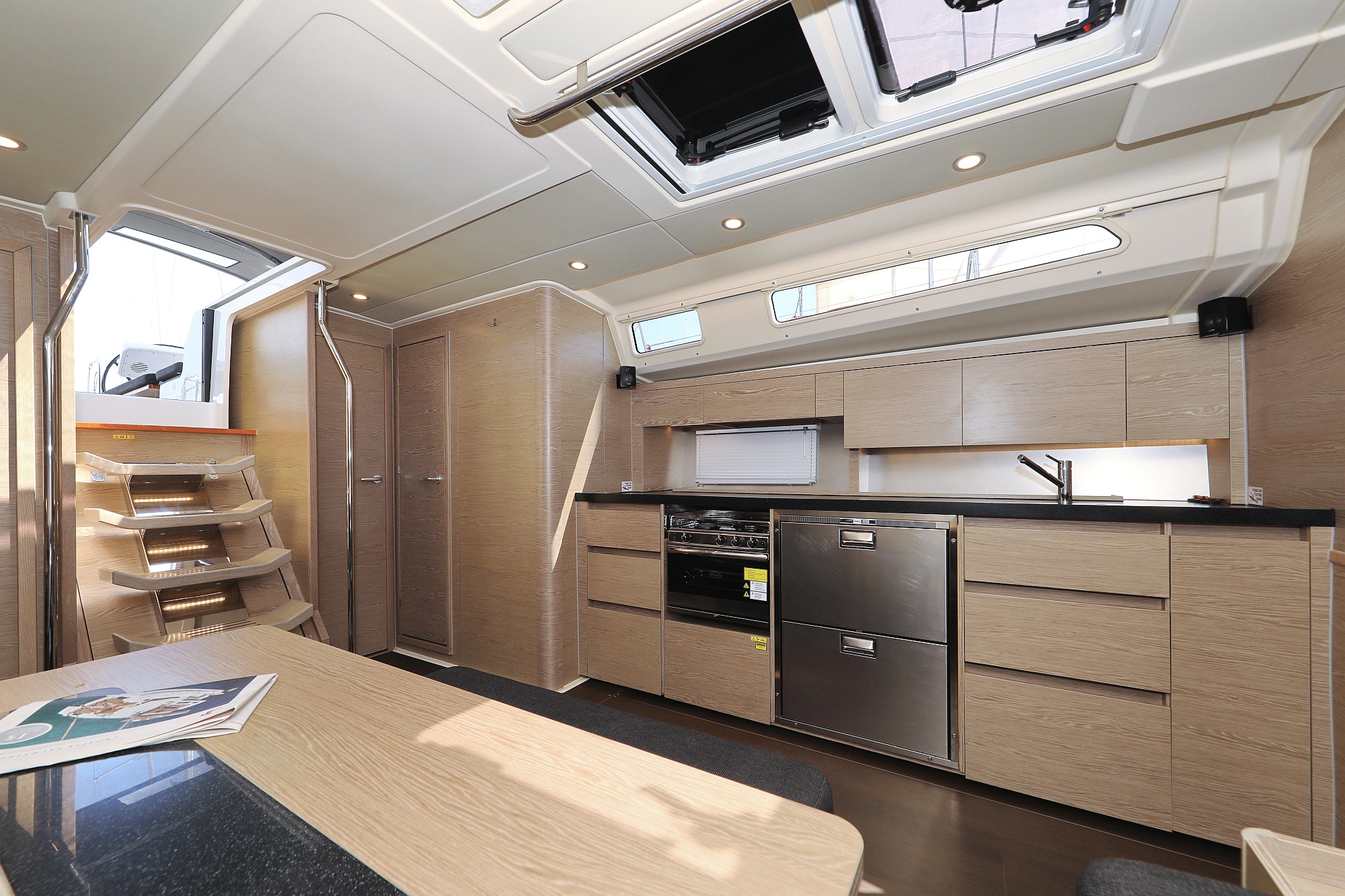 | Outside | Badeplattform (hydr.), Biminitop, Cockpitdusche, Cockpitlautsprecher, Cockpitpolster, Cockpittisch, Deckpolster, elektr. Ankerwinsch, Faltpropeller, Sprayhood, Teak im Cockpit |