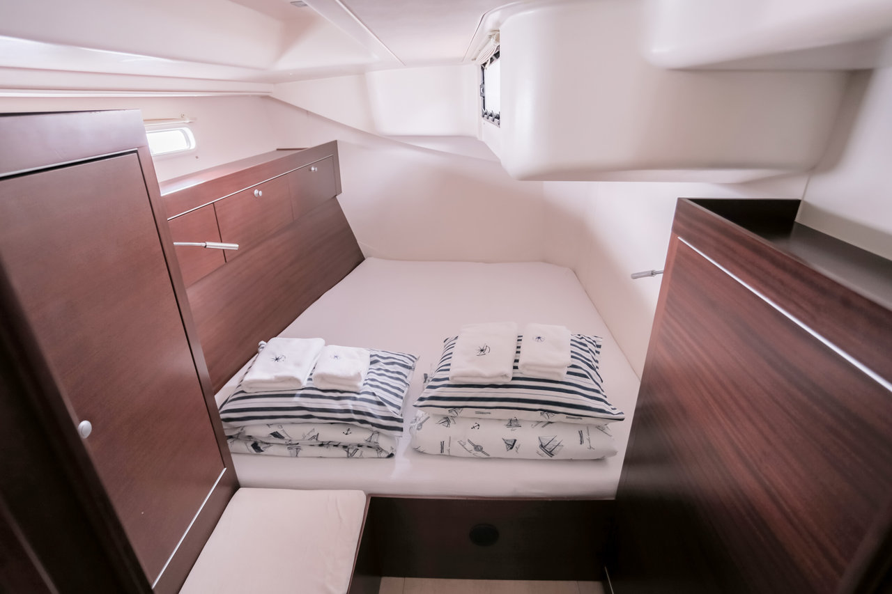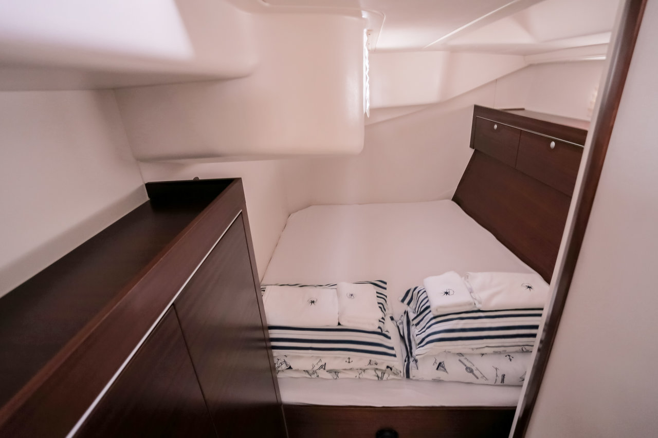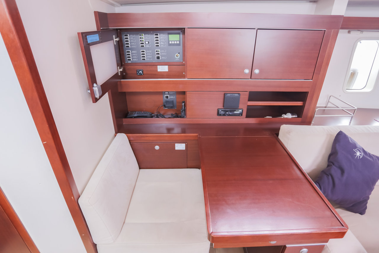 Autopilot, Bootsmannstuhl, Bordapotheke, Bordwerkzeug, Bugstrahlruder, elektr. Bilgepumpe, Feststoffschwimmwesten, Feuerlöscher, Nebelhorn, Notsignale, Radarreflektor, Rettungsinsel, Rettungskragen, Sicherheitsgurt, UKW-Funk, UKW-Funk m. DSC, Zweitanker |