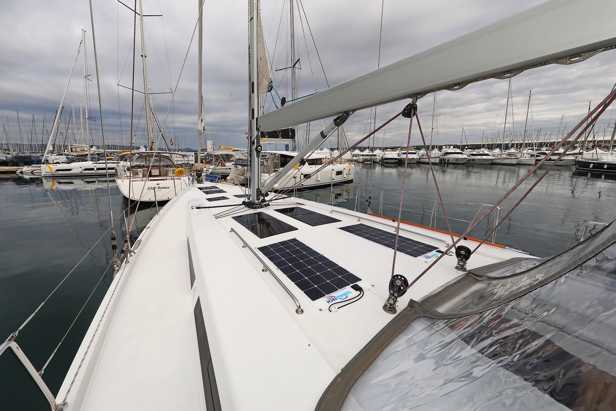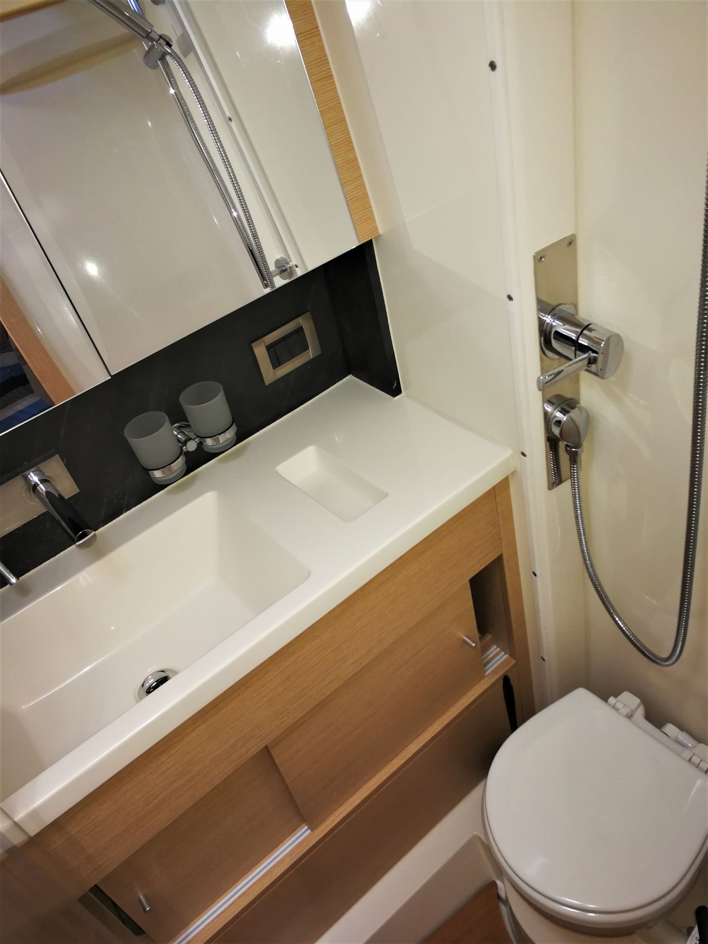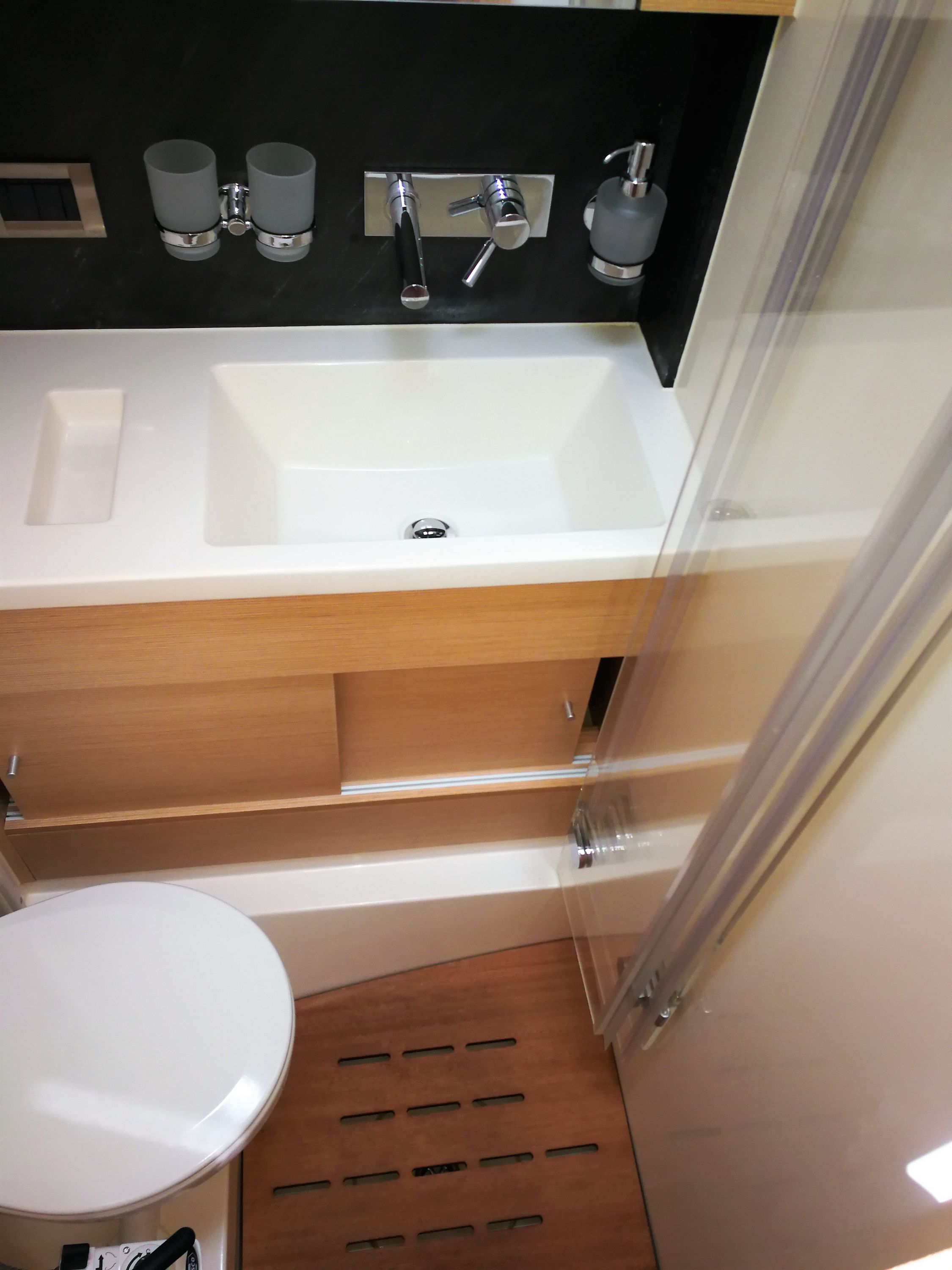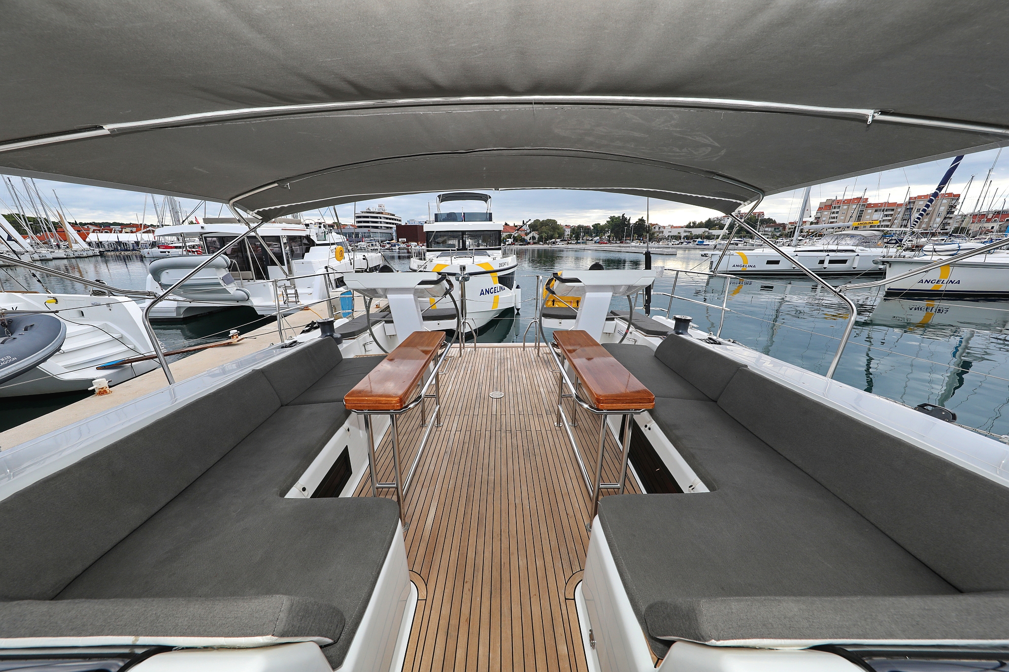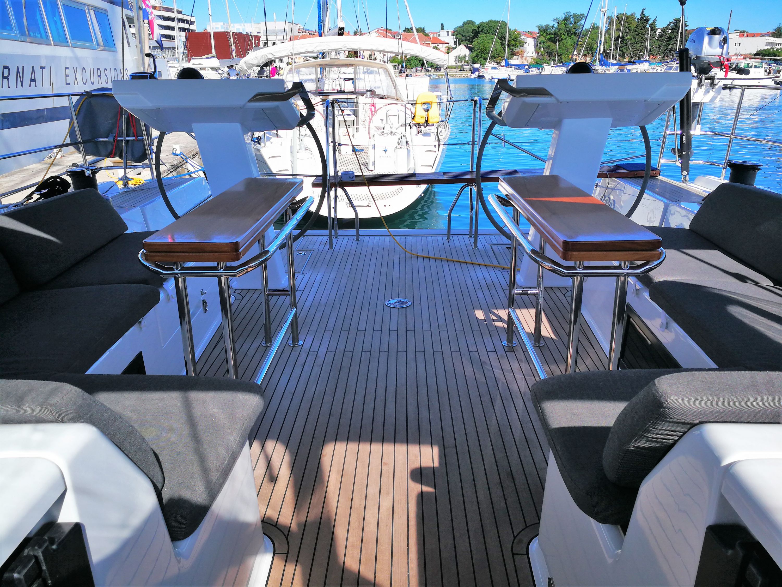 | Outside | Badeplattform (hydr.), Biminitop, Bootshaken, Cockpitdusche, Cockpitlautsprecher, Cockpitpolster, Cockpittisch, Delta-Anker, elektr. Ankerwinsch, Faltpropeller, Fender, Festmacherleinen, Gangway, Solaranlage, Sprayhood, Teak auf Badeplattform, Teak im Cockpit, Wasserschlauch, Winschen |