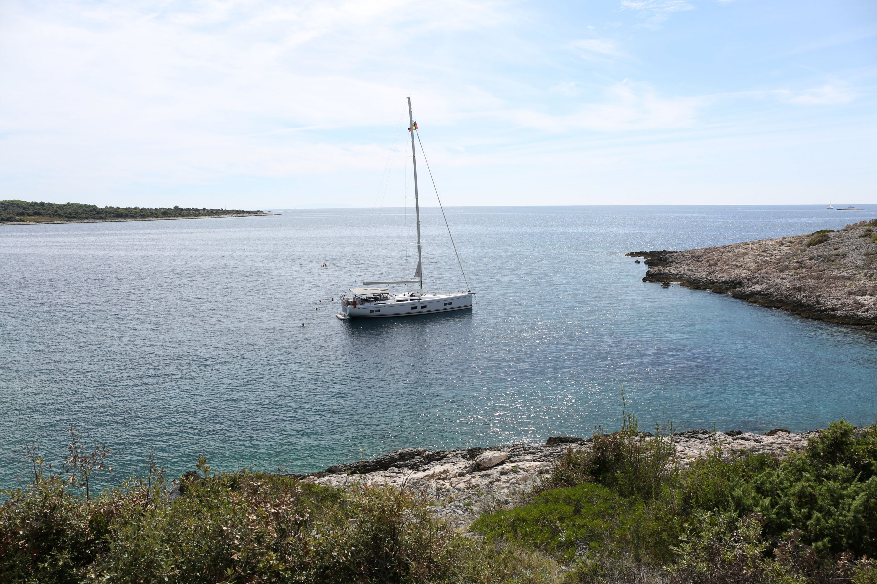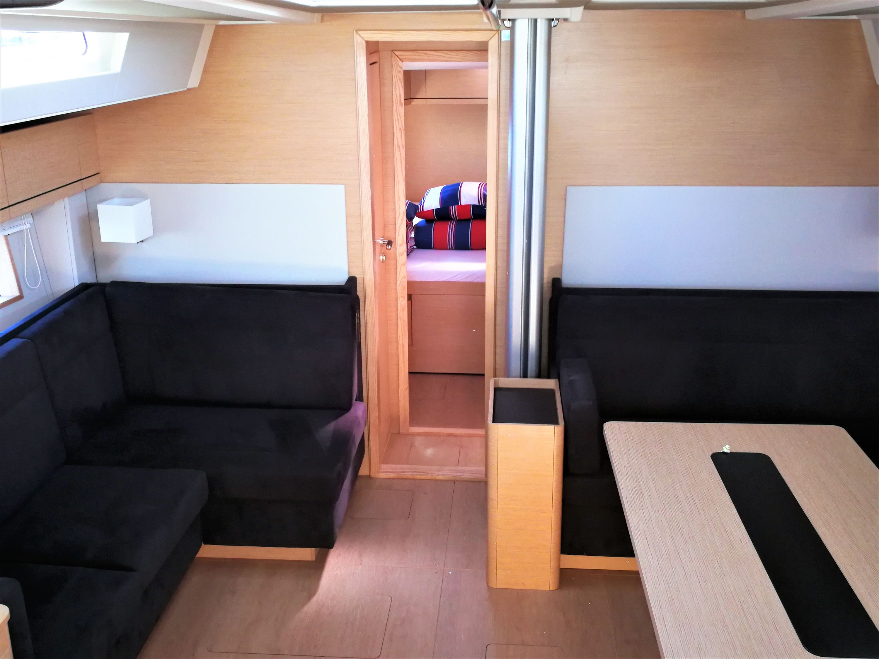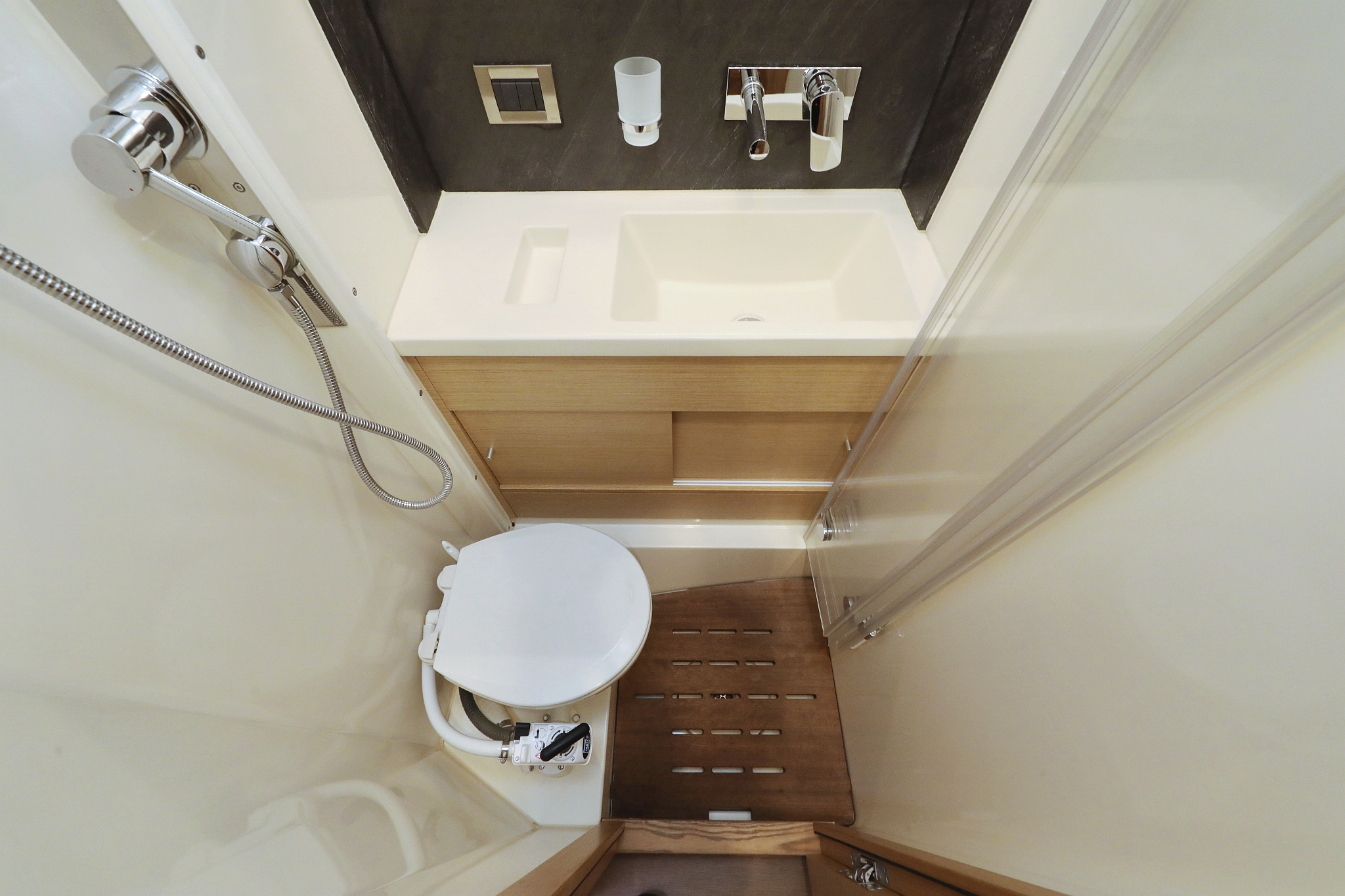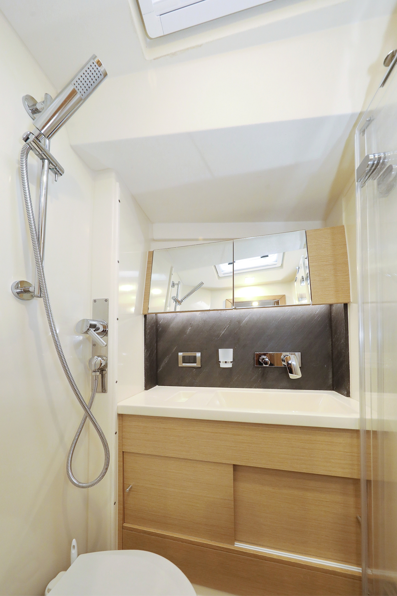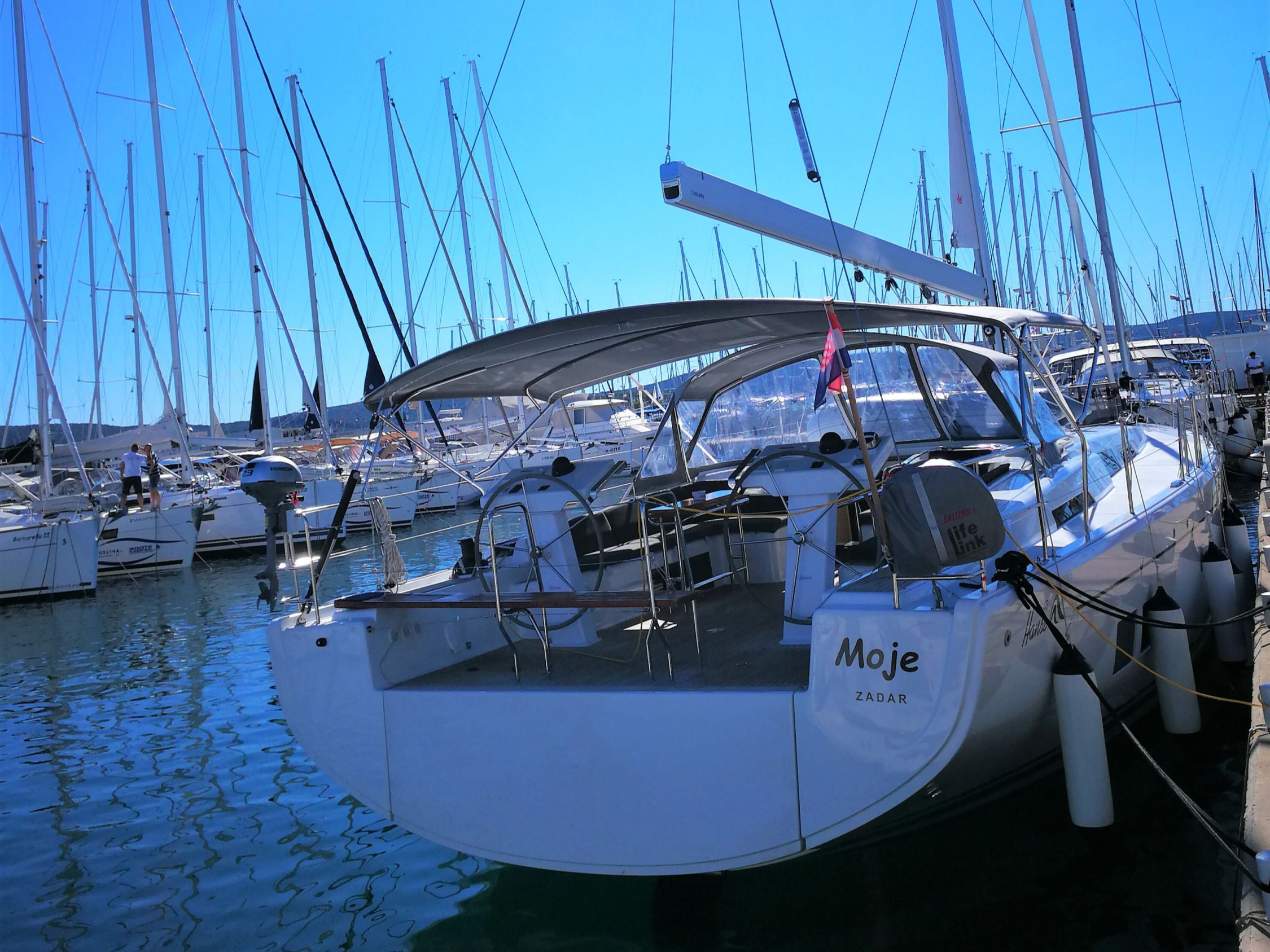 | Outside | Badeplattform (hydr.), Biminitop, Bootshaken, Cockpitdusche, Cockpitlautsprecher, Cockpitpolster, Cockpittisch, Delta-Anker, elektr. Ankerwinsch, Faltpropeller, Fender, Festmacherleinen, Gangway, Solaranlage, Sprayhood, Teak auf Badeplattform, Teak im Cockpit, Wasserschlauch, Winschen |