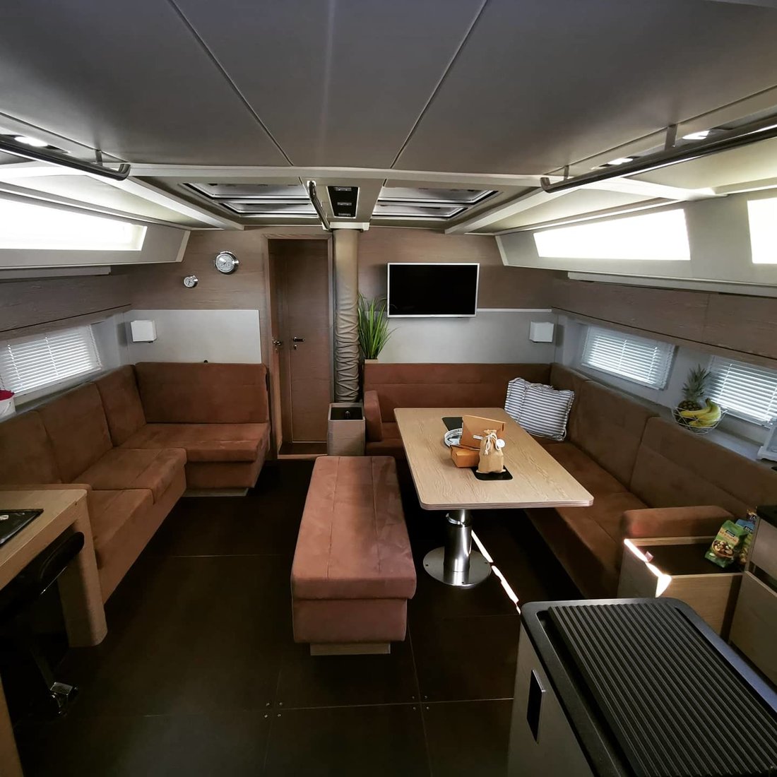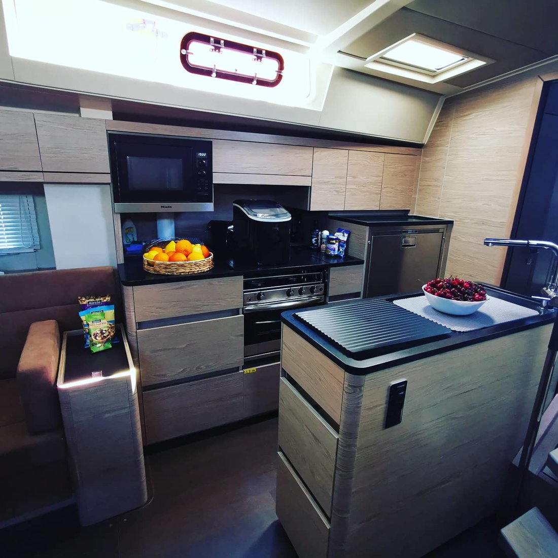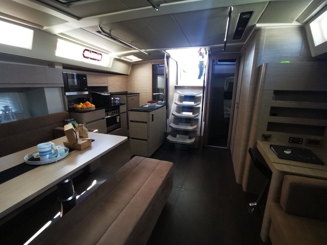 | Outside | 220 V-Landanschluss, Anker mit Kette, Biminitop, Cockpitdusche, Cockpitlautsprecher, Cockpitpolster, Cockpittisch, elektr. Ankerwinsch, Fender, Festmacherleinen, Gangway, Sprayhood |