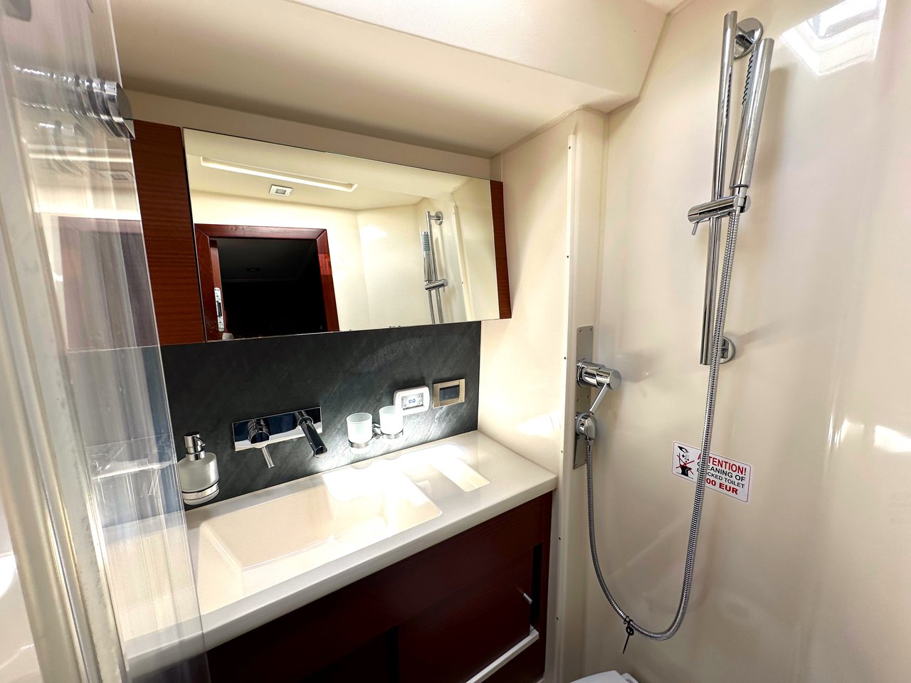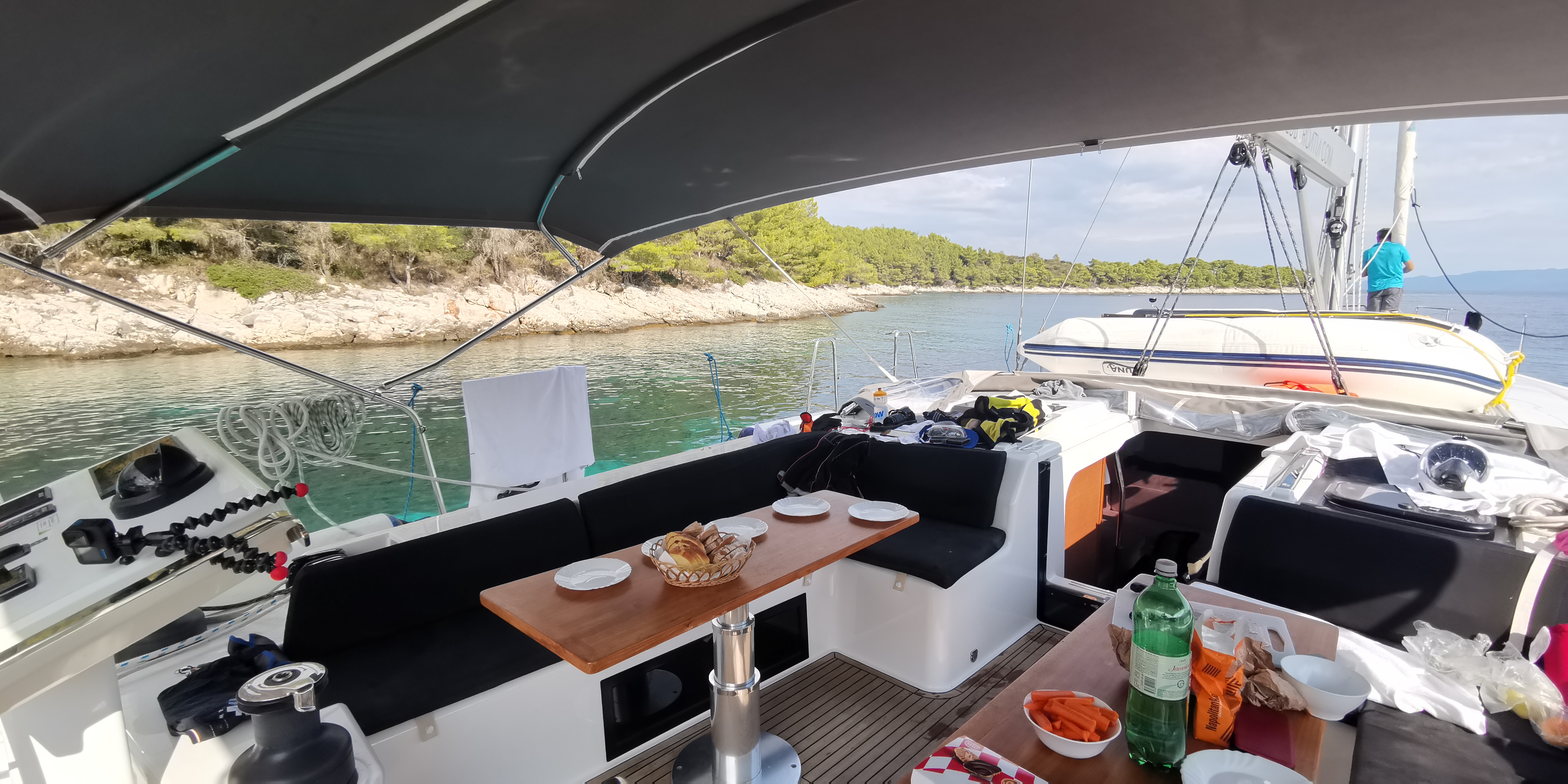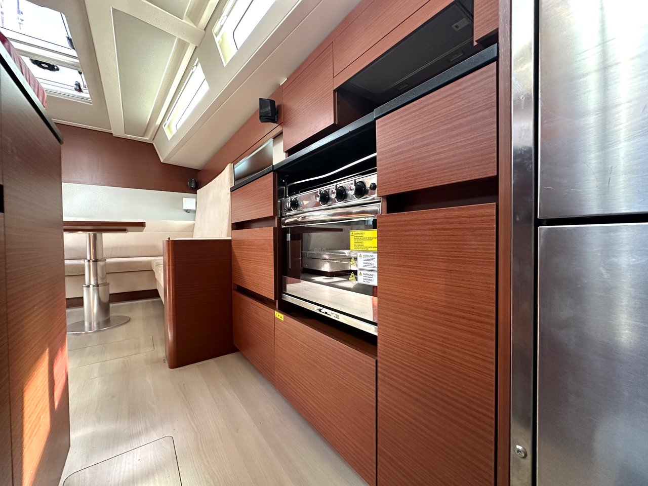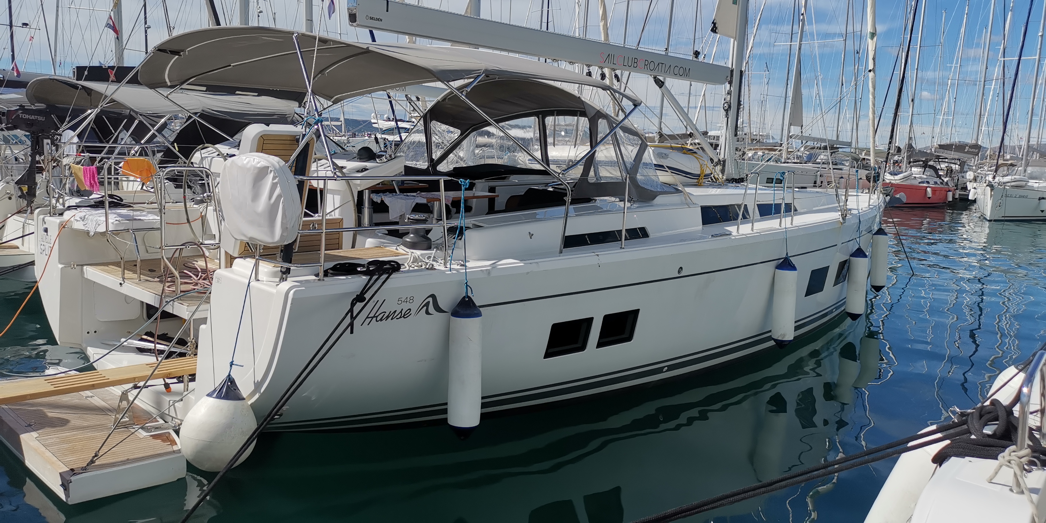 | Outside | Badeplattform (hydr.), Biminitop, Cockpitdusche, Cockpitlautsprecher, Cockpitpolster, Cockpittisch, elektr. Ankerwinsch, elektr. Großwinsch, Sprayhood, Teak im Cockpit |