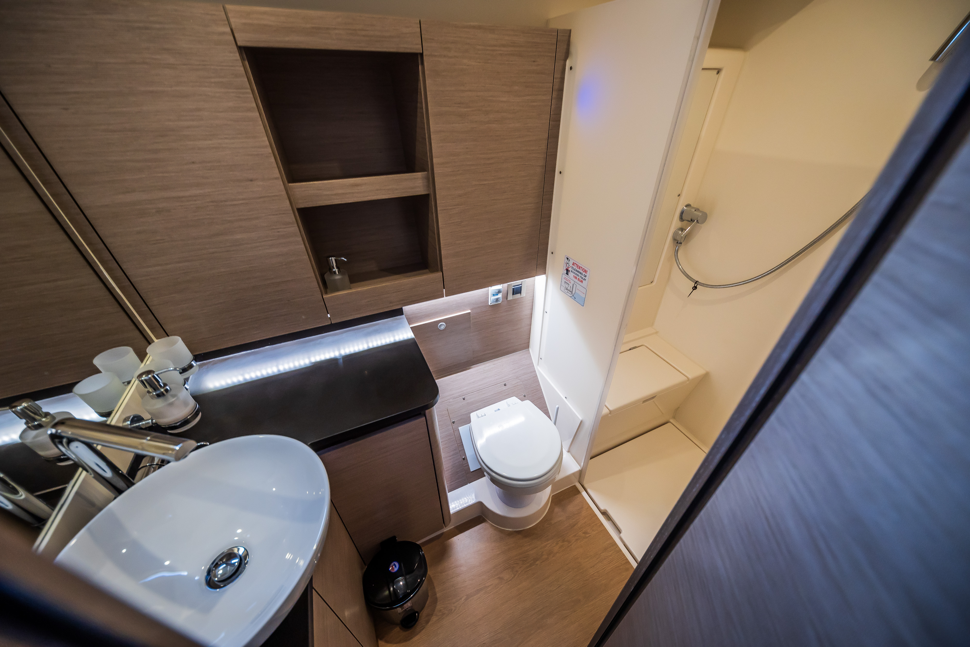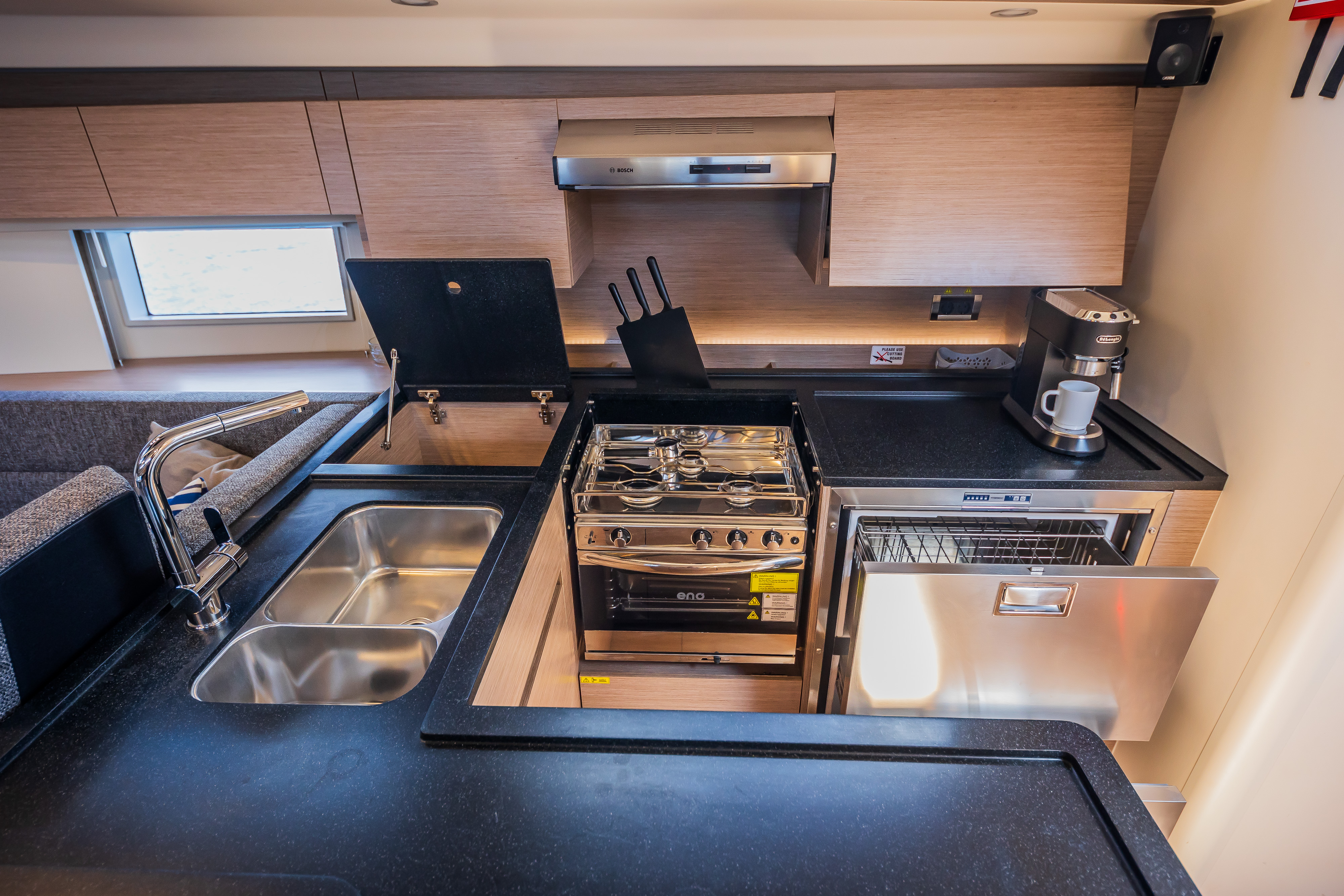 | Inside | Gasherd mit Backofen, Gefrierschrank, Generator, Heizung, Inverter 12V/220V, Klimaanlage (ohne Landstrombedarf), Kühlschrank, Ladegerät, Pantryausstattung, Radio mit CD, TV, Warmwasser, Watermaker, WC (elektr.) |