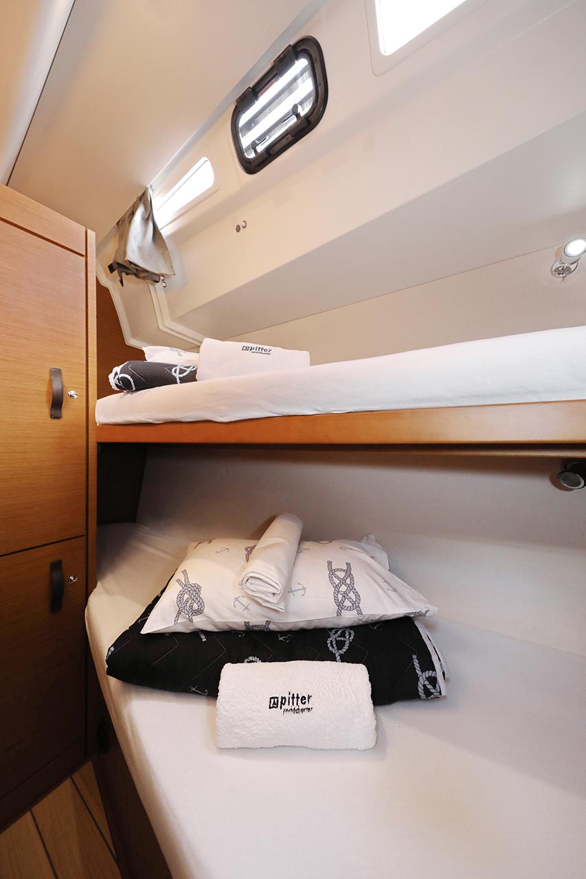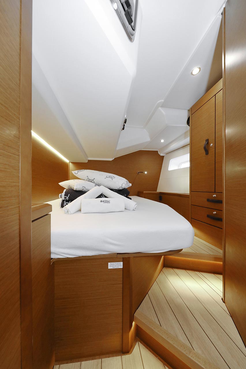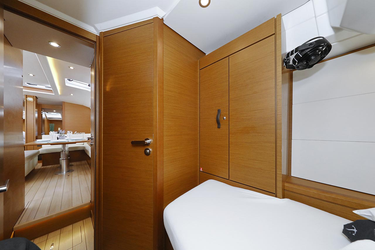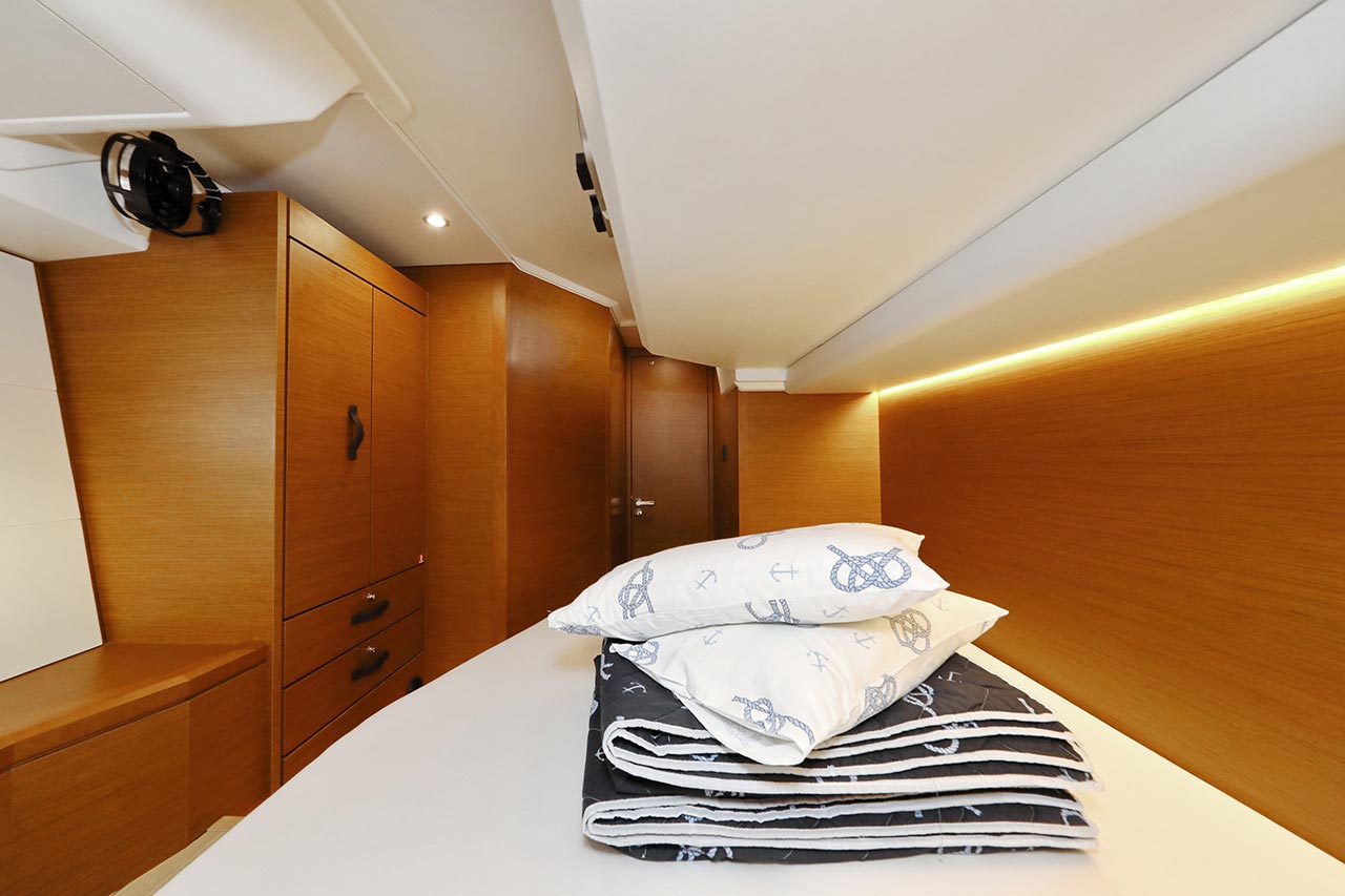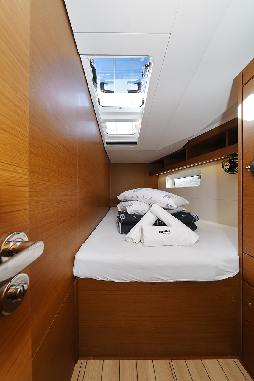 | Safety | Automatikwesten, Autopilot, Blitzboje, Bootsmannstuhl, Bordapotheke, Bordwerkzeug, Bugstrahlruder, Feuerlöscher, Lifebelts, Motor-Ersatzteile, Nebelhorn, Notsignale, Radarreflektor, Reparaturset für Beiboot, Rettungsinsel, Suchscheinwerfer, Taschenlampe, UKW-Funk mit AIS, Zweitanker |