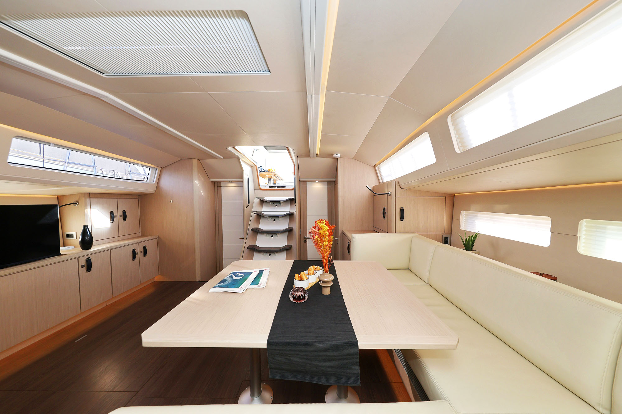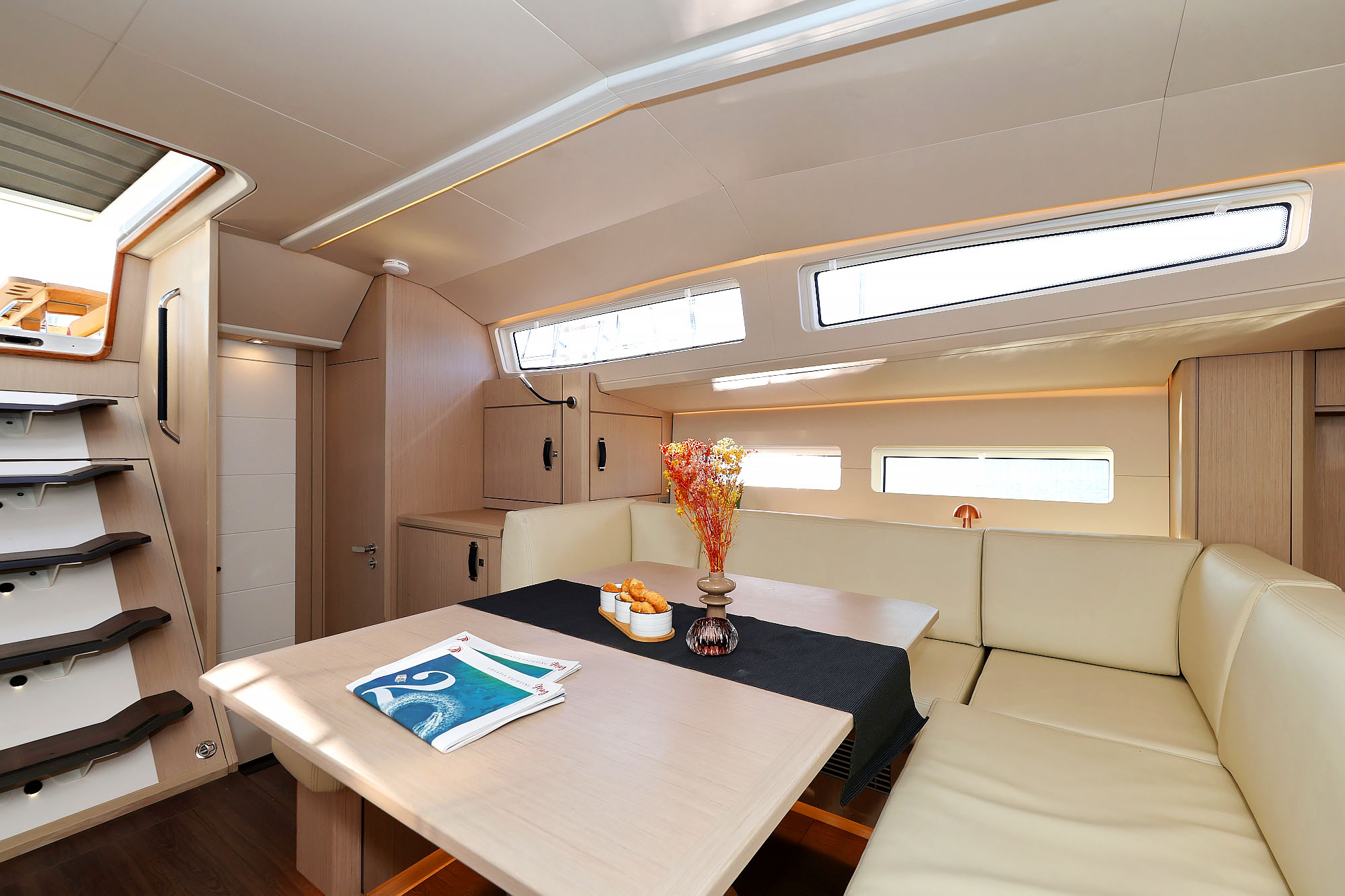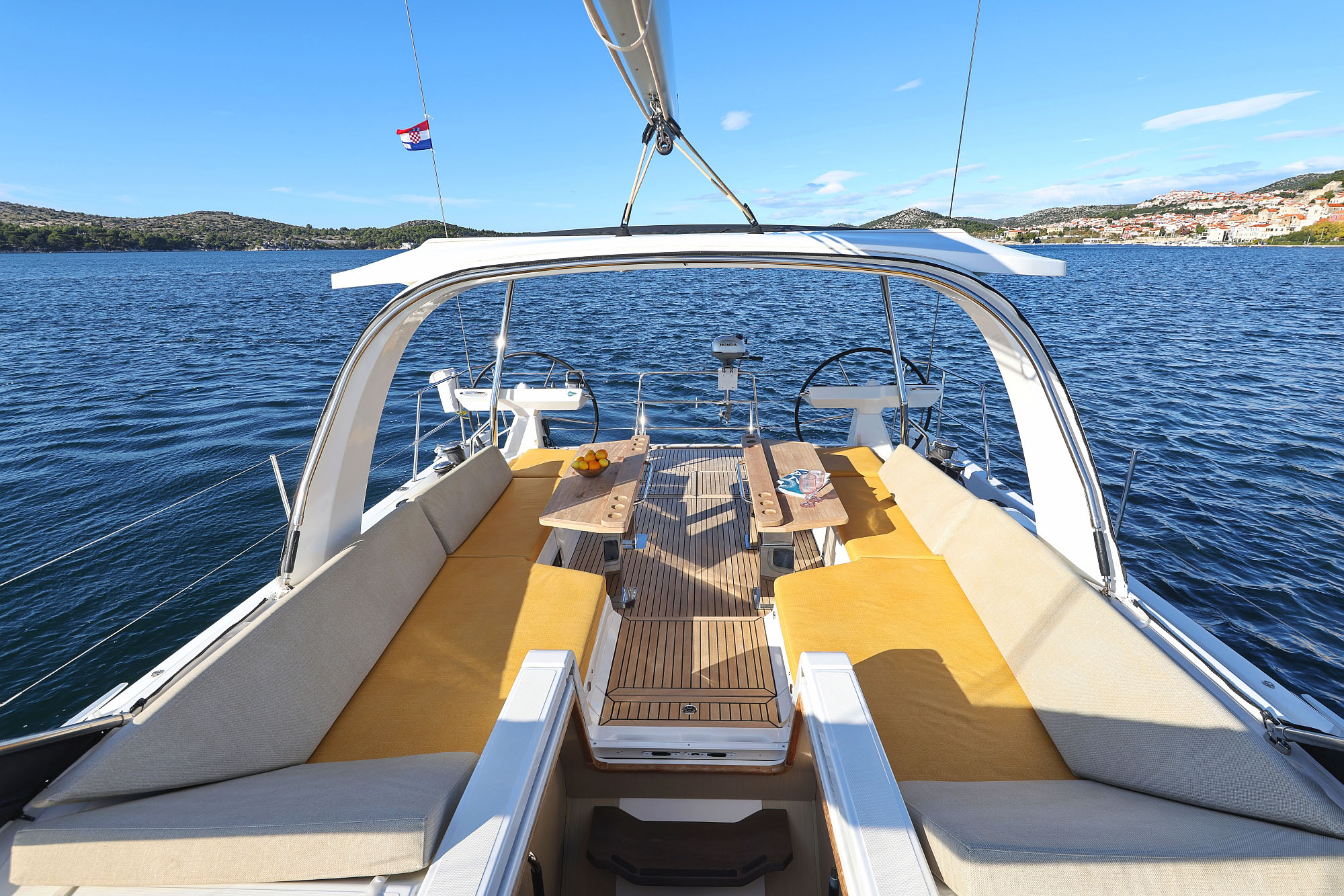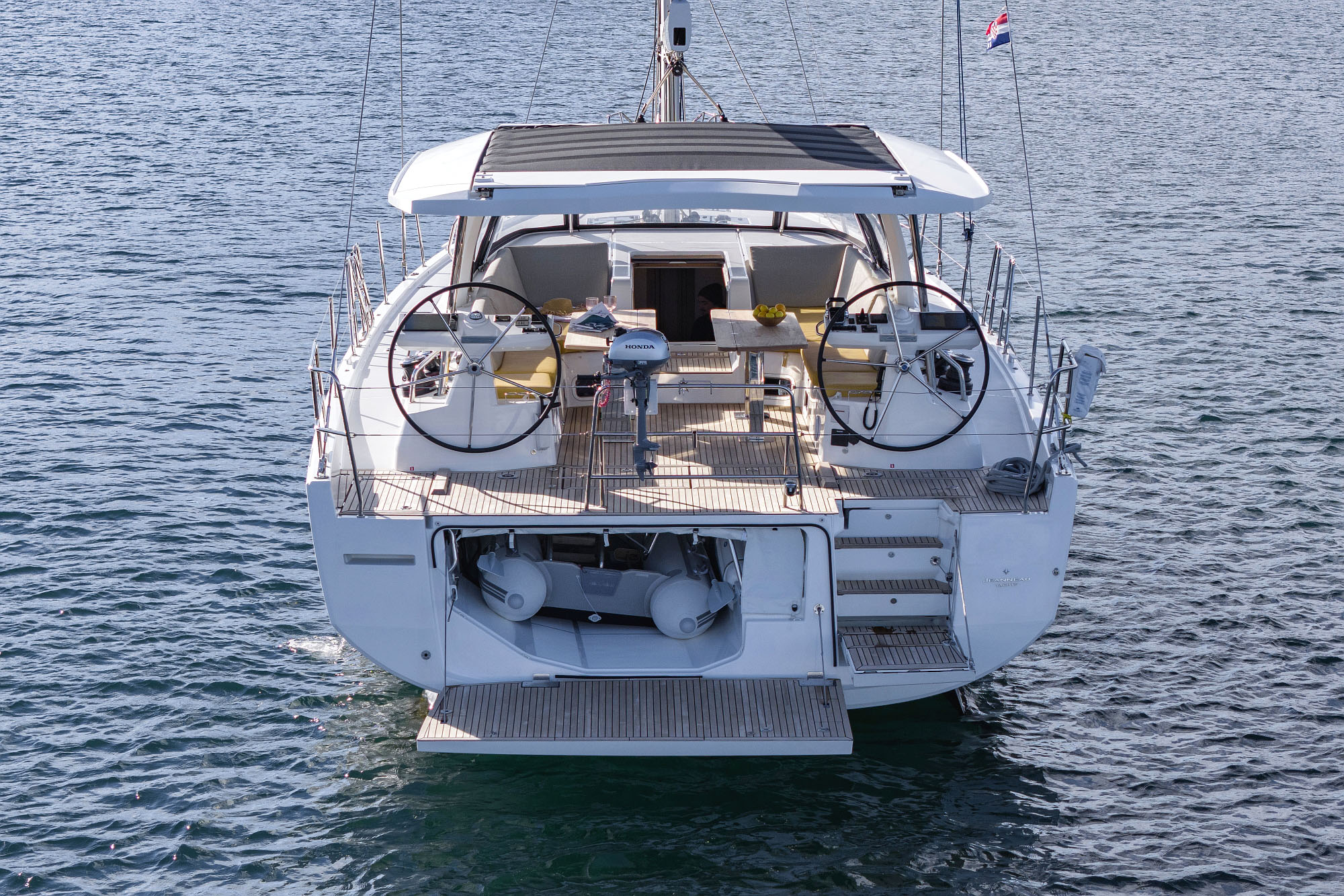 | Outside | Badeplattform (hydr.), Cockpitdusche, Cockpitlautsprecher, Cockpitpolster, Cockpittisch, Cockpittisch (klappbar), Hardtop, Sprayhood, Teak im Cockpit, Unterwasserbeleuchtung |
