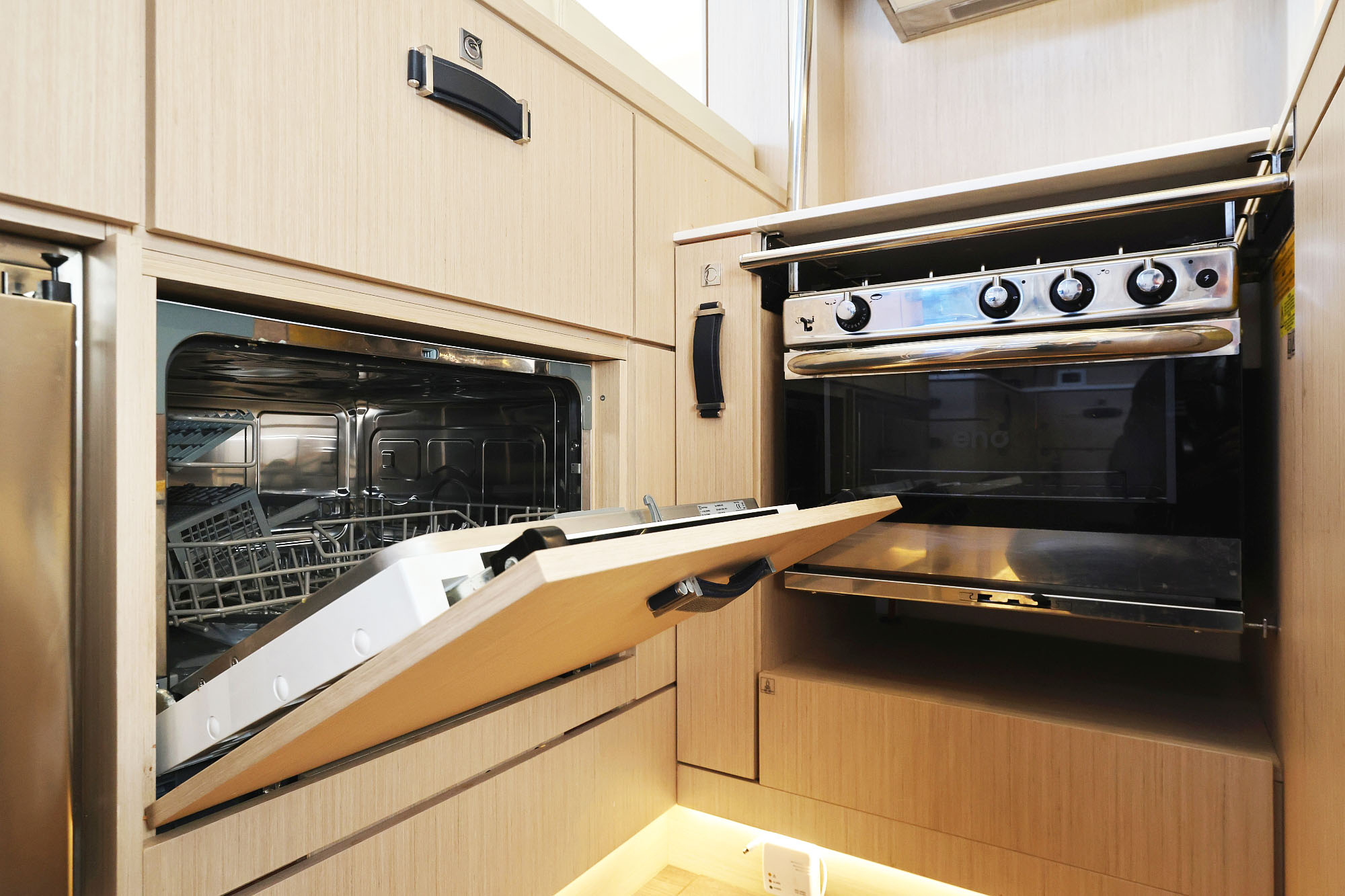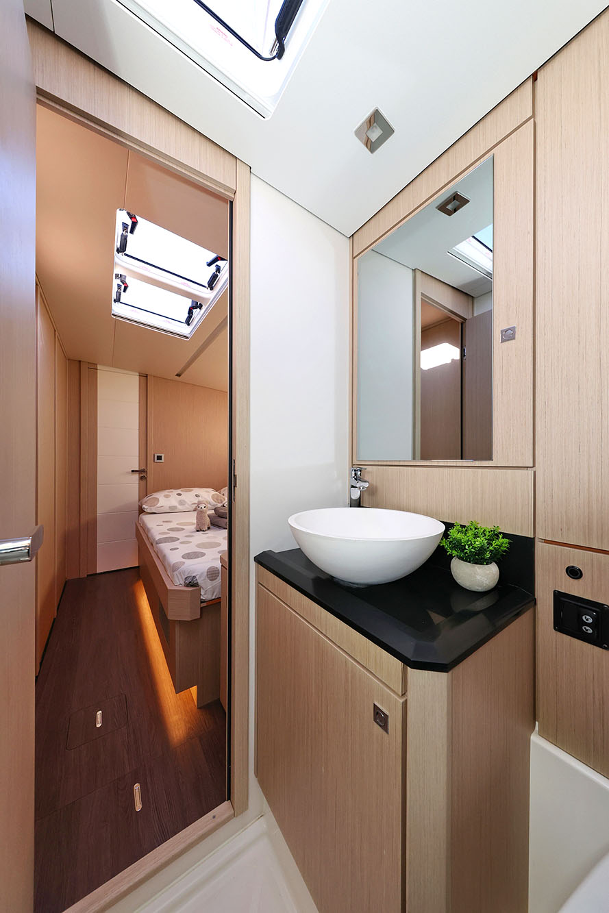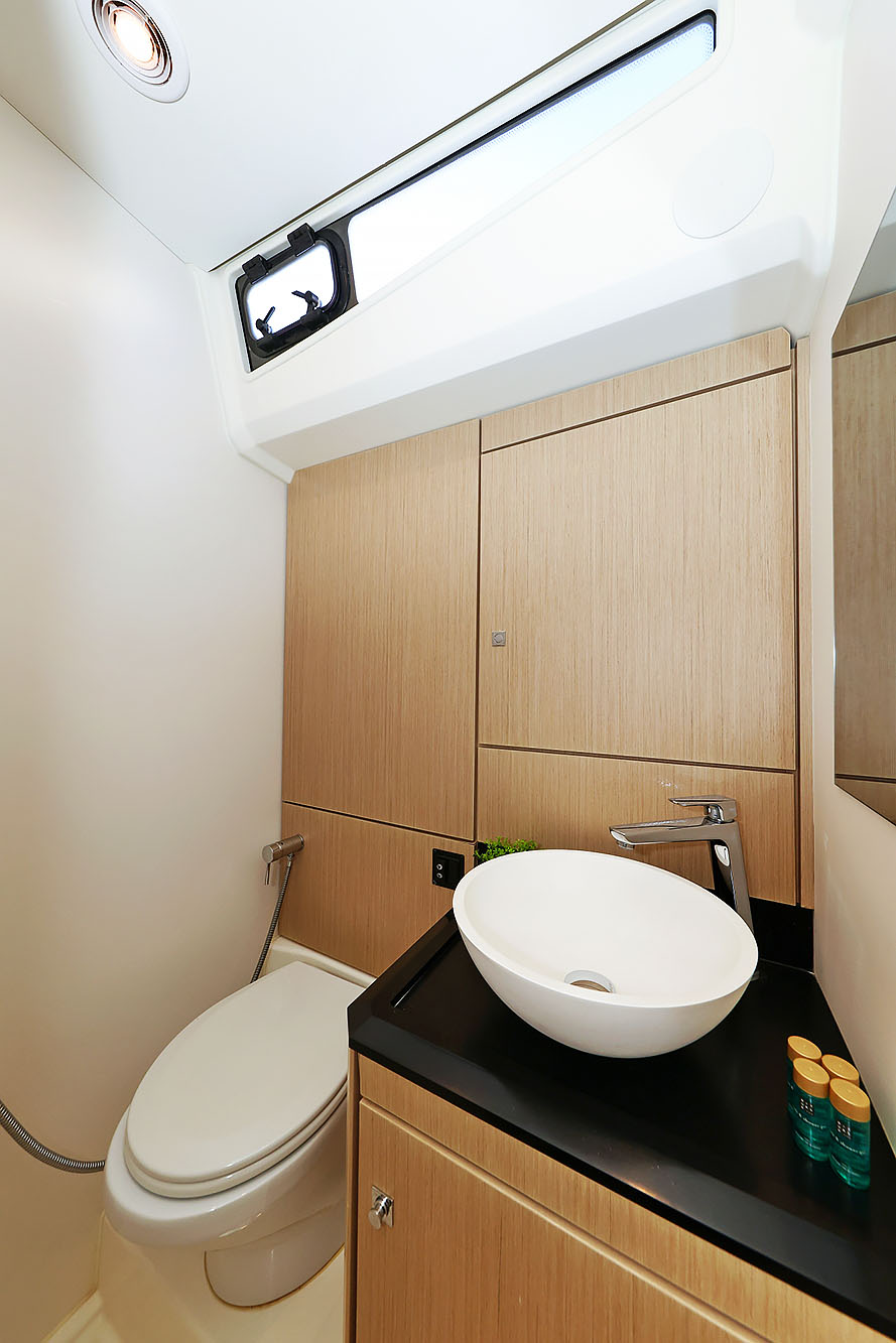 | Inside | 2. Kühlschrank, Backofen, Eiswürfelmaschine, Gasherd, Gefrierschrank, Generator, Geschirrspüler, Heizung, Inverter 12V/220V, Kaffeemaschine, Klimaanlage (ohne Landstrombedarf), Kühlschrank, Ladegerät, Lautsprecher im Salon, Pantryausstattung, Radio mit CD, TV, Warmwasser, Watermaker, WC (elektr.) |