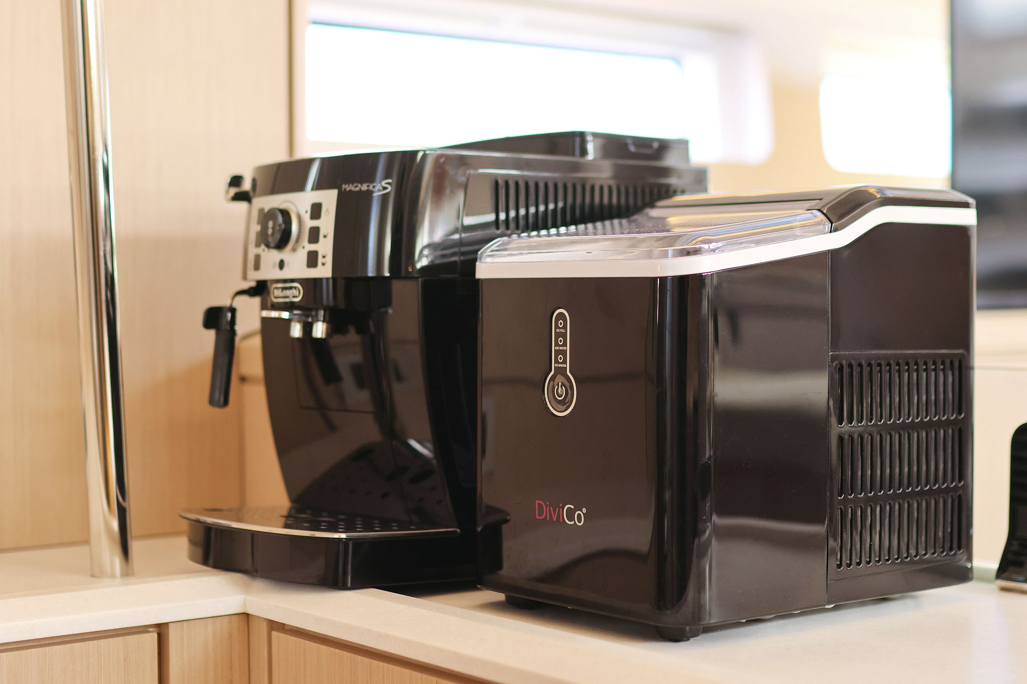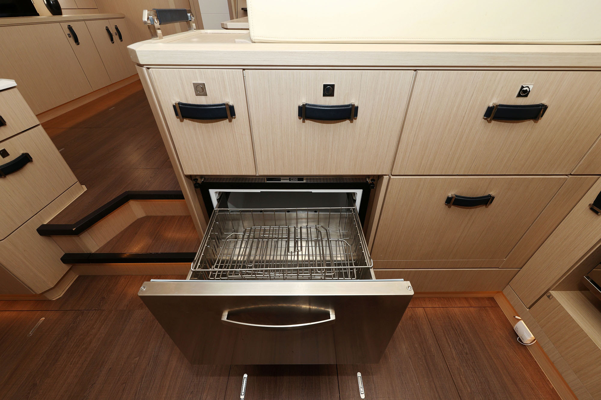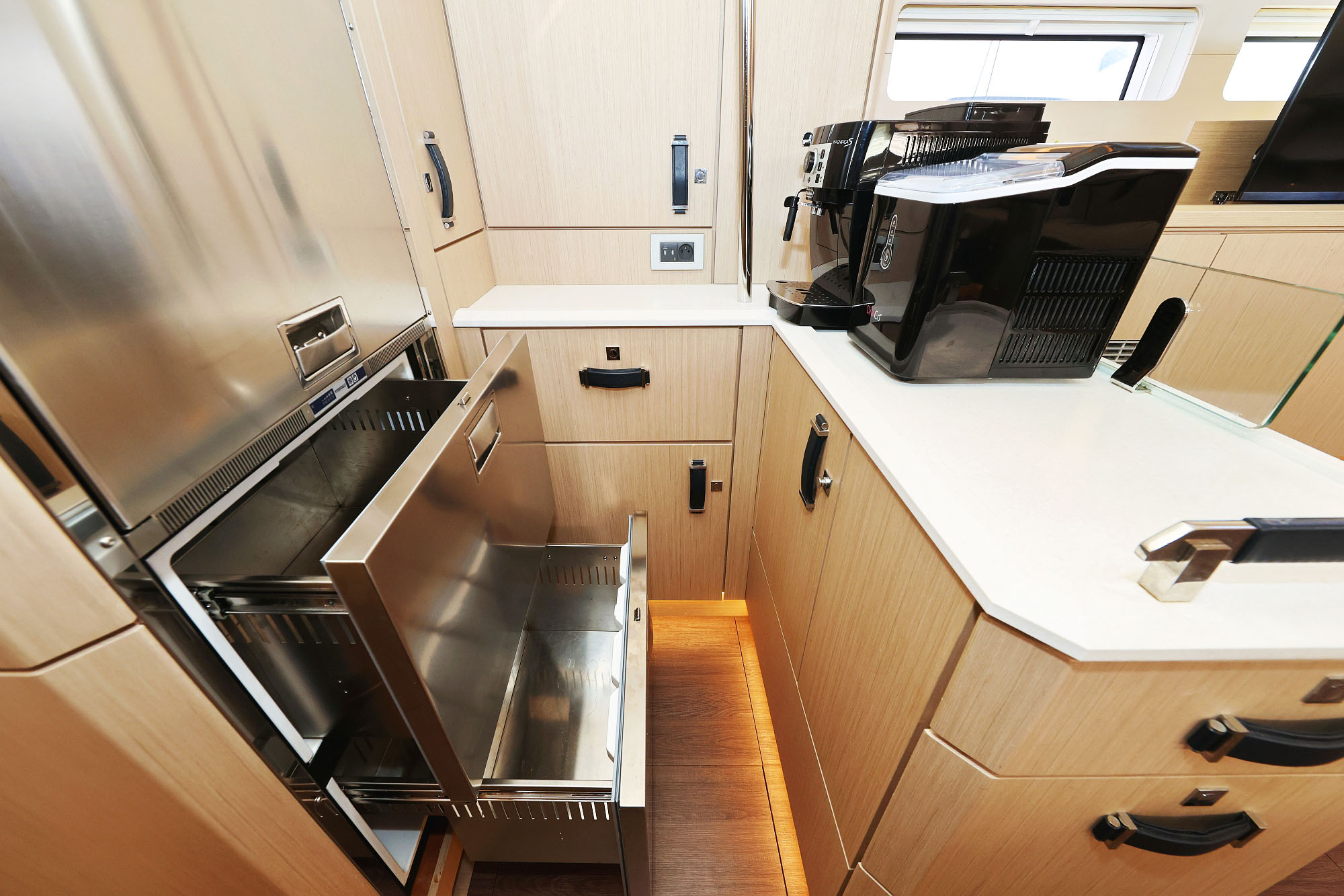 | Inside | 2. Kühlschrank, Backofen, Eiswürfelmaschine, Gasherd, Gefrierschrank, Generator, Geschirrspüler, Heizung, Inverter 12V/220V, Kaffeemaschine, Klimaanlage (ohne Landstrombedarf), Kühlschrank, Ladegerät, Lautsprecher im Salon, Pantryausstattung, Radio mit CD, TV, Warmwasser, Watermaker, WC (elektr.) |