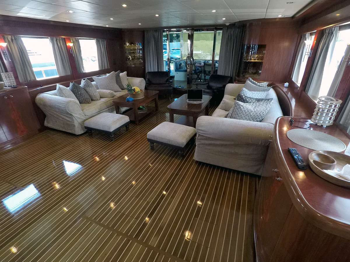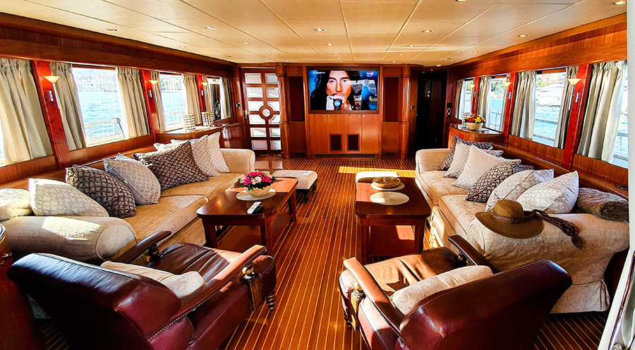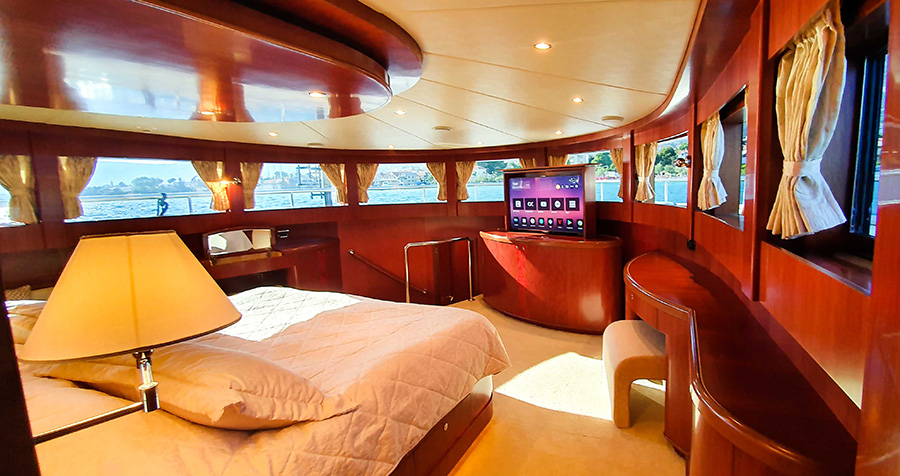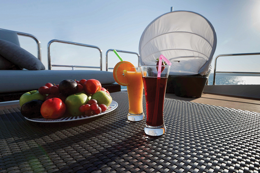 | Inside | Backofen, Eiswürfelmaschine, Gasherd, Generator, Heizung, Klimaanlage (ohne Landstrombedarf), Kühlschrank, Radio mit CD und USB, TV + DVD, Warmwasser, Watermaker |