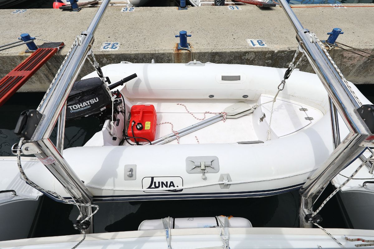 | Outside | 220 V-Landanschluss, Anker mit Kette, Ankerwinsch, Badeplattform, Benzinkanister, Biminitop, Bootshaken, Cockpitdusche, Cockpitkühlschrank, Cockpitlautsprecher, Cockpitpolster, Davits, elektr. Ankerwinsch, Fender, Festmacherleinen, Gangway, Kugelfender, Kunststoff-Eimer (Pütz), Solaranlage, Wantenschneider, Wasserkanister , Wasserschlauch, Windex |