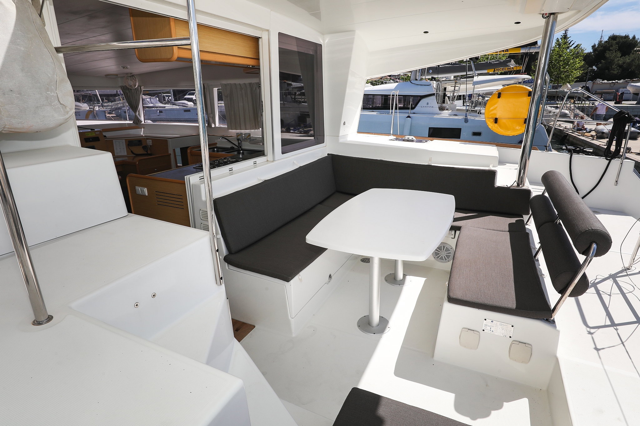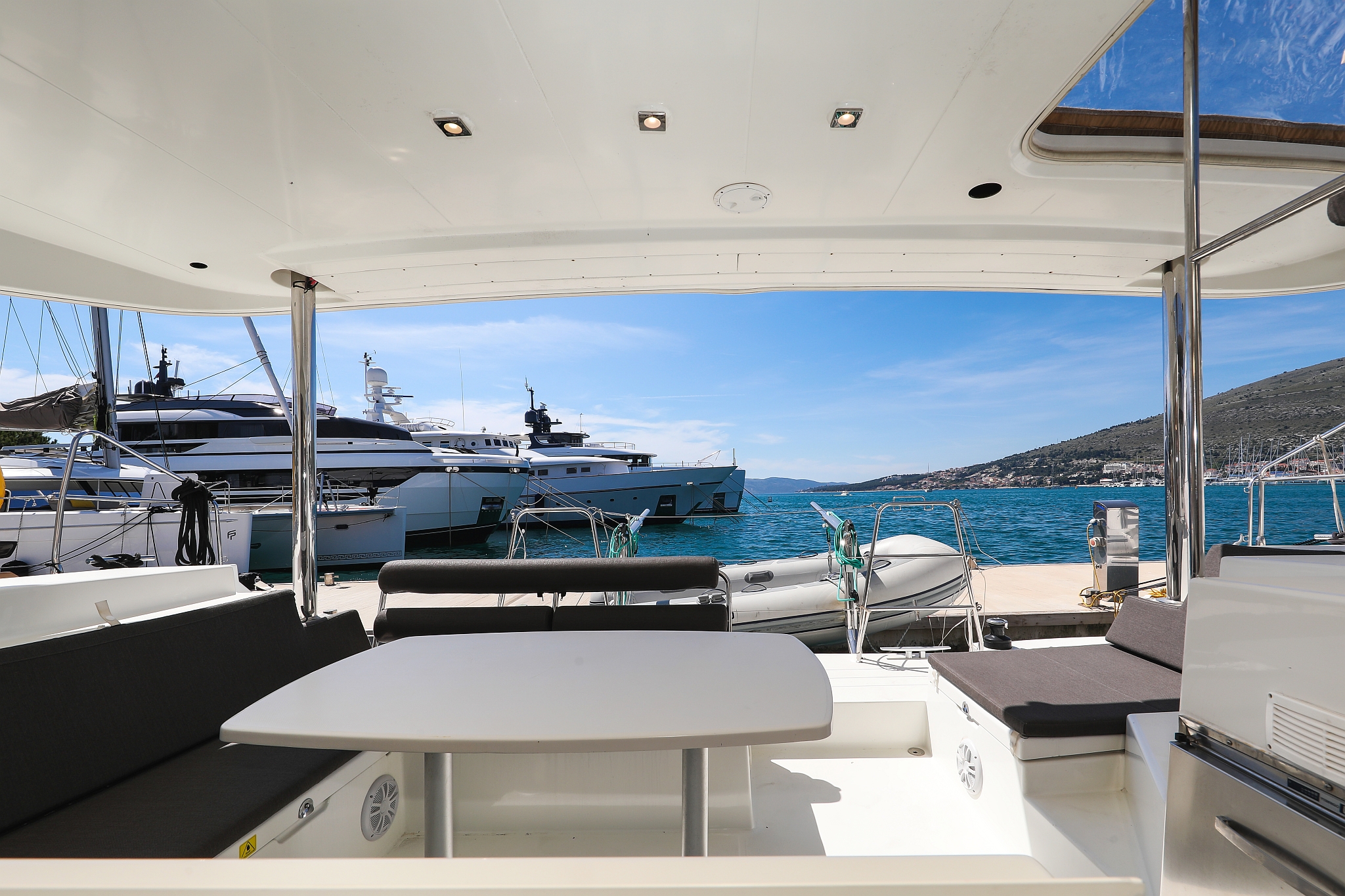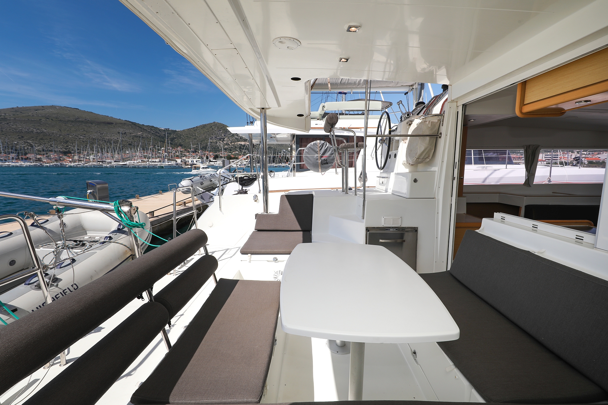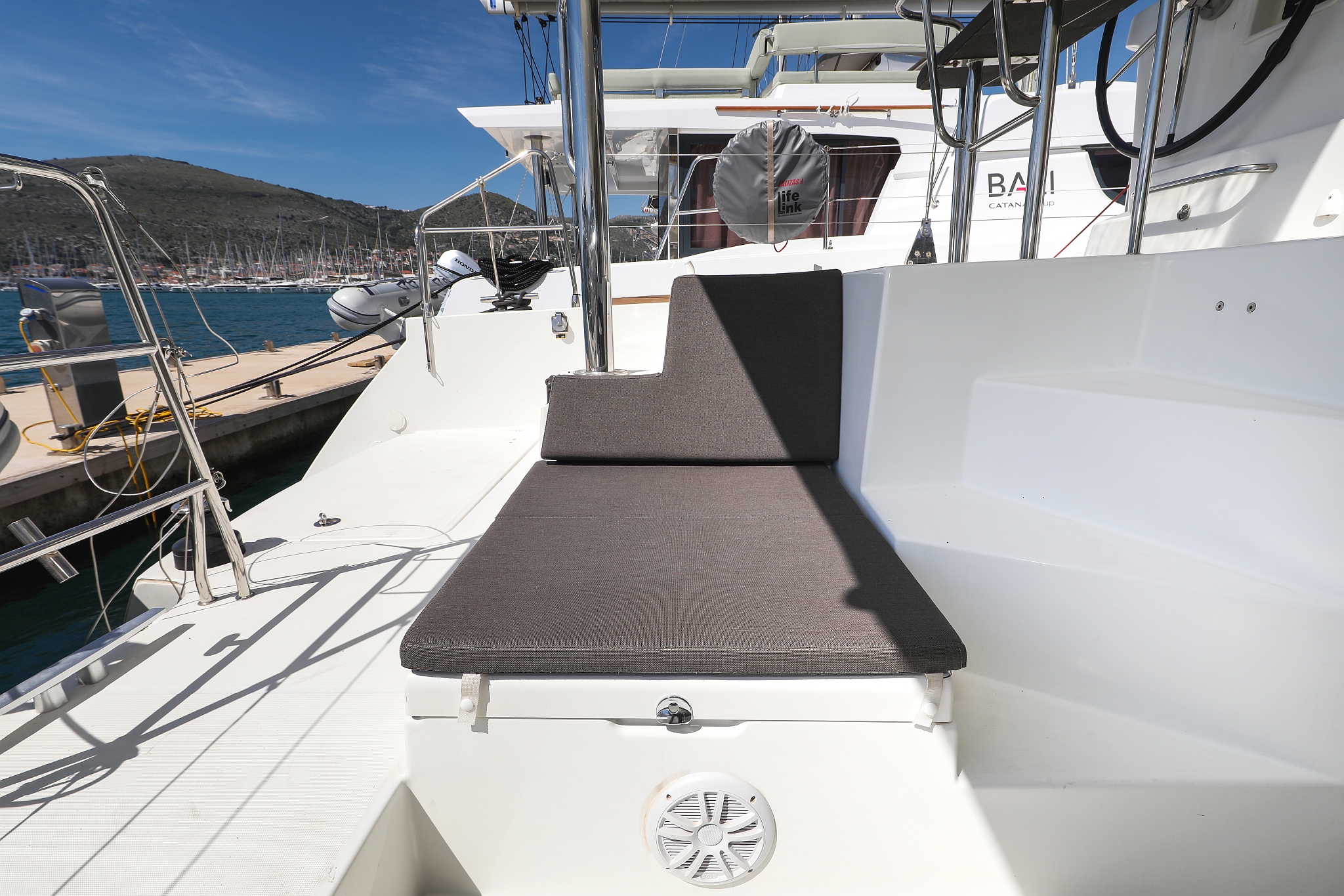 | Outside | 220 V-Landanschluss, Anker mit Kette, Cockpitdusche, Cockpitkühlschrank, Cockpitlautsprecher, Cockpitpolster, Cockpittisch, elektr. Ankerwinsch, Fender, Gangway, Hardtop, Kugelfender, Solaranlage, Winschen |