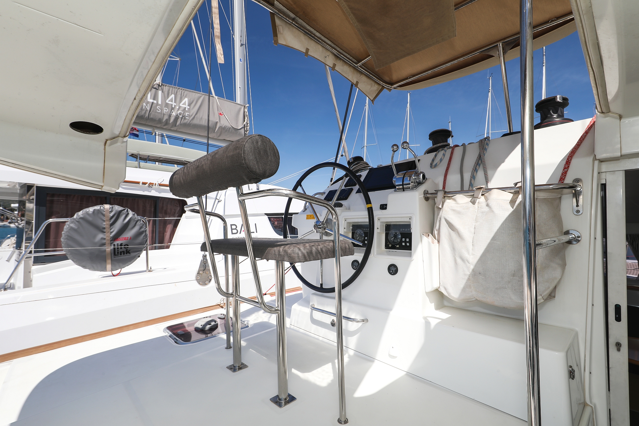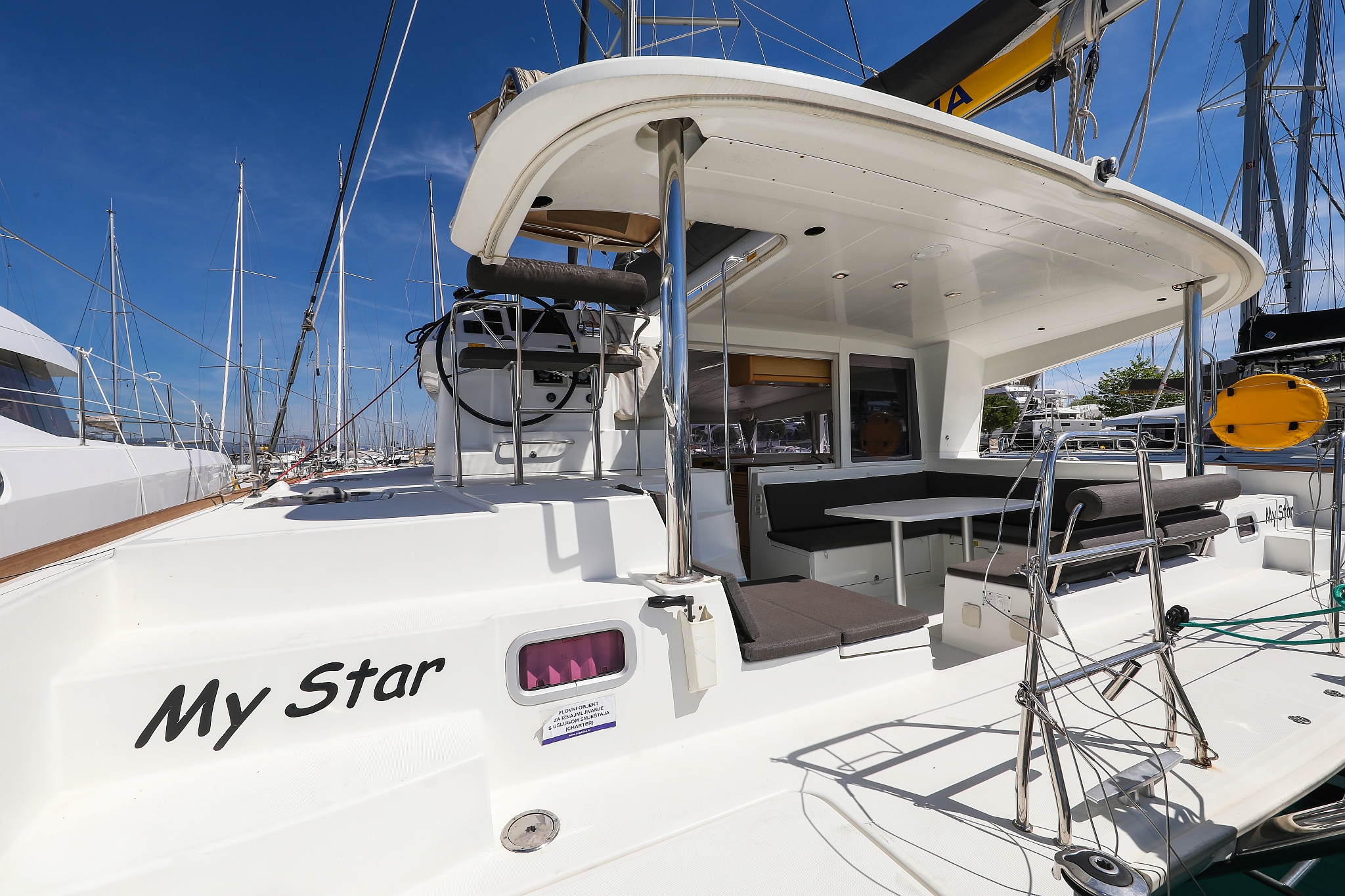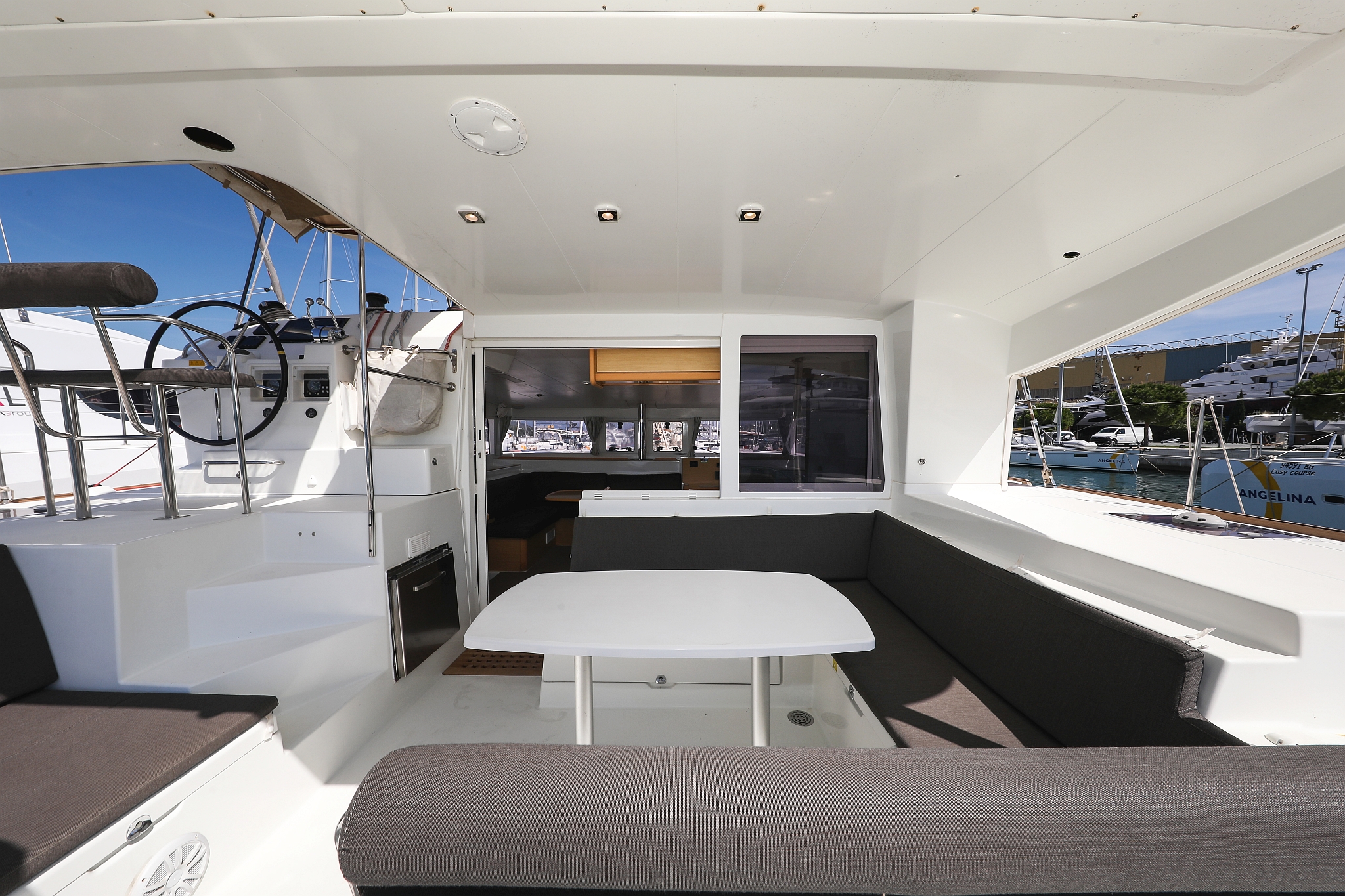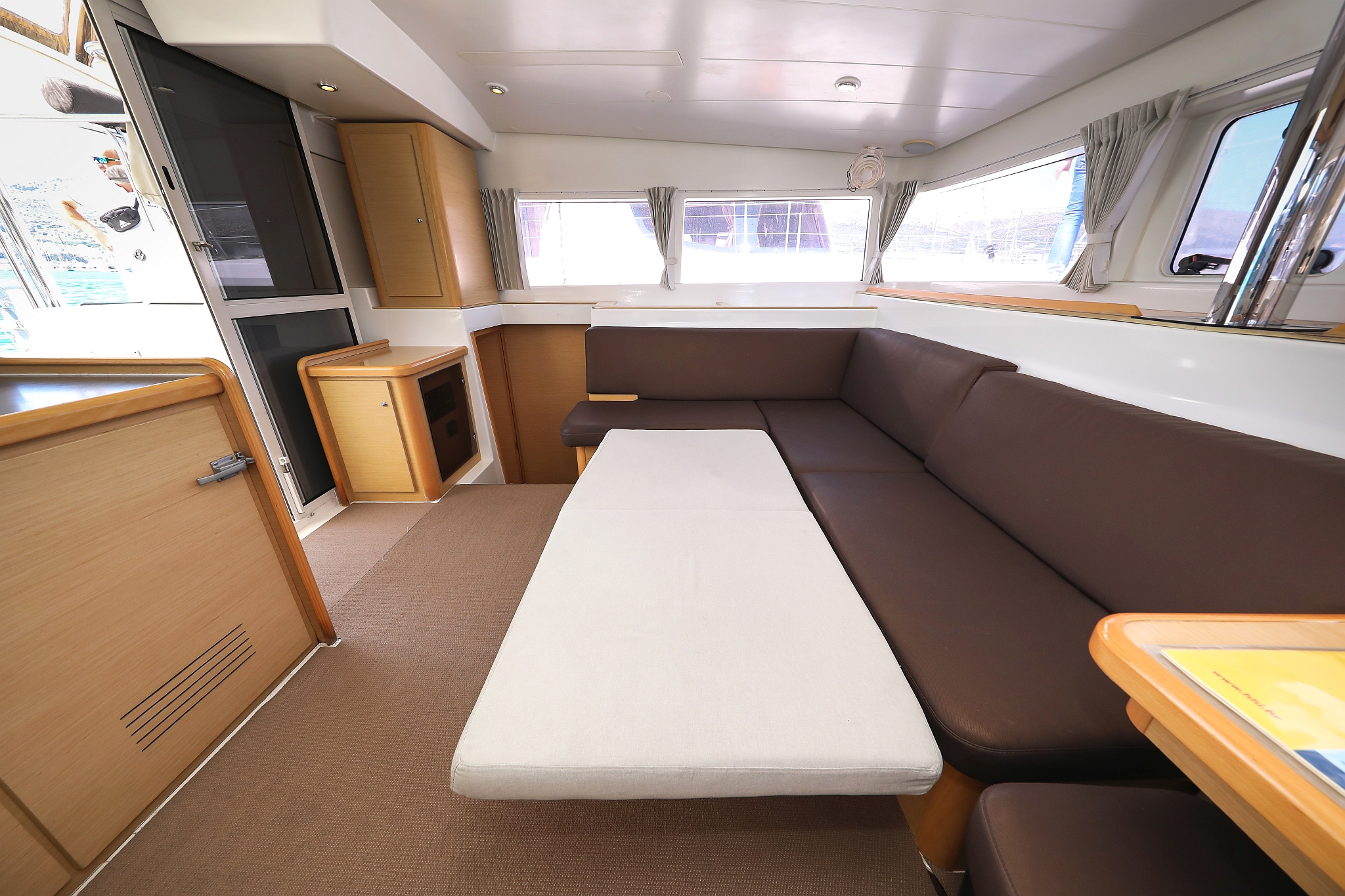 | Outside | 220 V-Landanschluss, Anker mit Kette, Cockpitdusche, Cockpitkühlschrank, Cockpitlautsprecher, Cockpitpolster, Cockpittisch, elektr. Ankerwinsch, Fender, Gangway, Hardtop, Kugelfender, Solaranlage, Winschen |