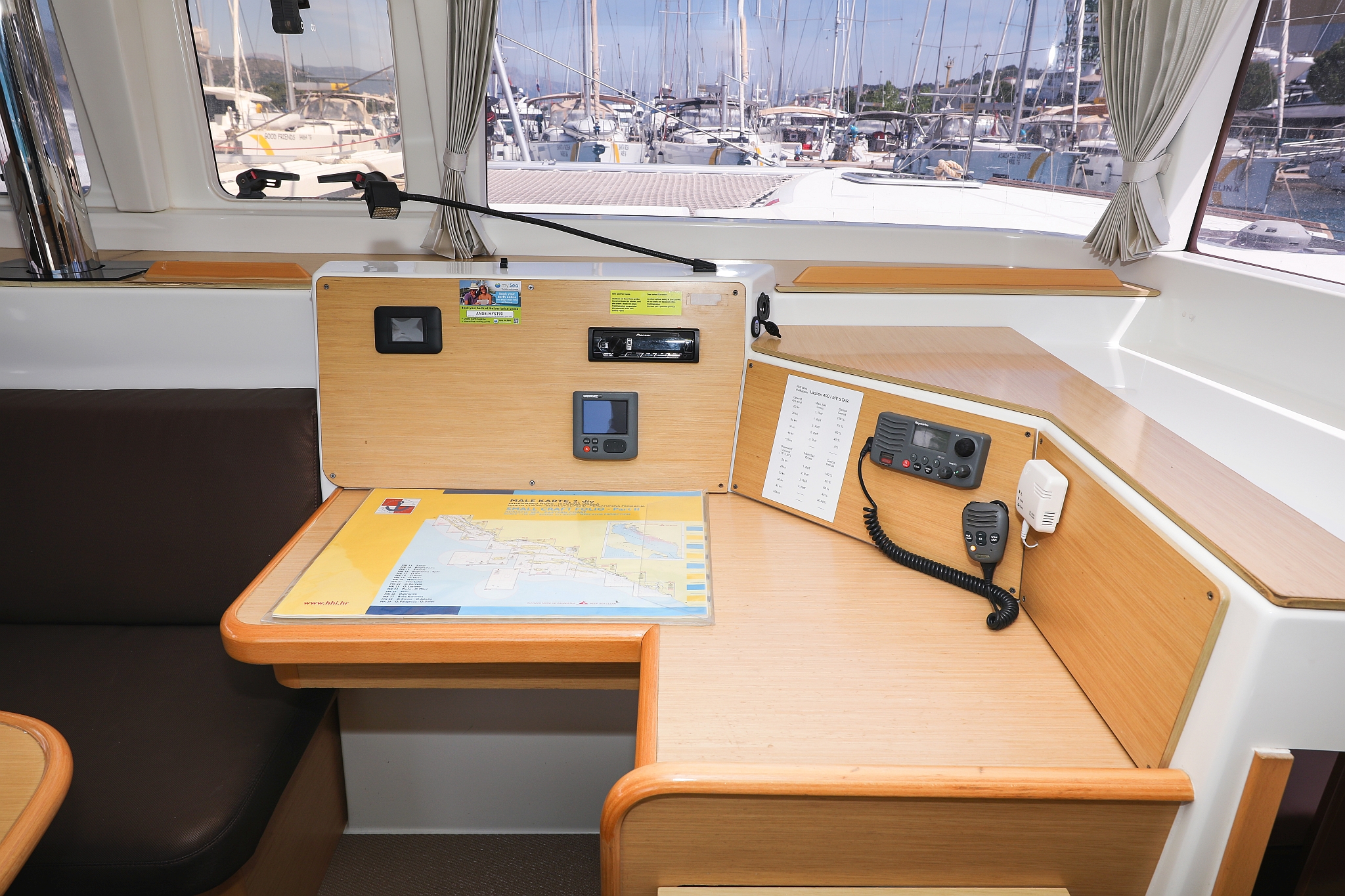 | Navigation | Fernglas, GPS mit Kartenplotter im Cockpit, Hafenhandbücher, Kompass, Seekarten, Tridata (Log, Echolot, Windm.), Windmesser |